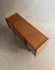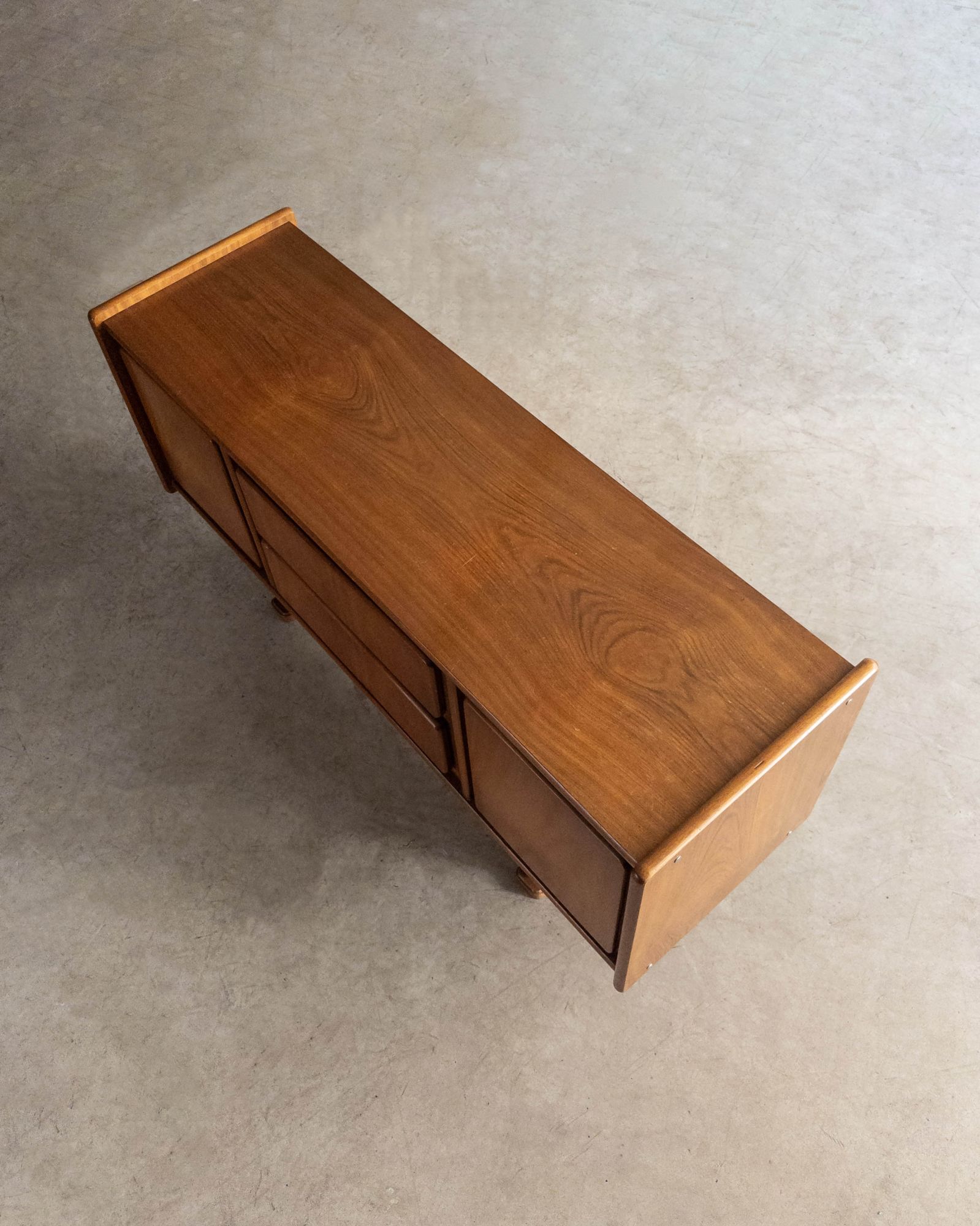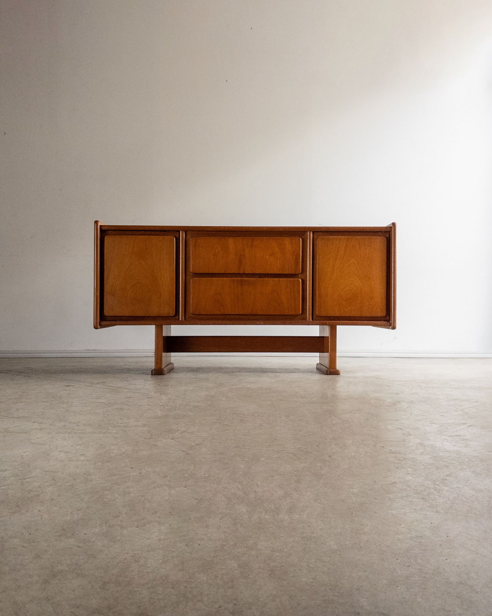 As portas laterais e as gavetas centrais criam um ritmo visual interessante, alternando cheios e vazios com precisão. O desenho levemente elevado, apoiado por base robusta, confere leveza ao conjunto sem perder a força característica do brutalismo.