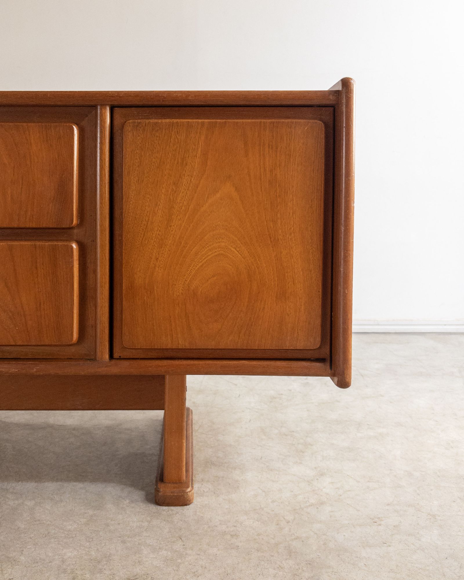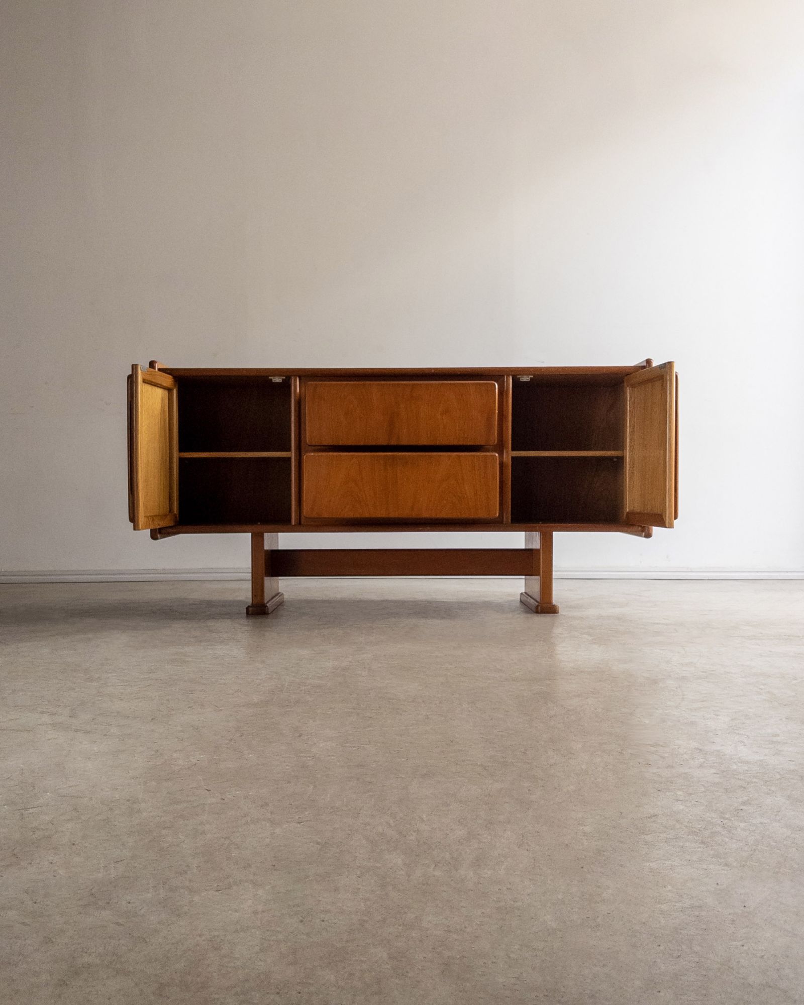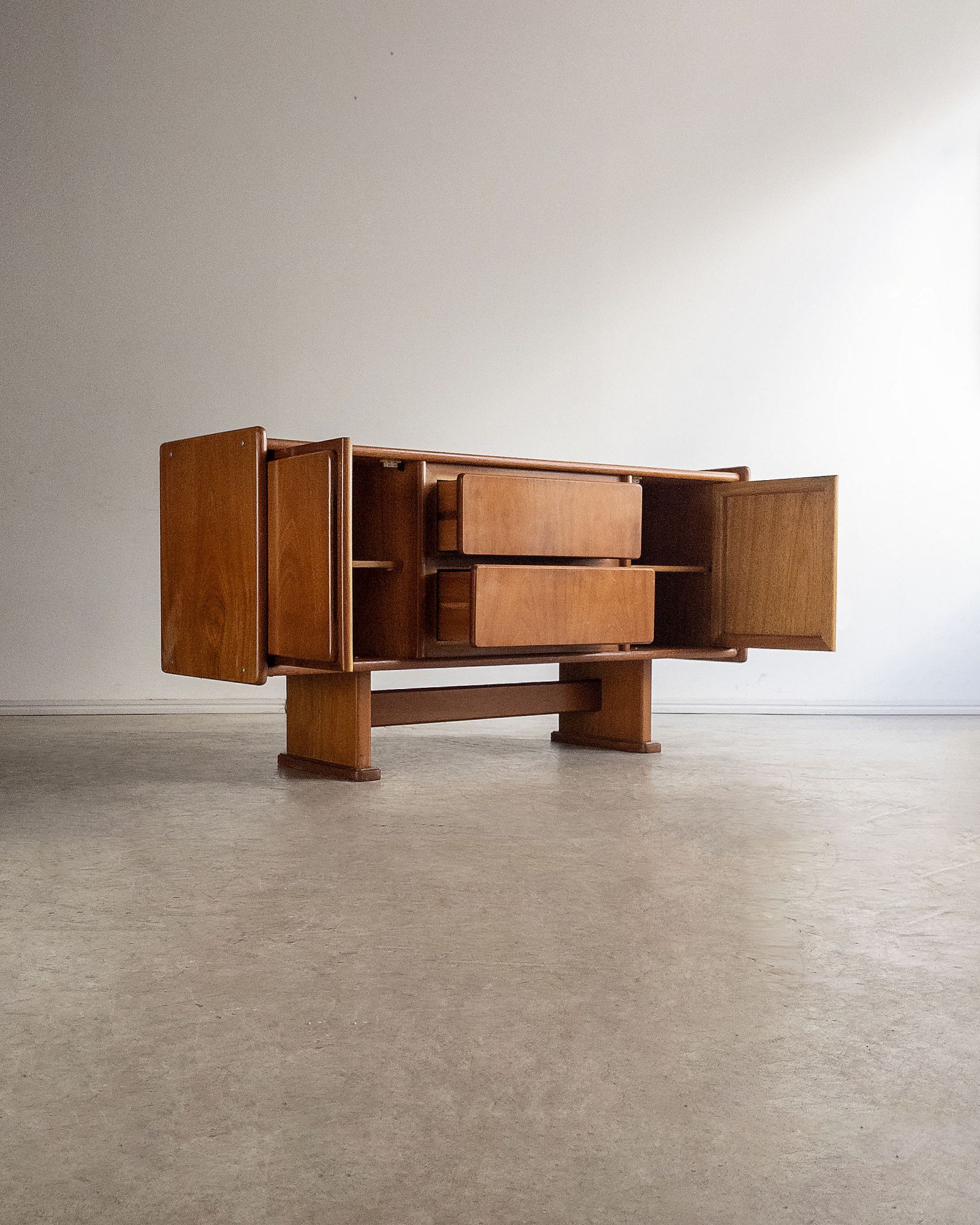 Aparador brutalista da década de 70 que se impõe pela presença sólida e pelo desenho direto, sem excessos. A estrutura em madeira maciça revela um trabalho cuidadoso de marcenaria, com volumes bem definidos e proporções equilibradas, onde cada plano parece pensado para valorizar a materialidade da peça.