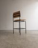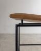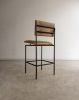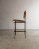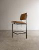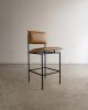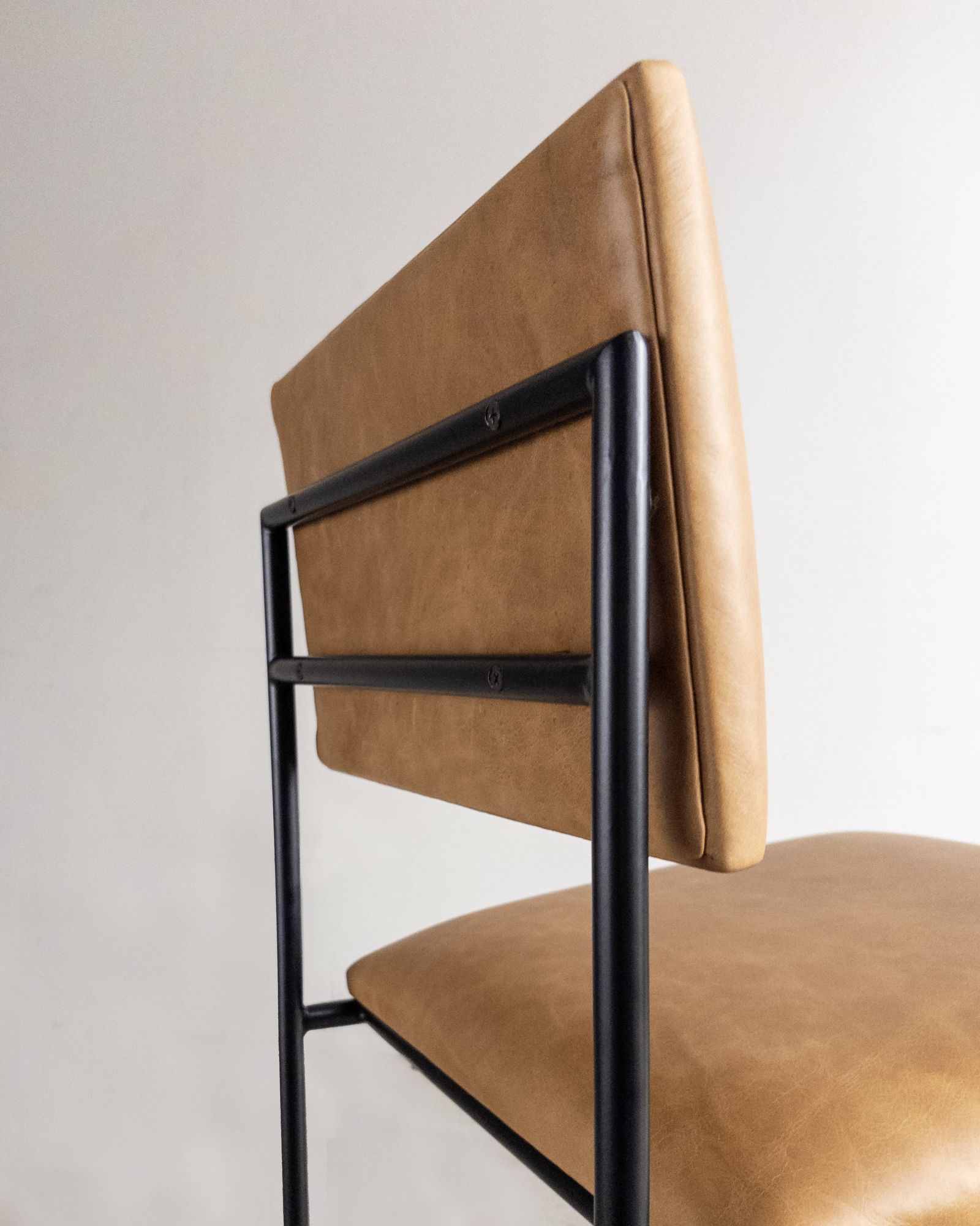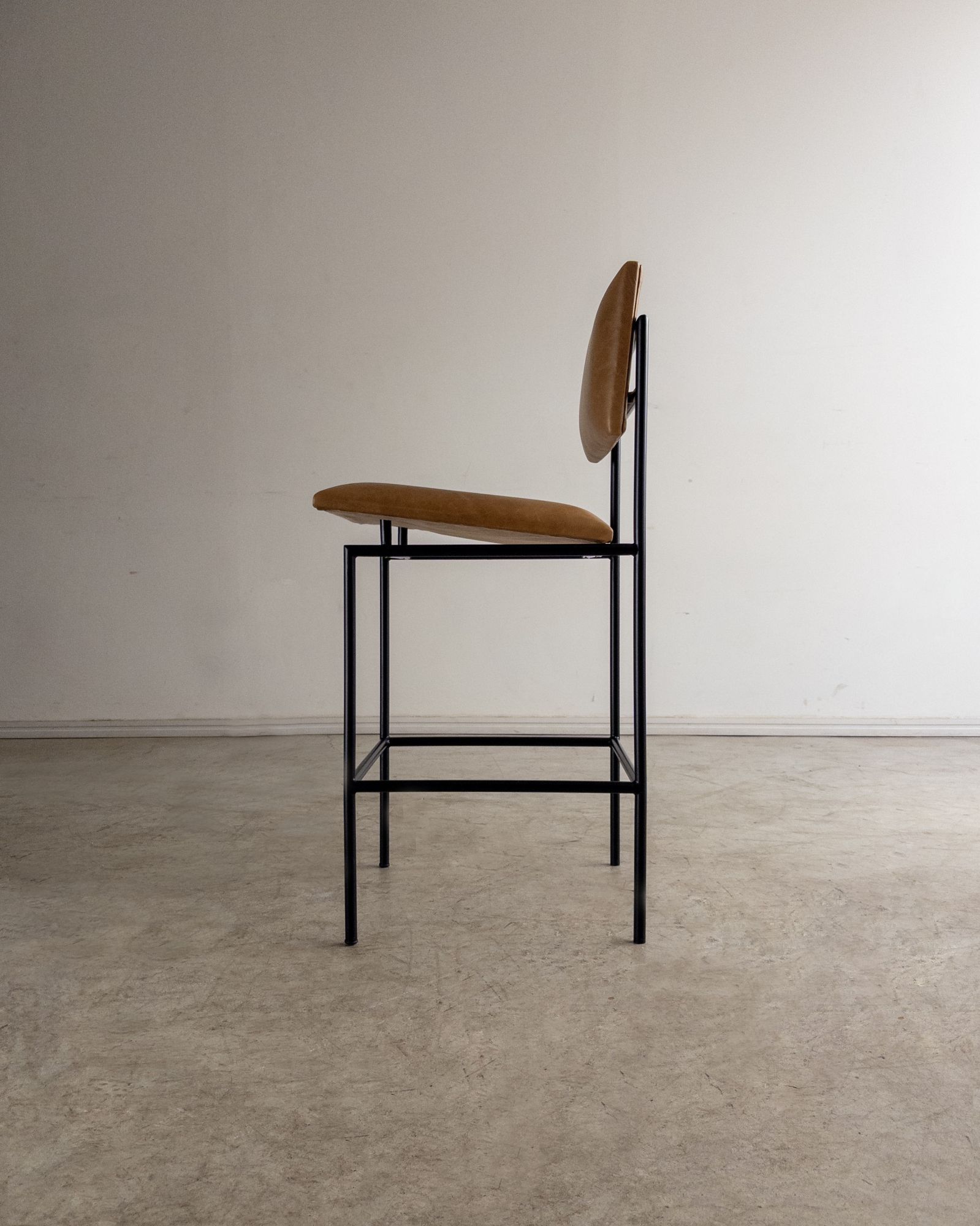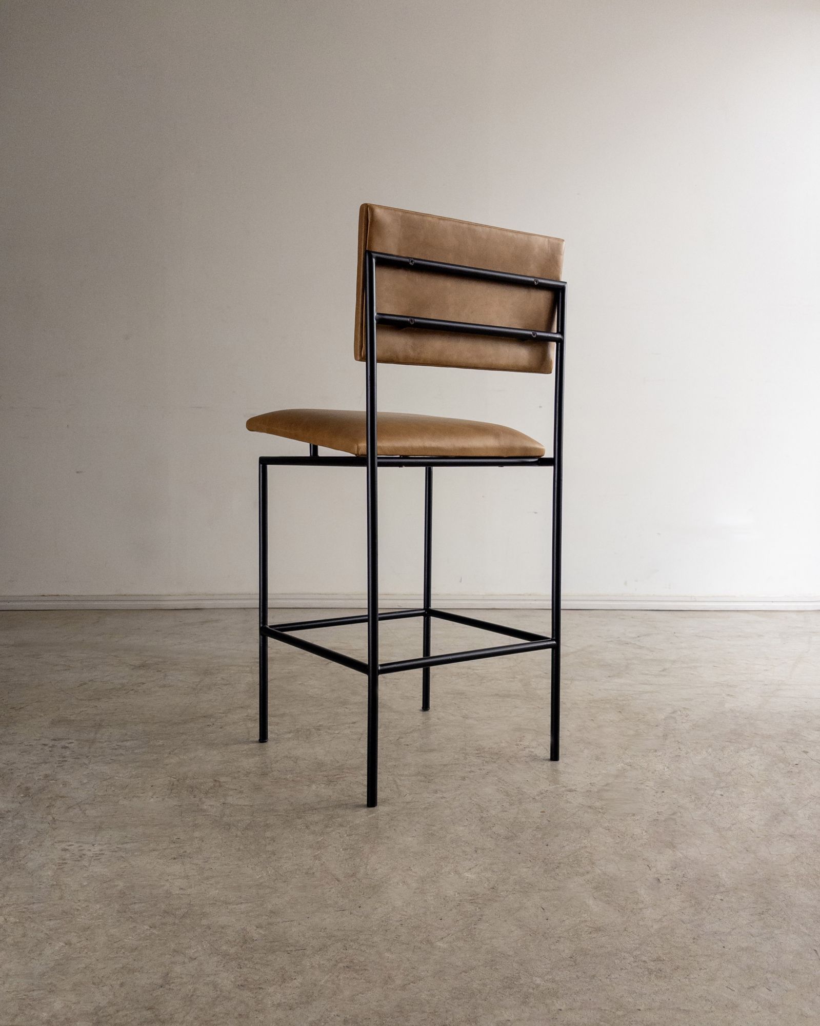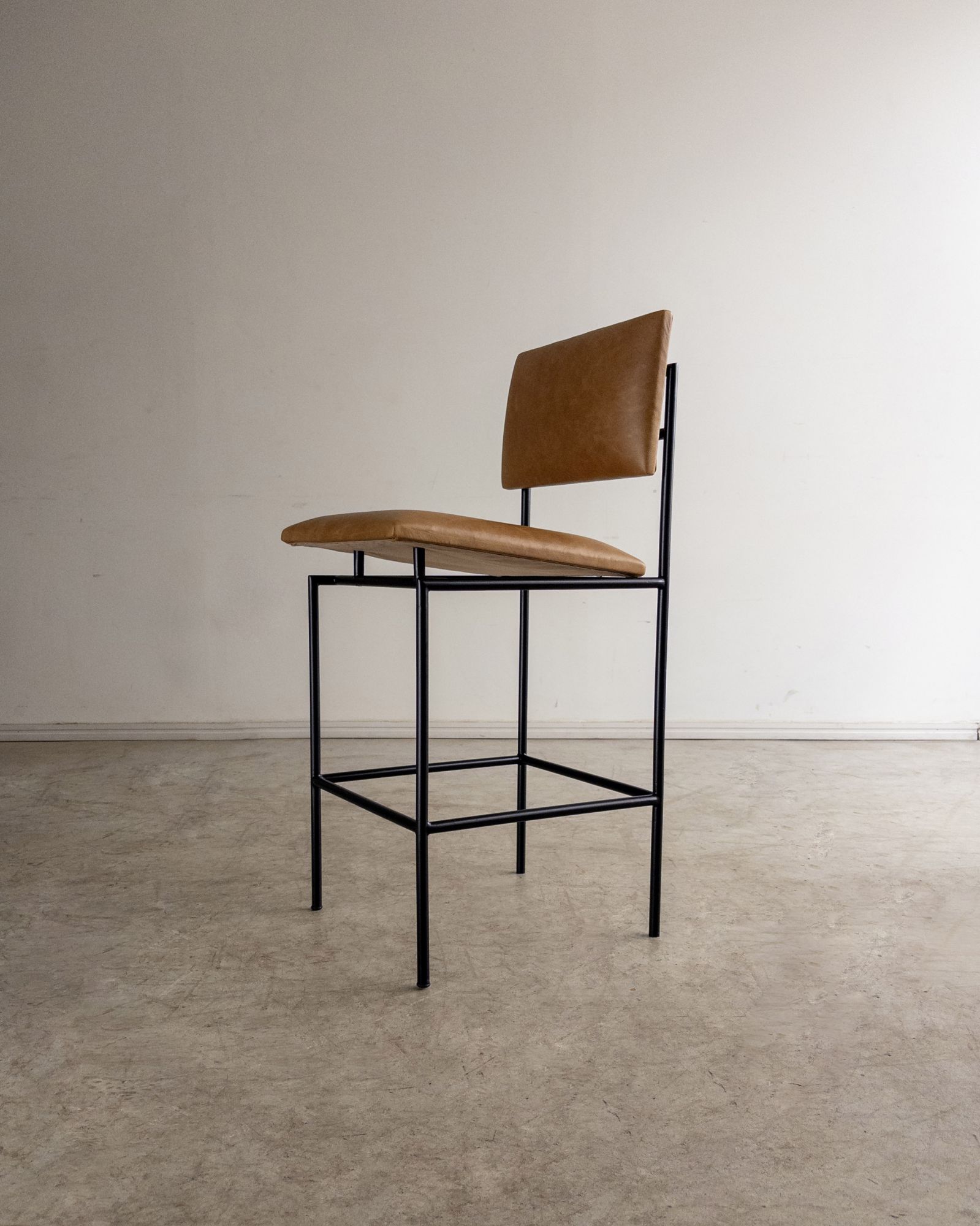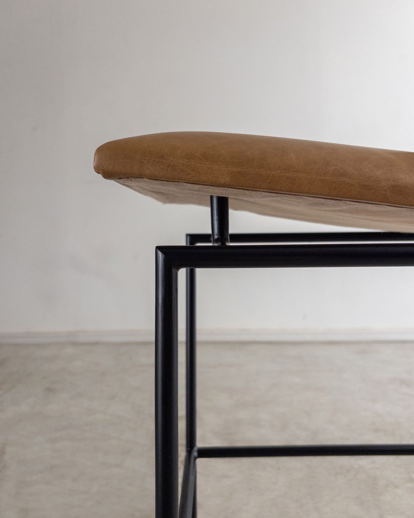 Banqueta alta com estrutura em ferro e assento e encosto em couro natural. O desenho privilegia linhas simples e robustas, com leitura industrial e proporções adequadas para bancadas ou bares. Pode apresentar leves marcas do tempo.