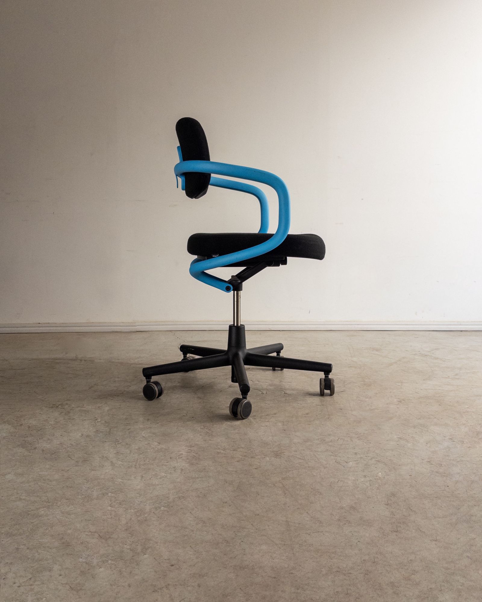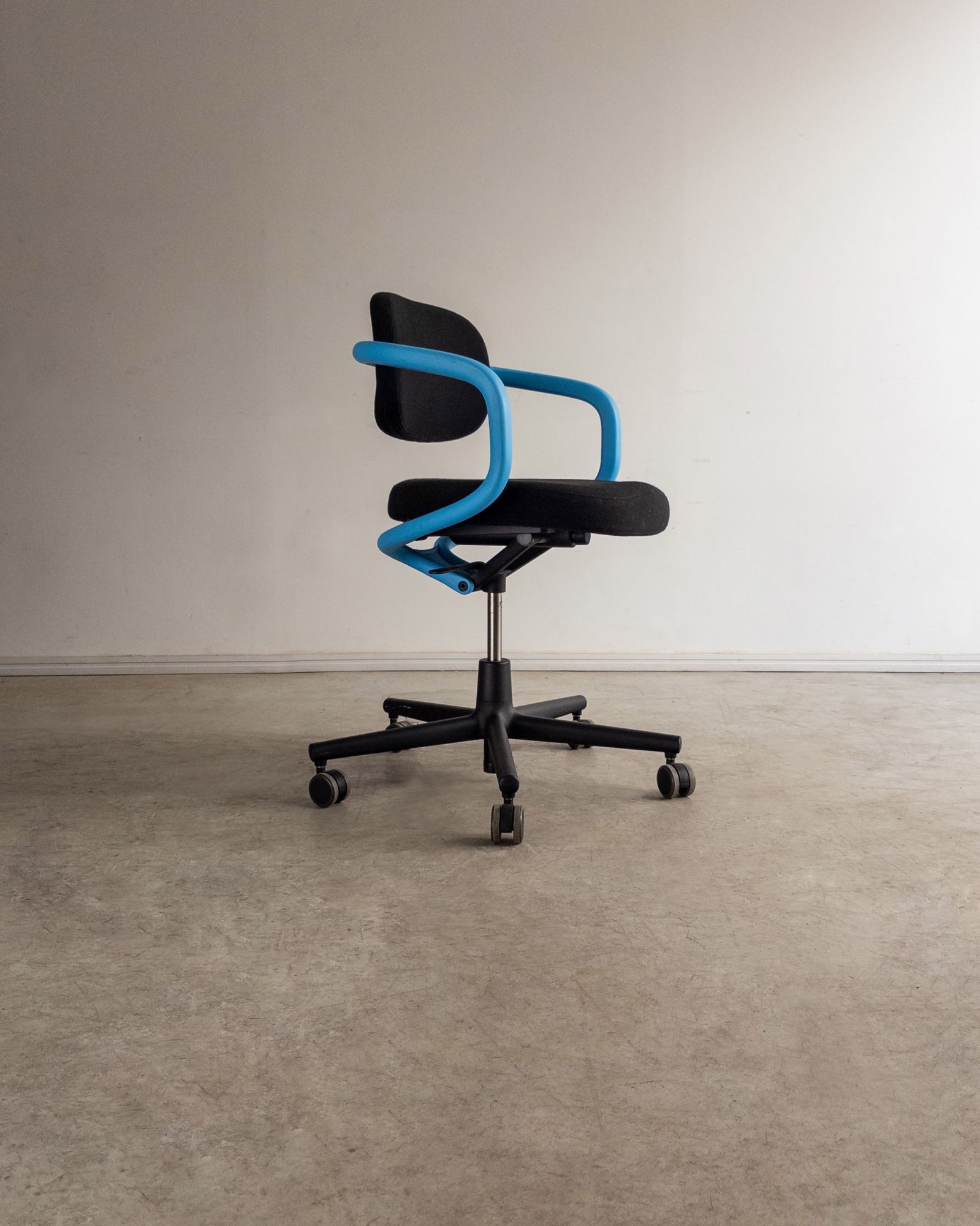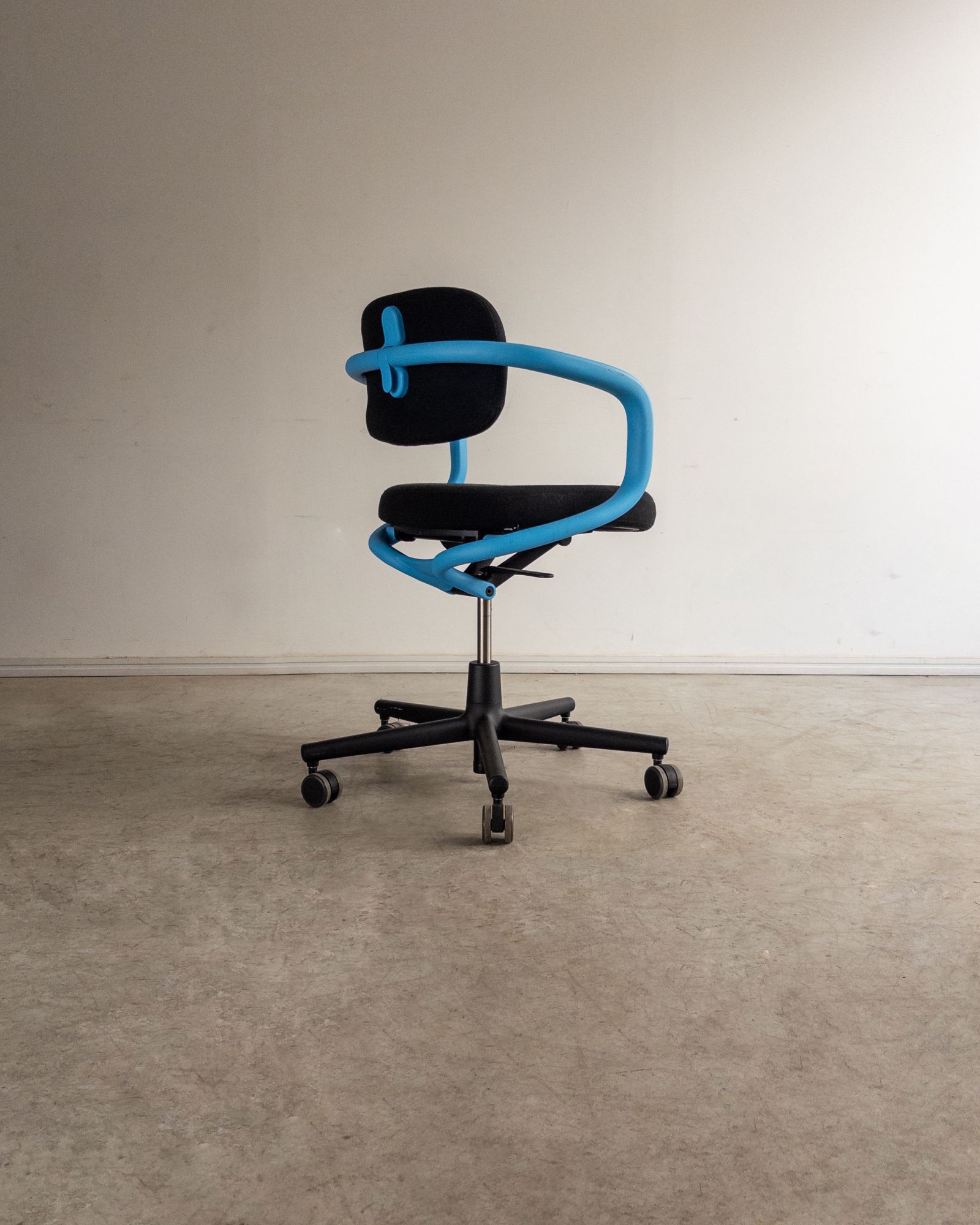 Cadeira de escritório com encosto e assento em poliamida, estofados com espuma reciclável V-Foam, e estrutura tubular contínua que integra braços e apoio das costas. Edição de época produzida pela Vitra, com desenho orgânico e caráter lúdico característico do designer. Pode apresentar leves marcas do tempo.