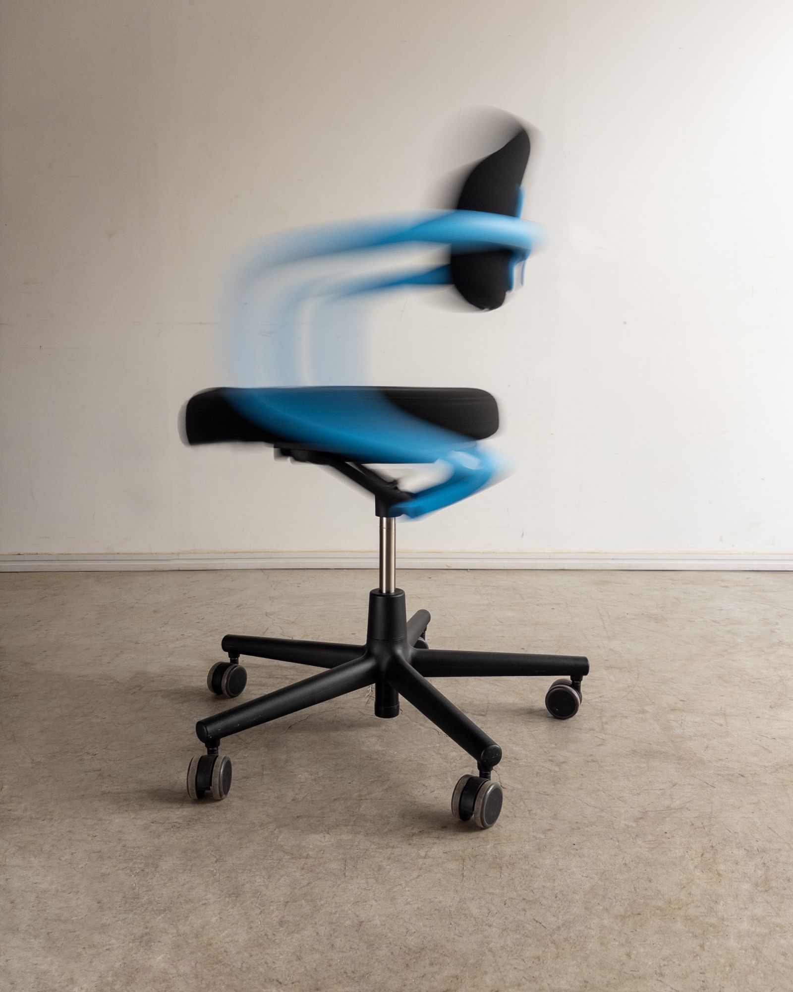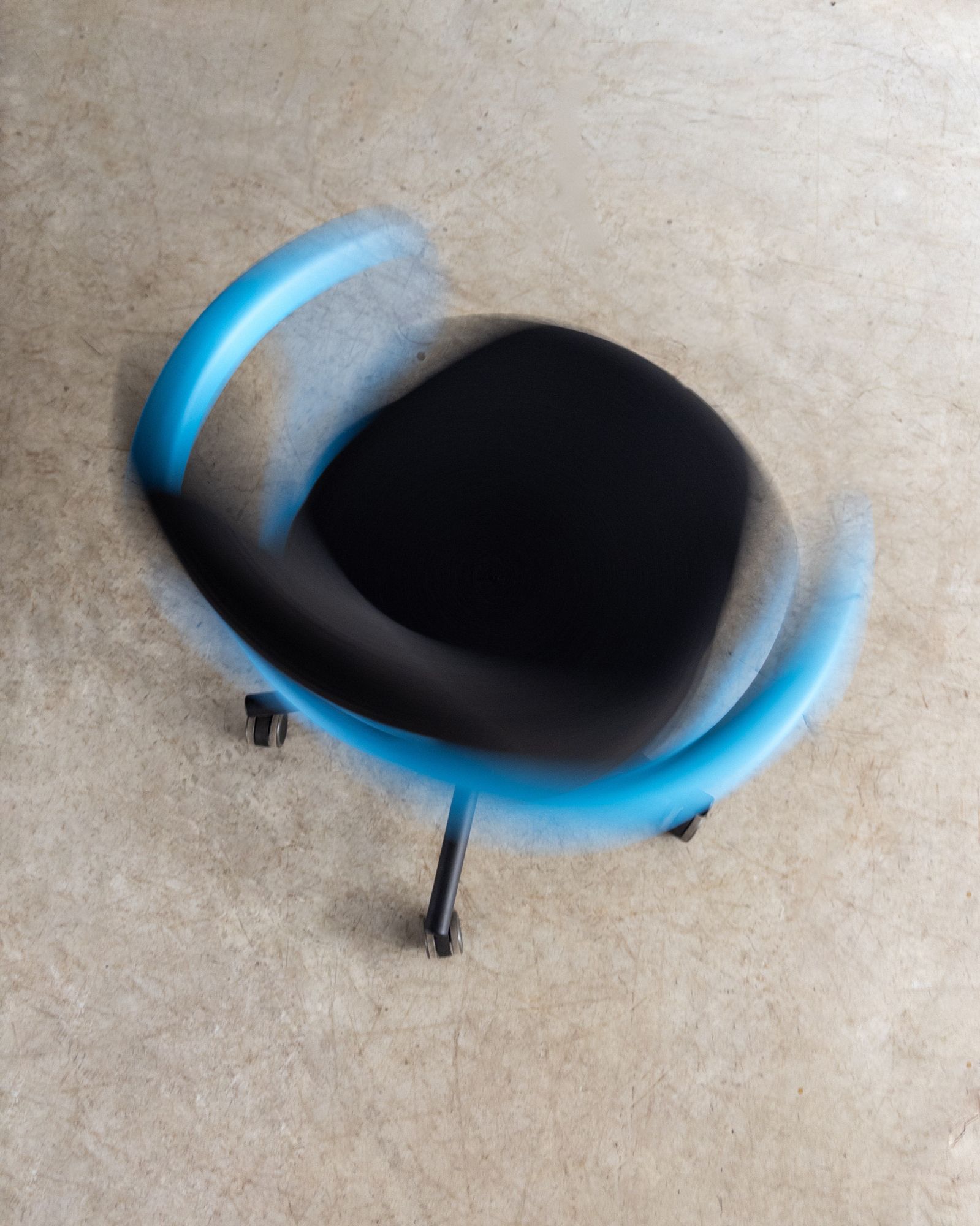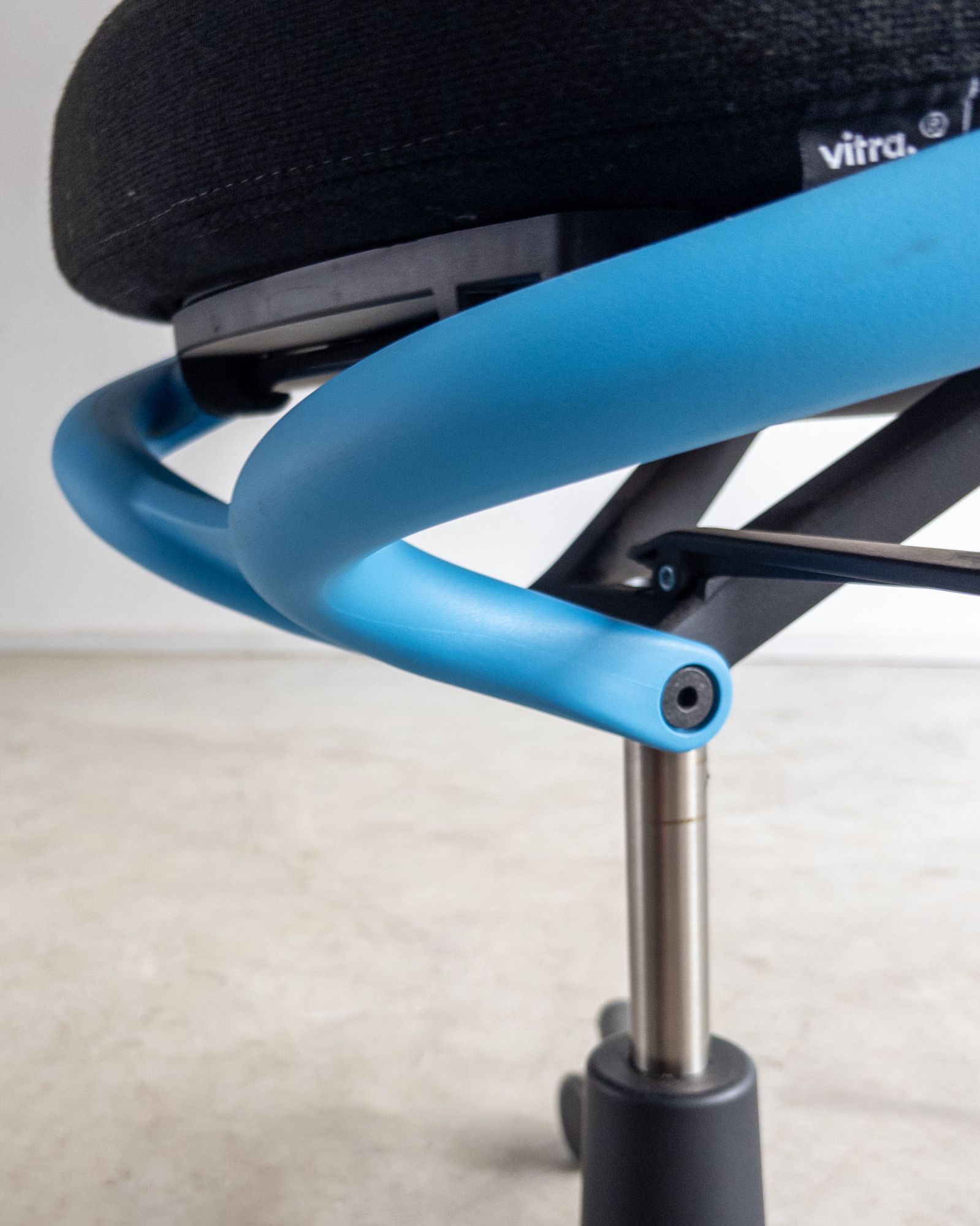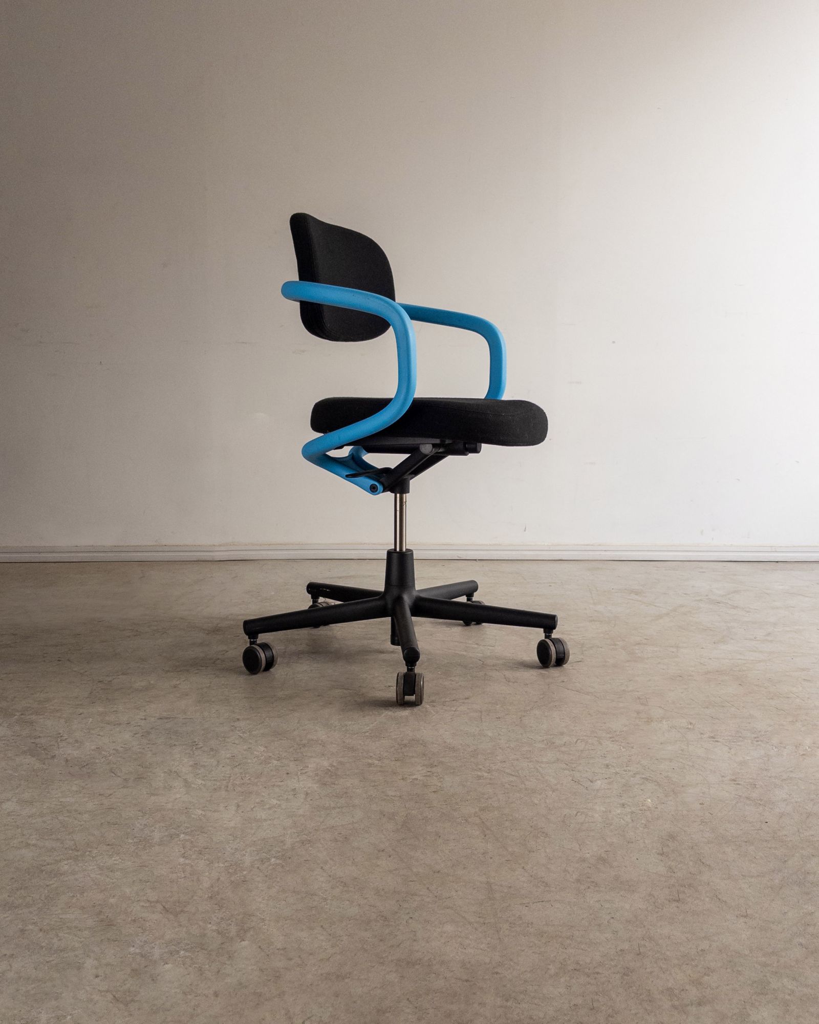 Cadeira de escritório com encosto e assento em poliamida, estofados com espuma reciclável V-Foam, e estrutura tubular contínua que integra braços e apoio das costas. Edição de época produzida pela Vitra, com desenho orgânico e caráter lúdico característico do designer. Pode apresentar leves marcas do tempo.