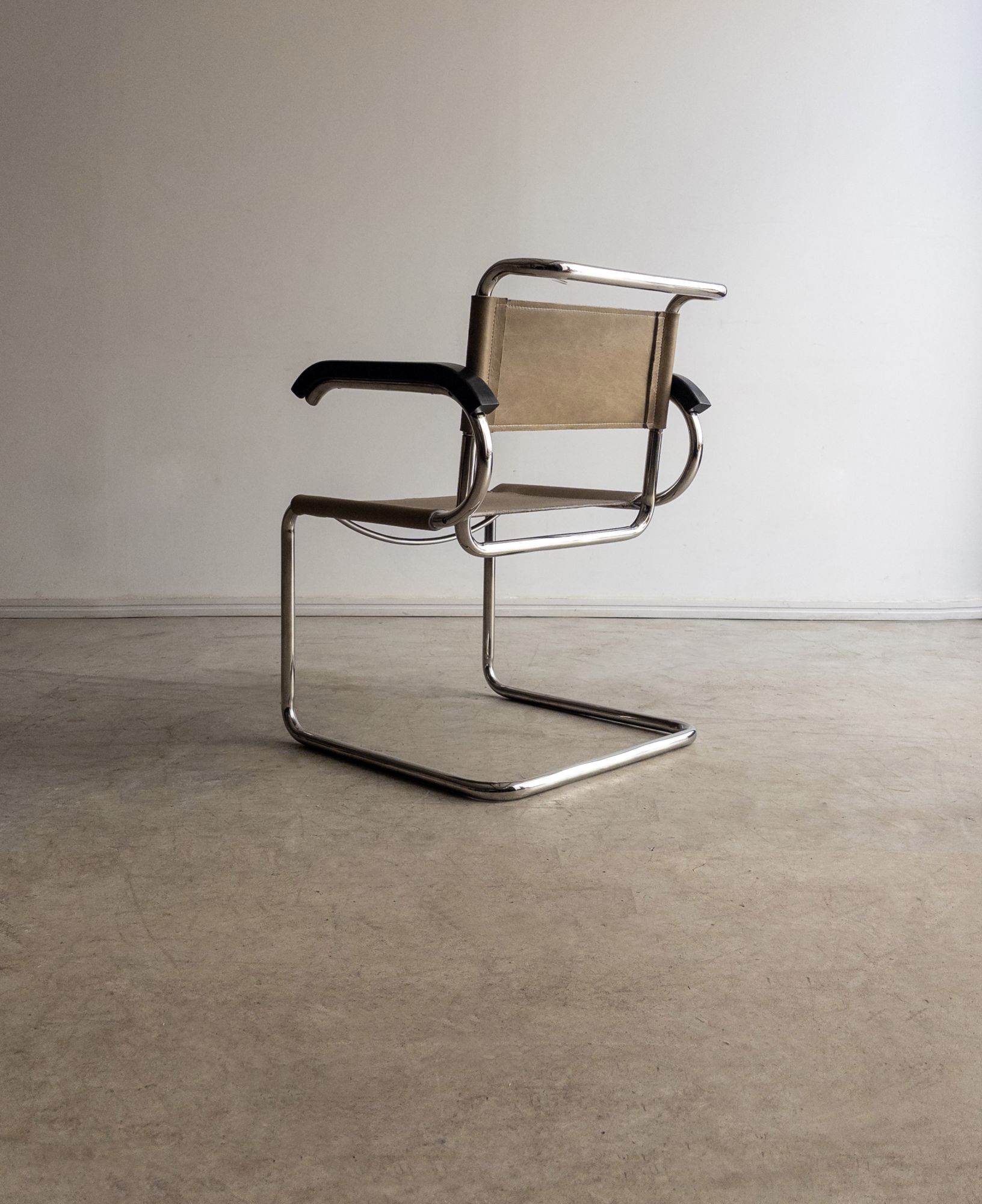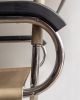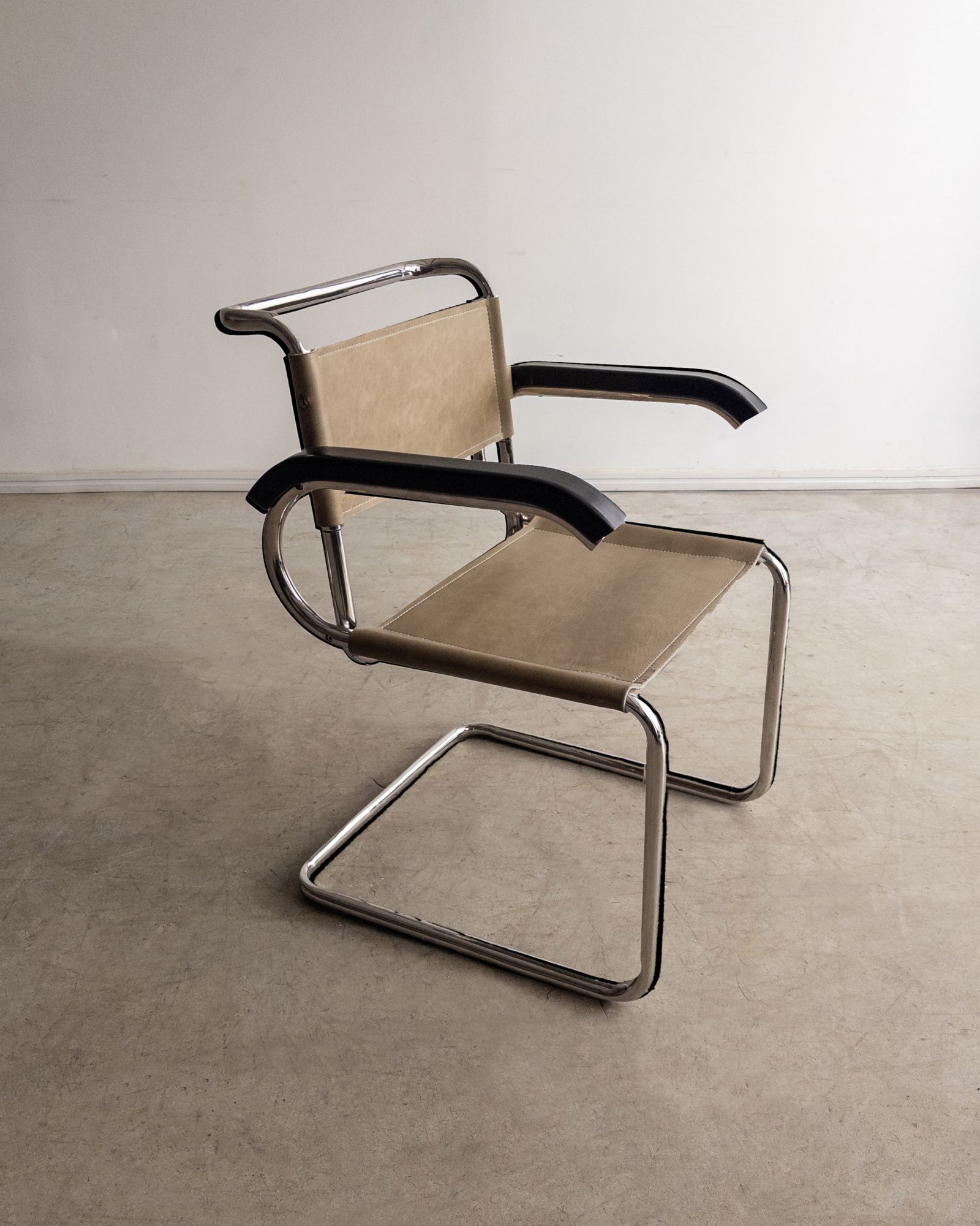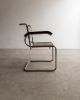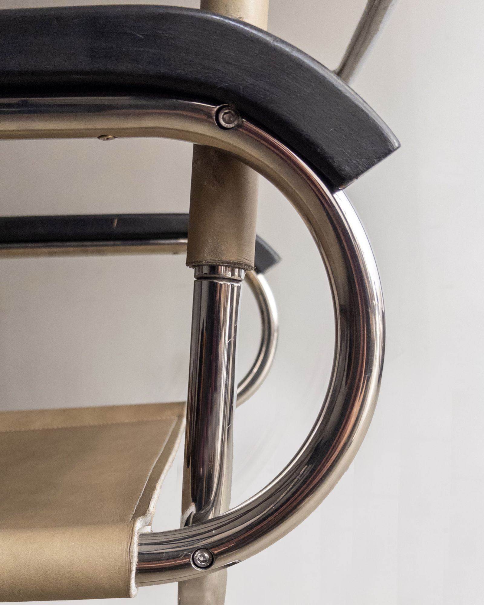 Cadeira modernista com estrutura em aço tubular cromado, braços em madeira e assento em couro soleta natural. Um exemplo marcante da estética Bauhaus, combinando leveza estrutural e funcionalidade. Pode apresentar leves marcas do tempo.