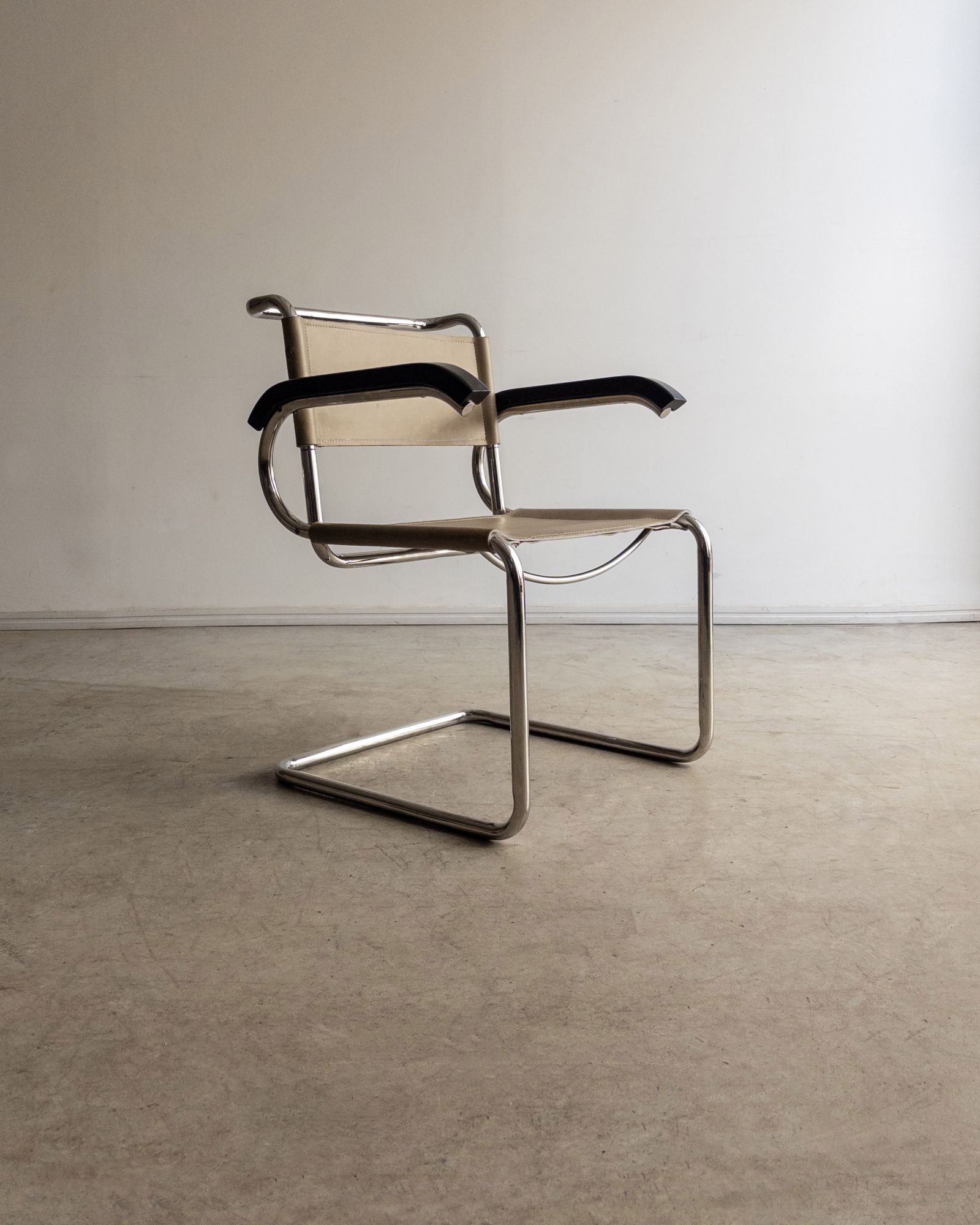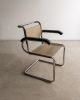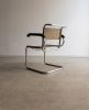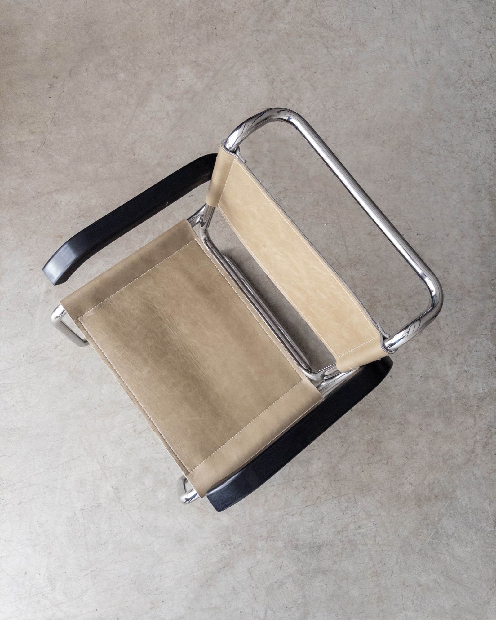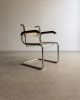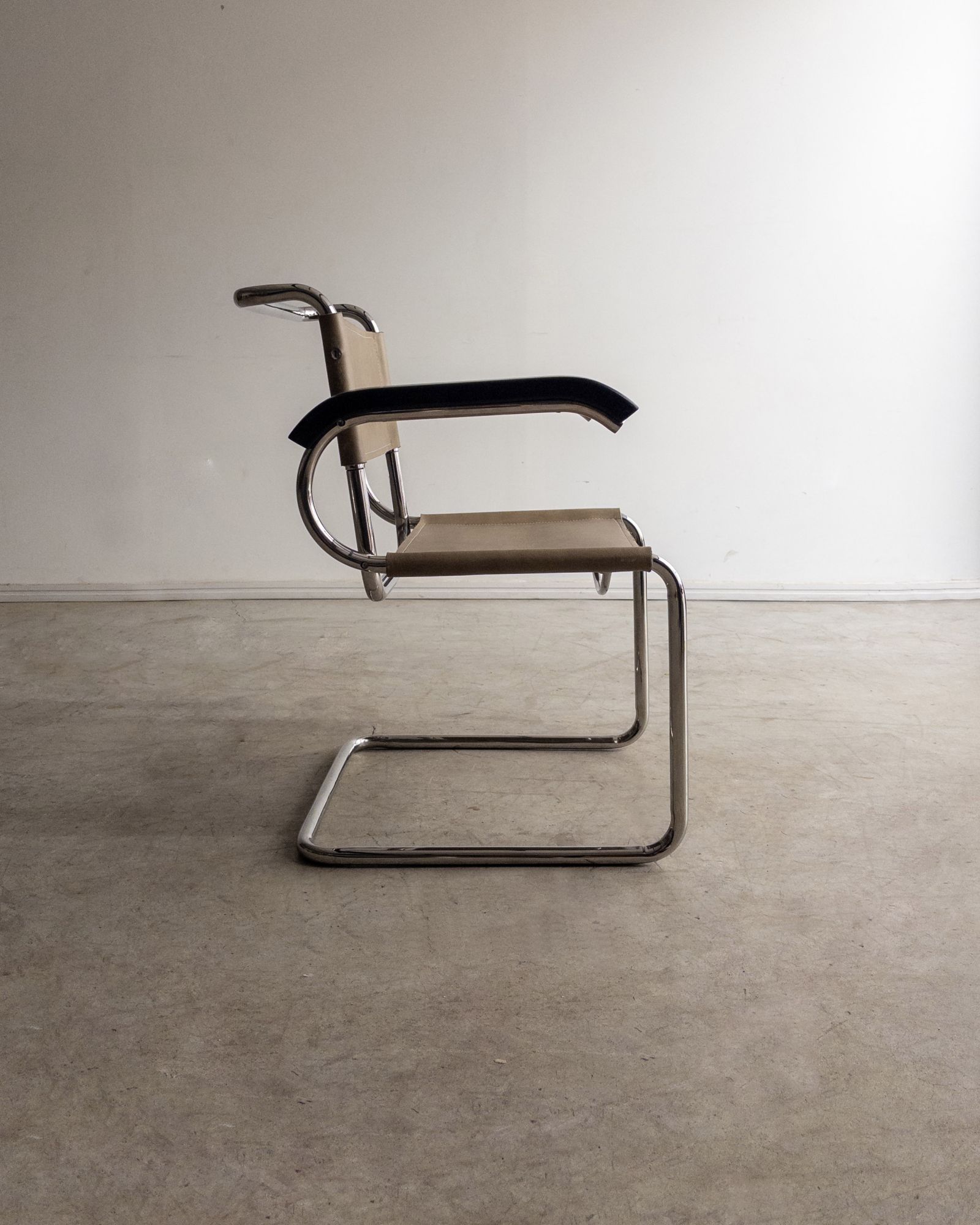 Cadeira modernista com estrutura em aço tubular cromado, braços em madeira e assento em couro soleta natural. Um exemplo marcante da estética Bauhaus, combinando leveza estrutural e funcionalidade. Pode apresentar leves marcas do tempo.