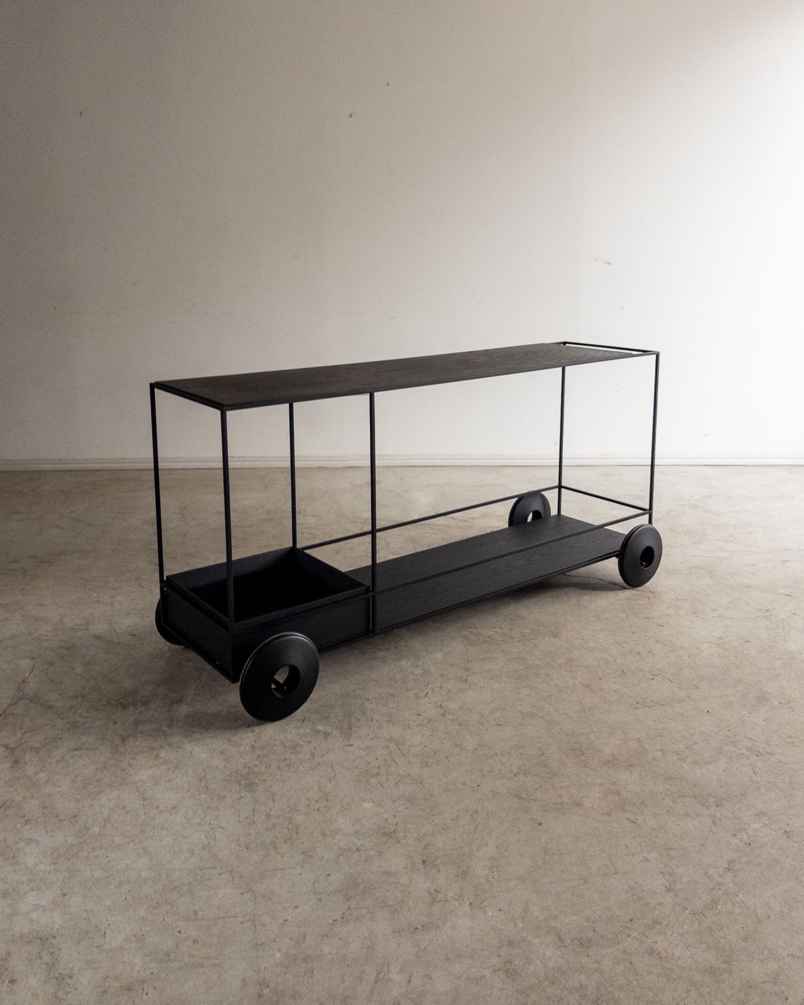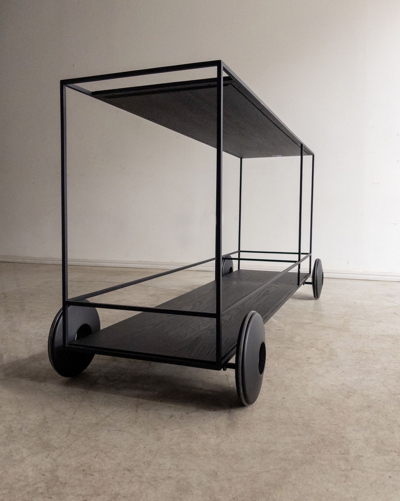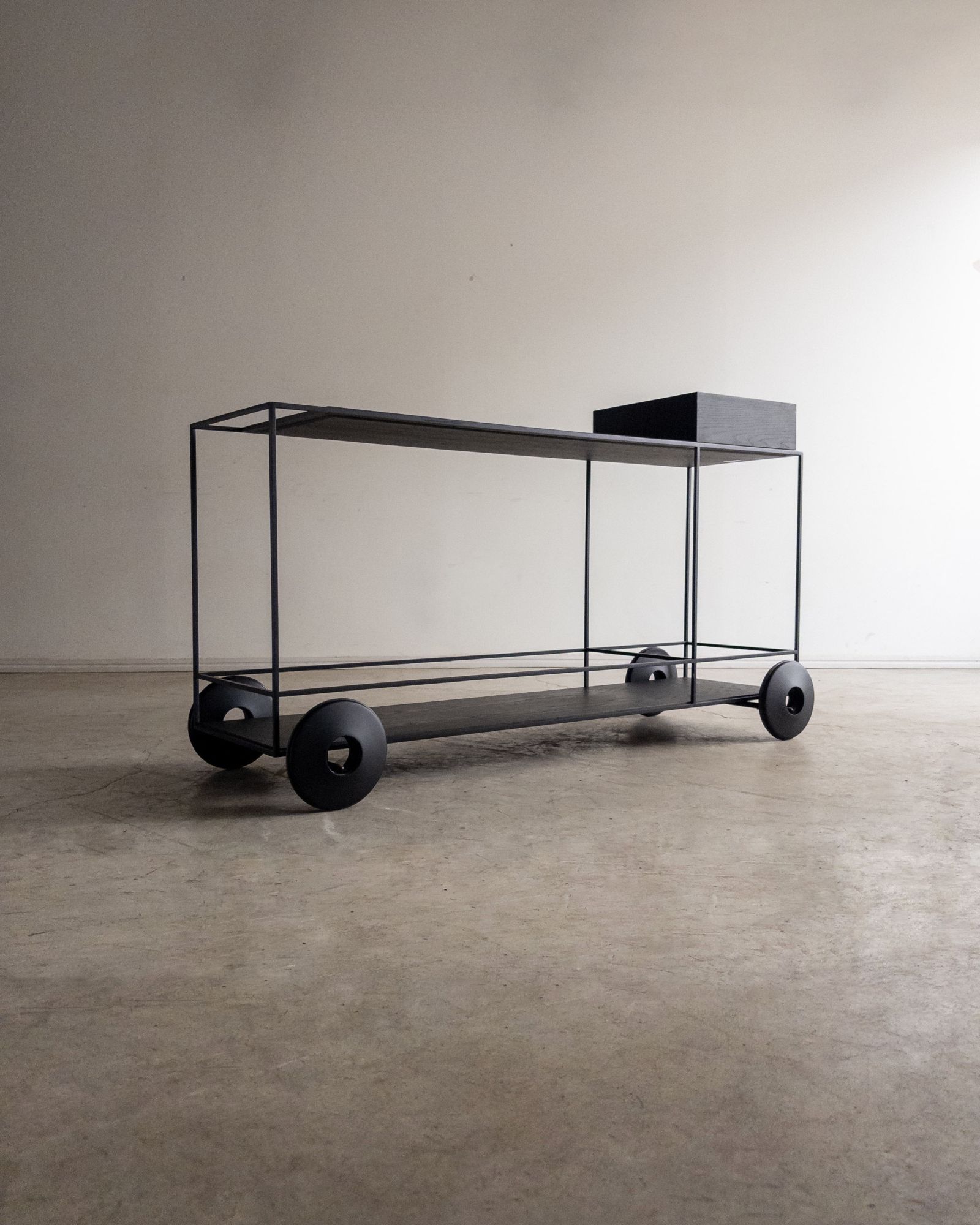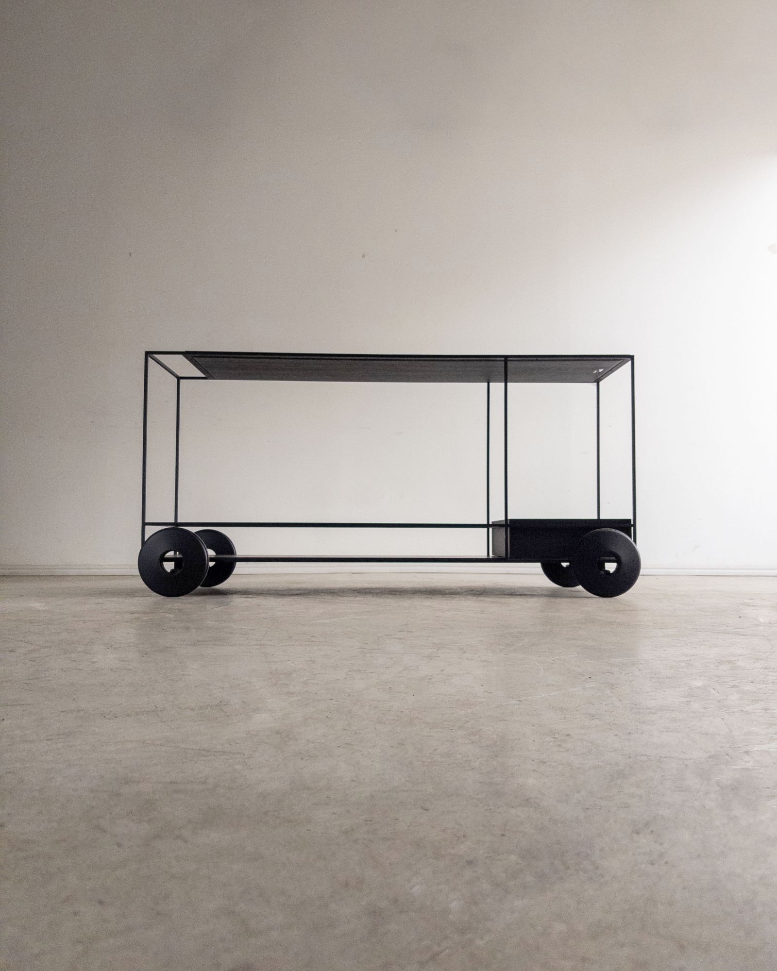 A estrutura é composta por perfis de aço carbono pintado em preto fosco, unidos por soldas que privilegiam a limpeza visual das junções. Os tampos, em MDF pintado na mesma tonalidade escura, apresentam textura que remete à madeira e completam o conjunto sem interromper a homogeneidade cromática. Os rodízios são torneados em madeira maciça, com perfil de disco achatado, funcionando como contraponto orgânico à rigidez linear da estrutura metálica. A escala generosa, com 151 cm de comprimento, aproxima a peça de um móvel auxiliar de grande porte, adequado tanto a ambientes residenciais quanto a espaços comerciais.