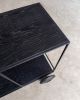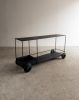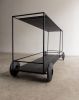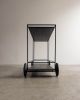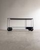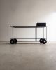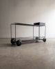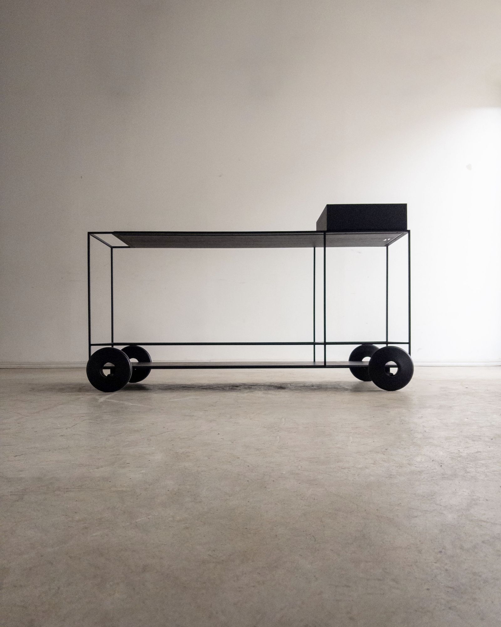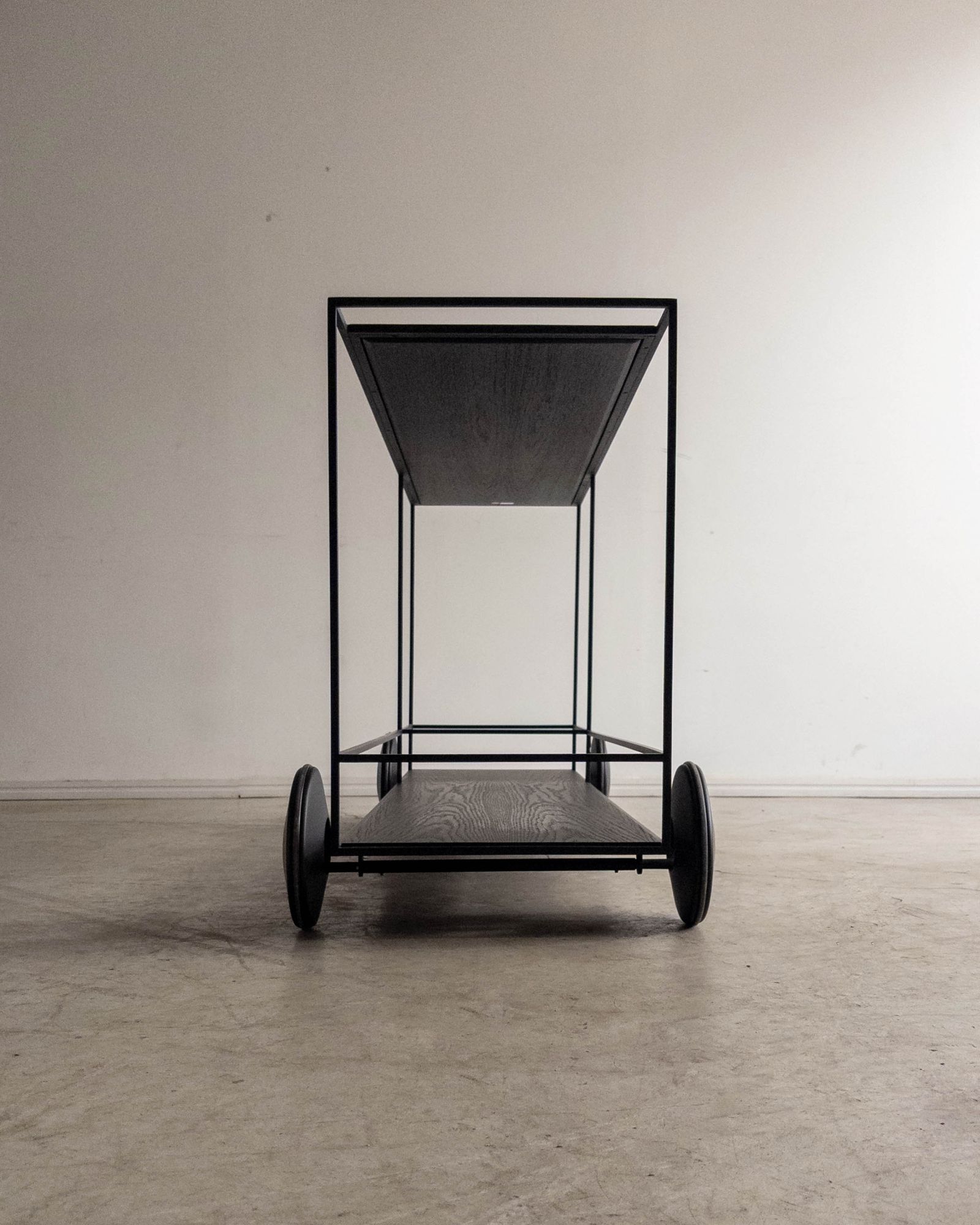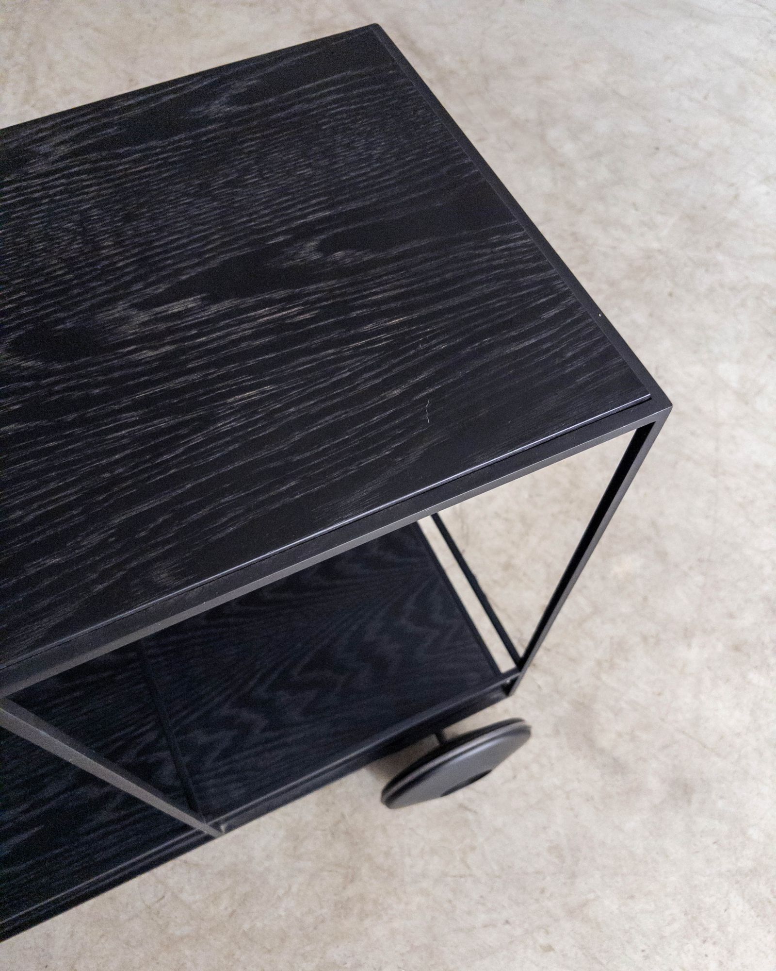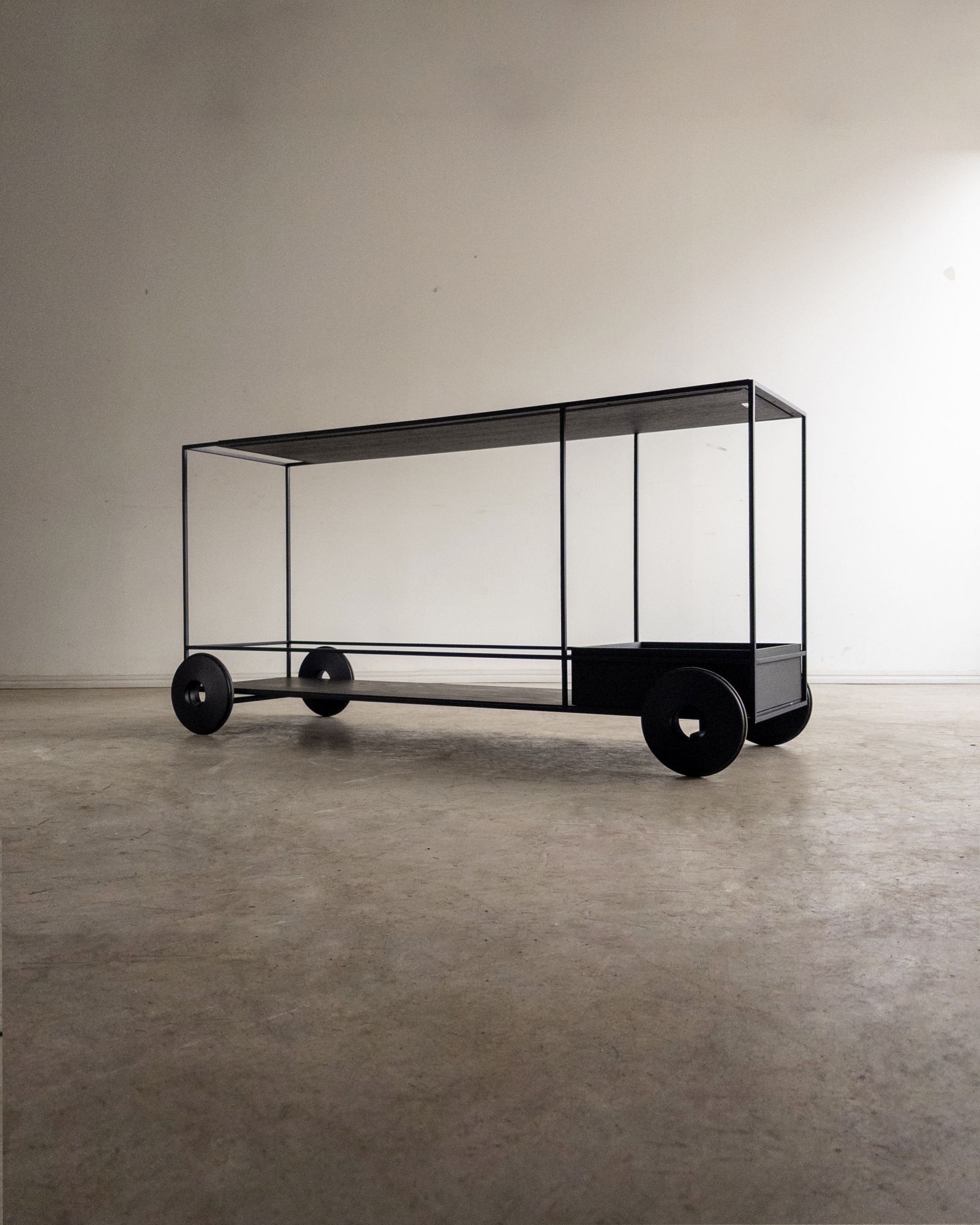 A estrutura é composta por perfis de aço carbono pintado em preto fosco, unidos por soldas que privilegiam a limpeza visual das junções. Os tampos, em MDF pintado na mesma tonalidade escura, apresentam textura que remete à madeira e completam o conjunto sem interromper a homogeneidade cromática. Os rodízios são torneados em madeira maciça, com perfil de disco achatado, funcionando como contraponto orgânico à rigidez linear da estrutura metálica. A escala generosa, com 151 cm de comprimento, aproxima a peça de um móvel auxiliar de grande porte, adequado tanto a ambientes residenciais quanto a espaços comerciais.