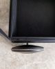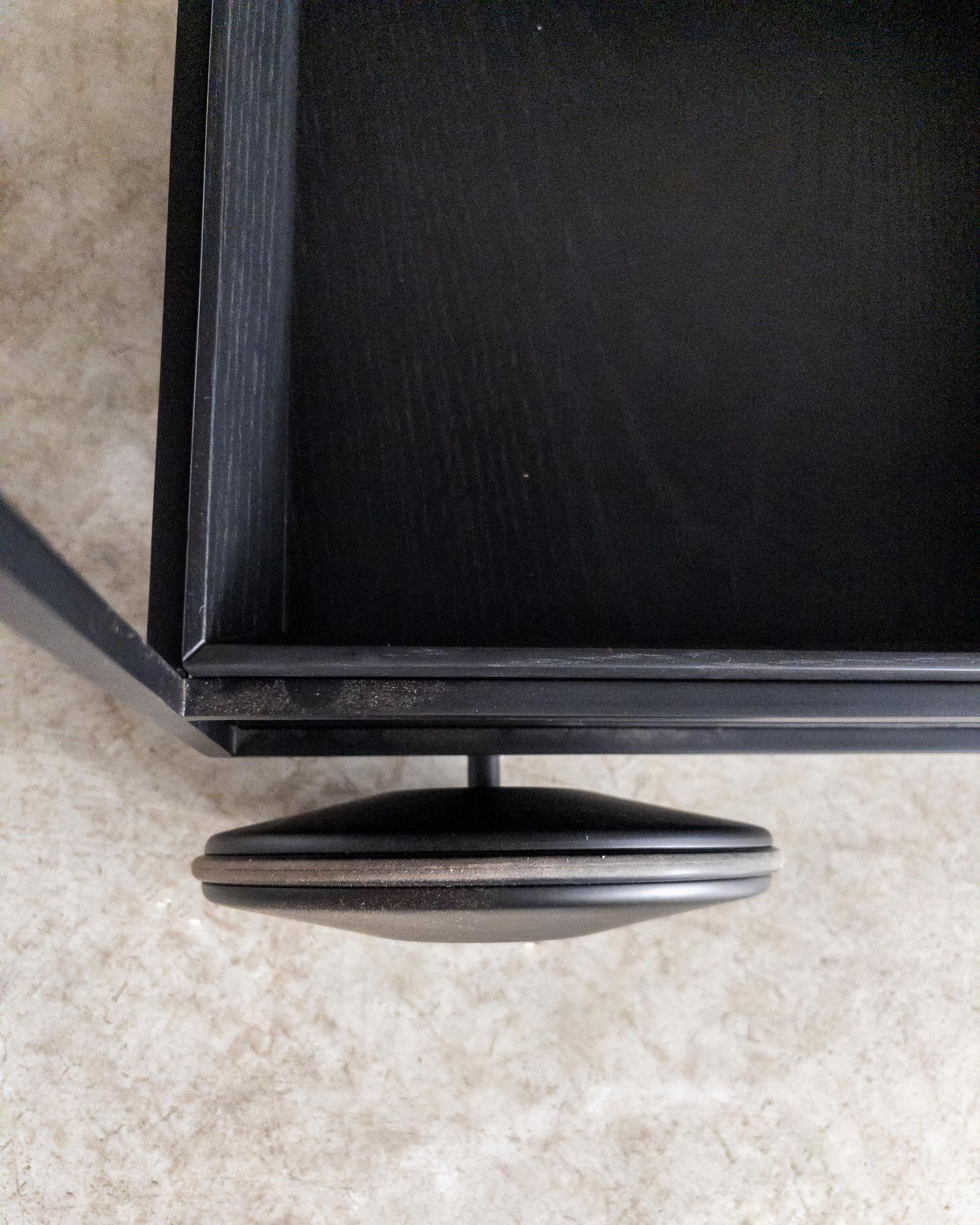 Visto de frente, o Teca se apresenta quase como um desenho: linhas negras que definem um retângulo suspenso sobre quatro discos. A ausência de decoração e a monocromia total transferem todo o interesse para as proporções e para a qualidade das conexões. Os rodízios em madeira introduzem uma nota inesperada, quebrando o rigor minimalista com um elemento de caráter quase lúdico.