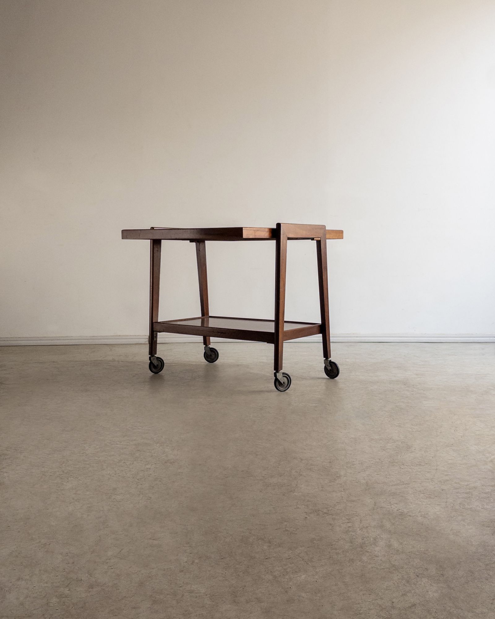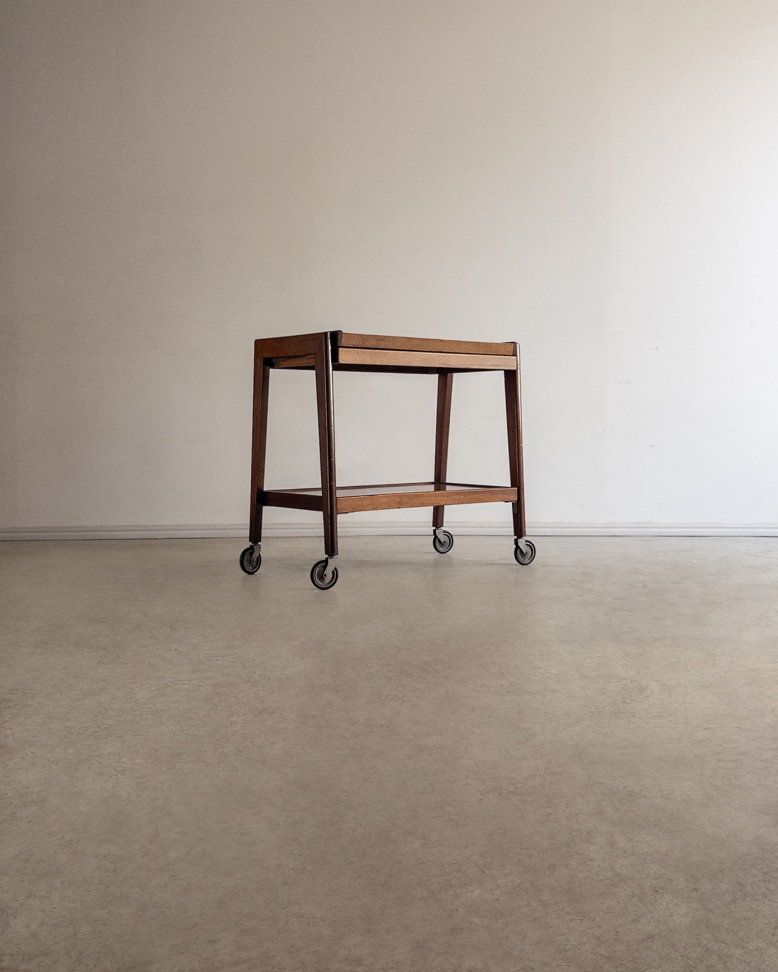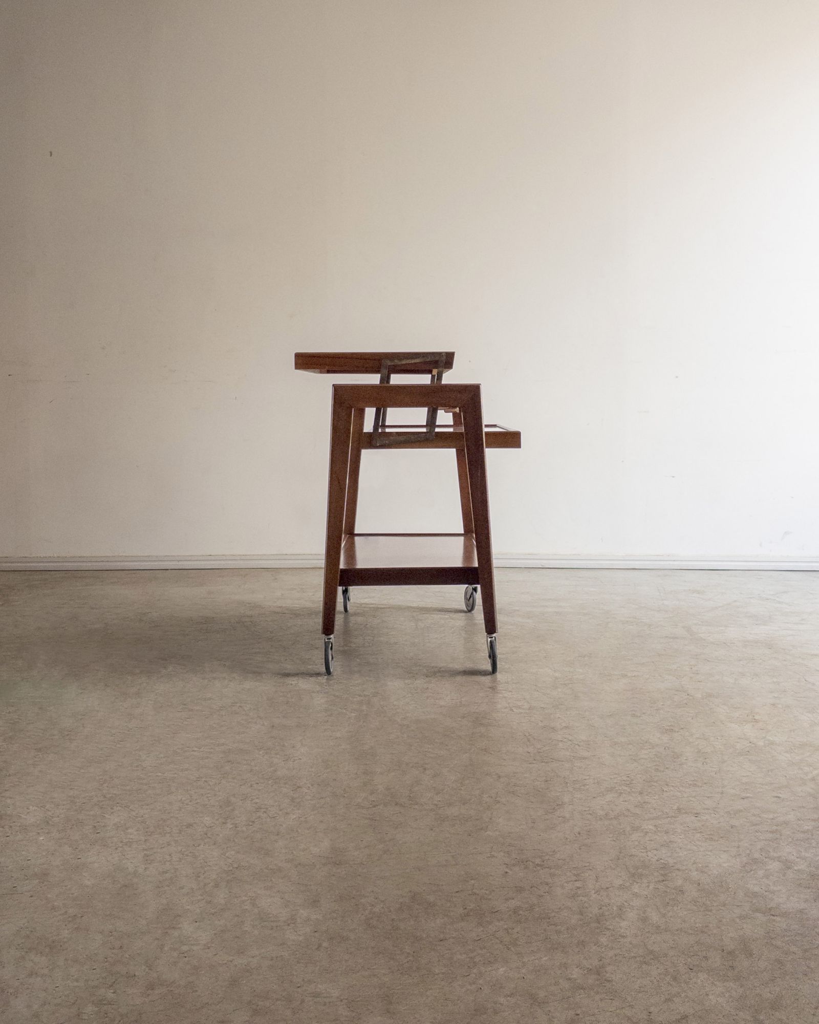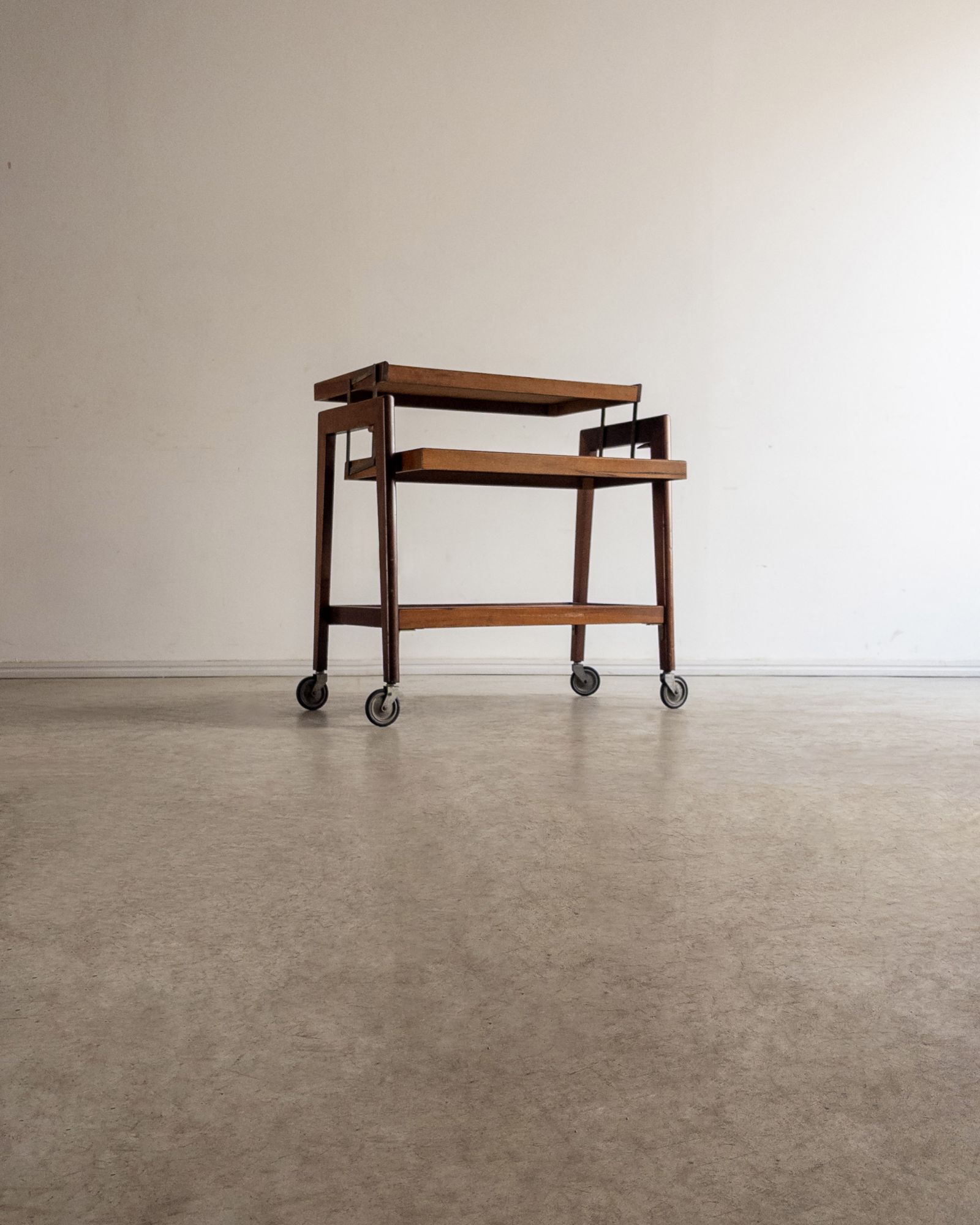 Executado em madeira, o carrinho tem dois níveis e sistema articulado, com tampo superior expansível que amplia a superfície de apoio e altera a leitura da peça em uso. Os rodízios originais reforçam esse caráter prático, facilitando o deslocamento e confirmando a proposta de um móvel pensado para servir, apoiar e circular com naturalidade. O selo de época preservado acrescenta integridade ao conjunto.