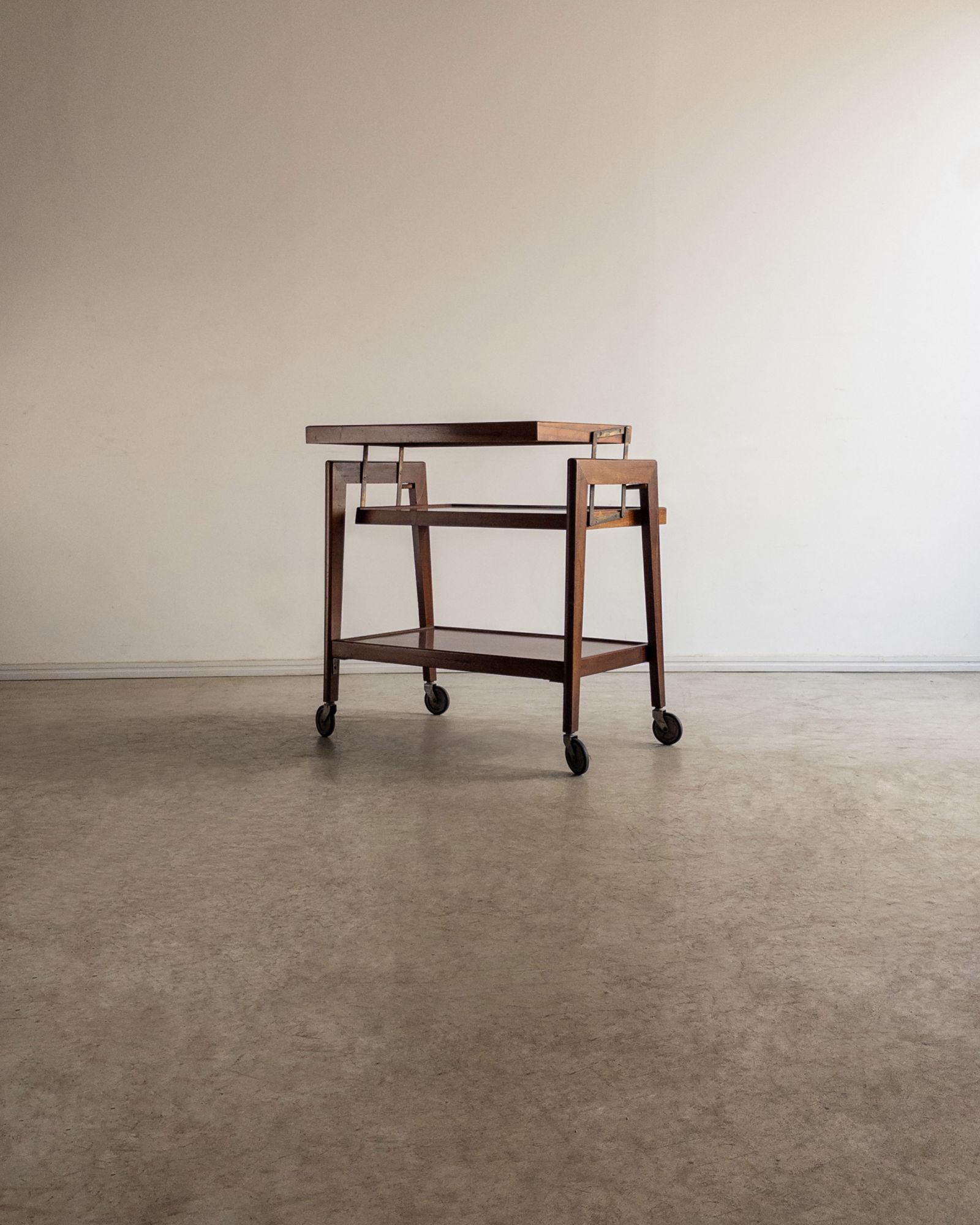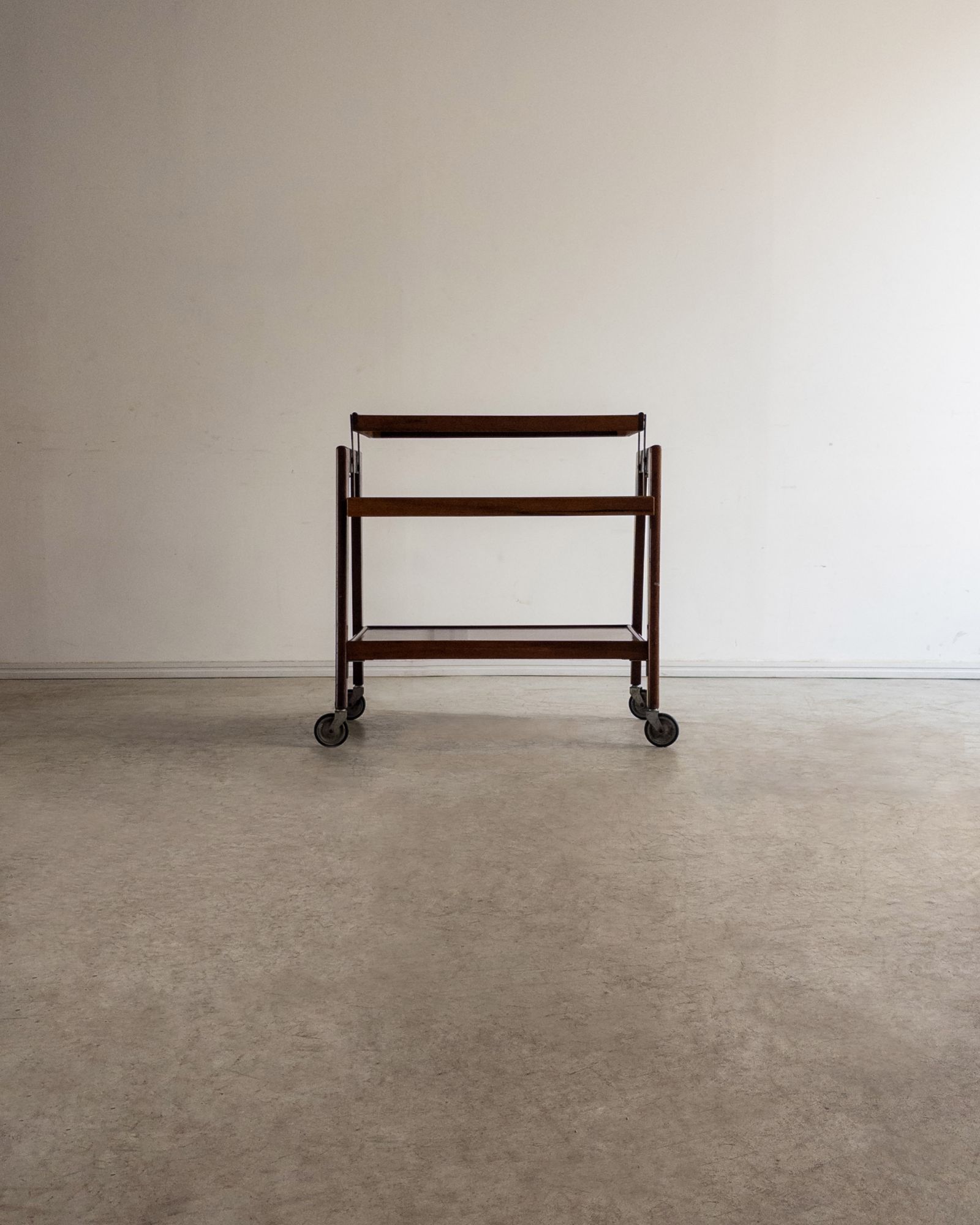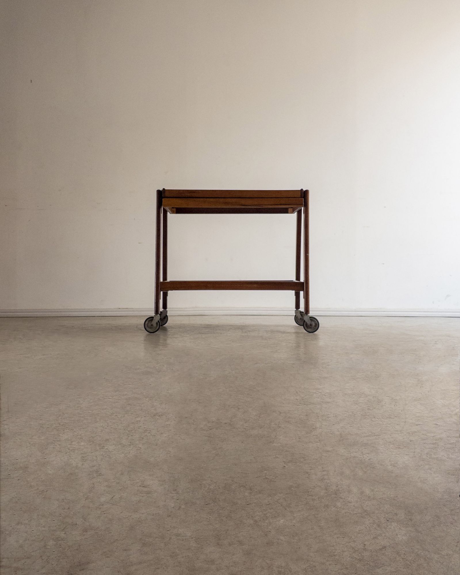Executado em madeira, o carrinho tem dois níveis e sistema articulado, com tampo superior expansível que amplia a superfície de apoio e altera a leitura da peça em uso. Os rodízios originais reforçam esse caráter prático, facilitando o deslocamento e confirmando a proposta de um móvel pensado para servir, apoiar e circular com naturalidade. O selo de época preservado acrescenta integridade ao conjunto.