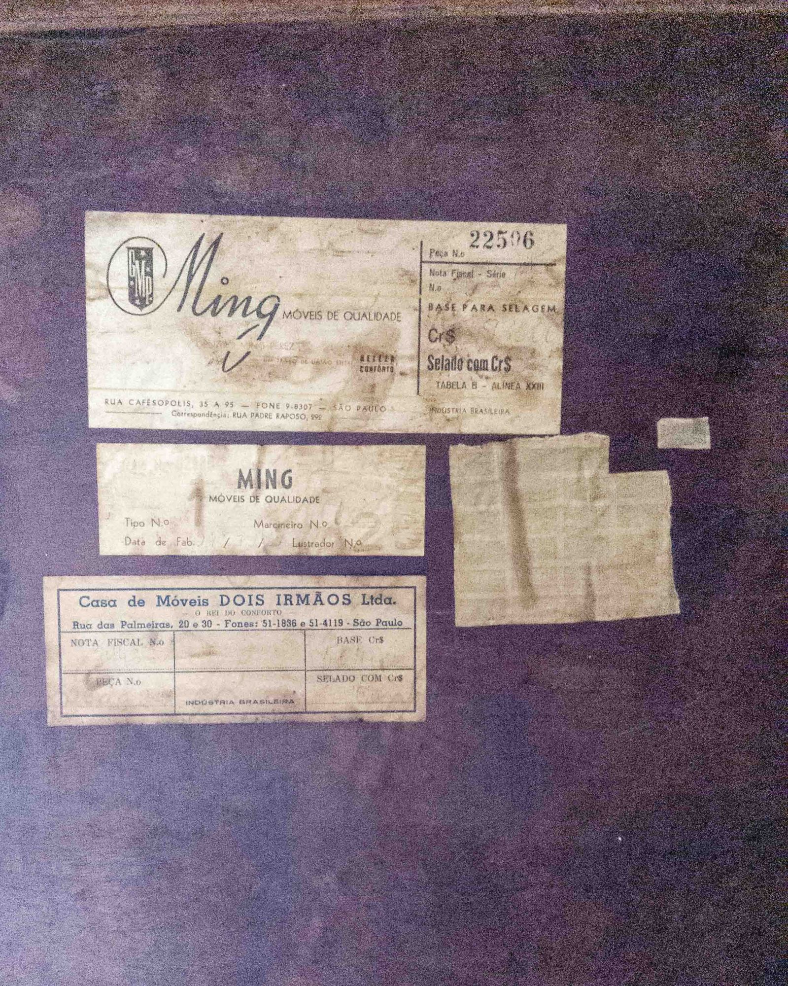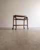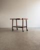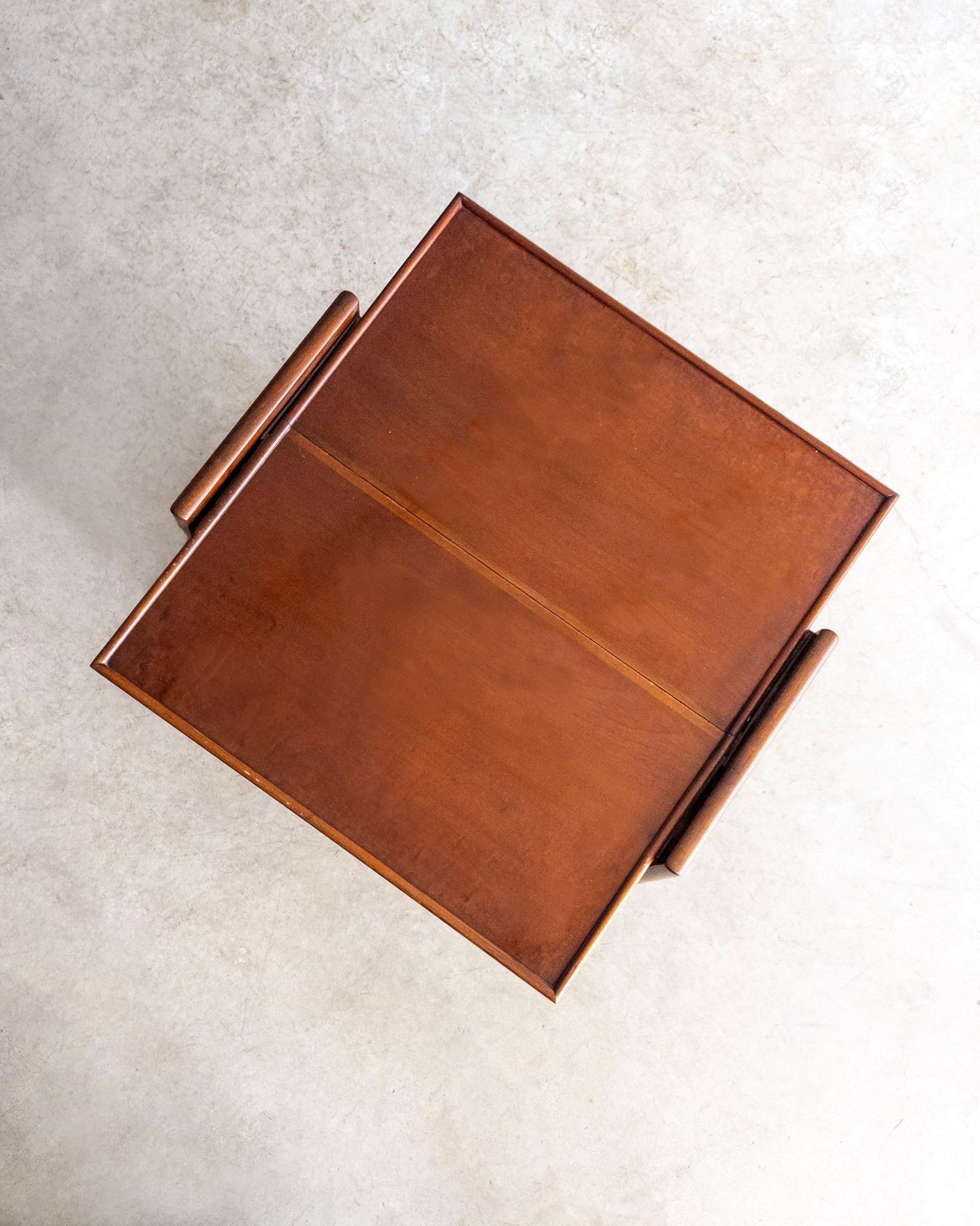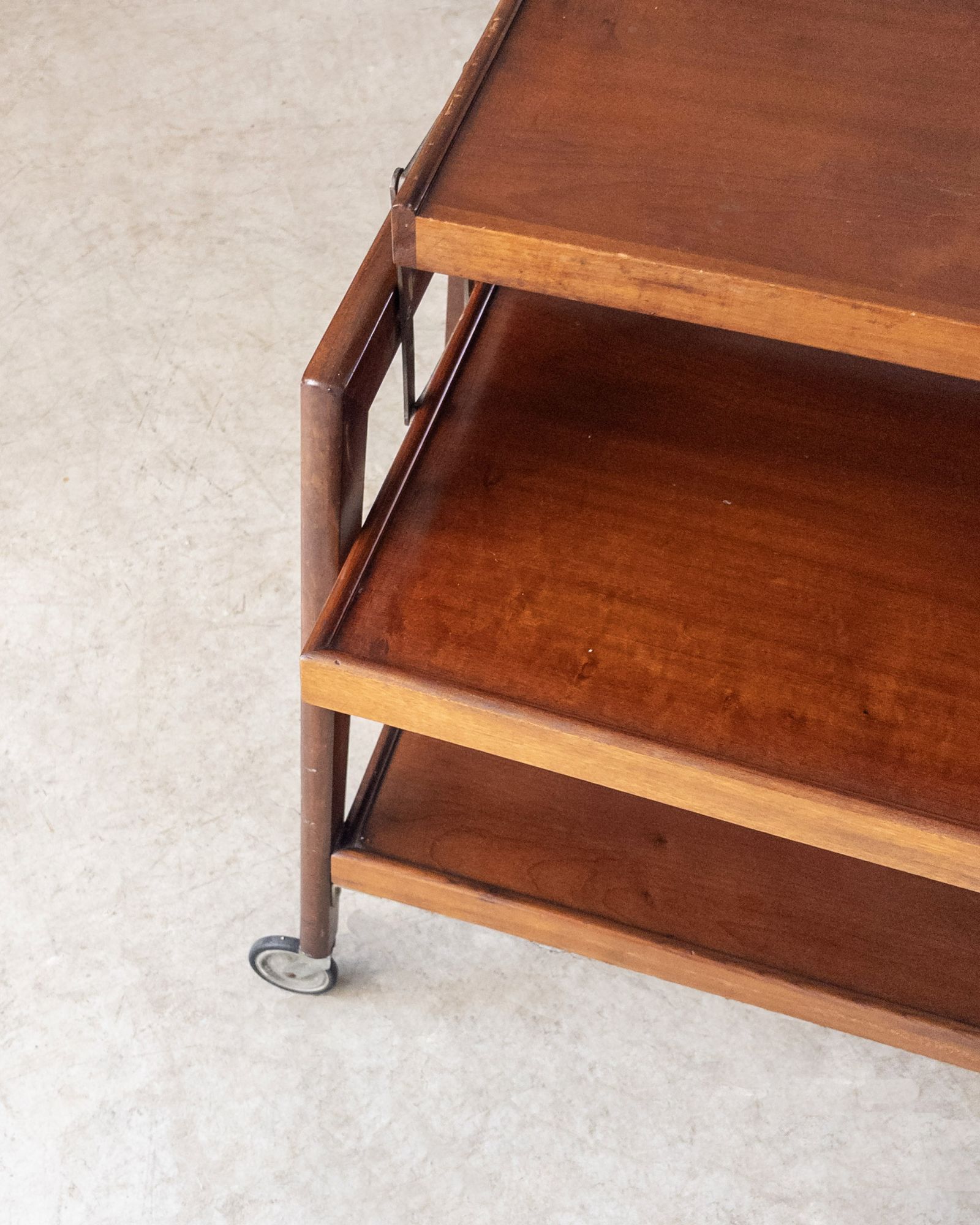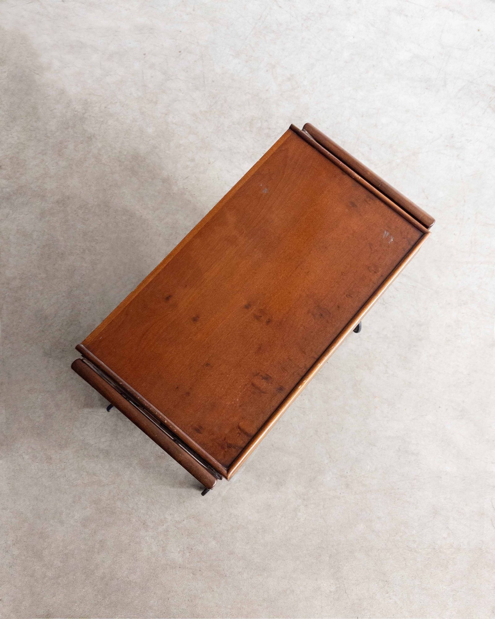 Executado em madeira, o carrinho tem dois níveis e sistema articulado, com tampo superior expansível que amplia a superfície de apoio e altera a leitura da peça em uso. Os rodízios originais reforçam esse caráter prático, facilitando o deslocamento e confirmando a proposta de um móvel pensado para servir, apoiar e circular com naturalidade. O selo de época preservado acrescenta integridade ao conjunto.
