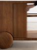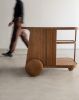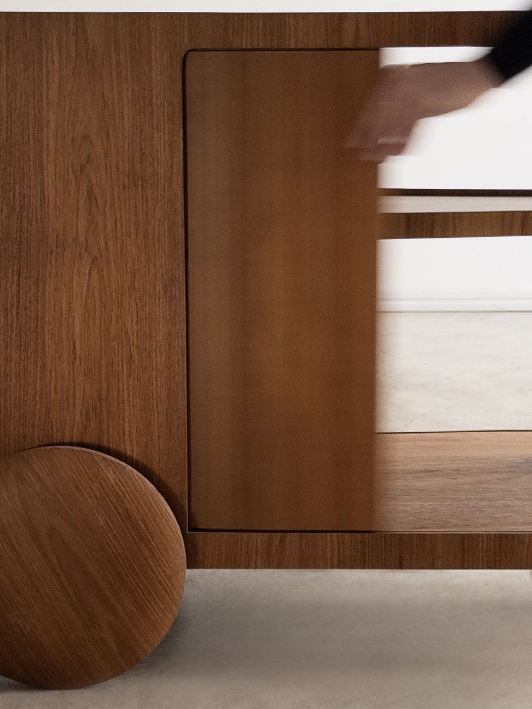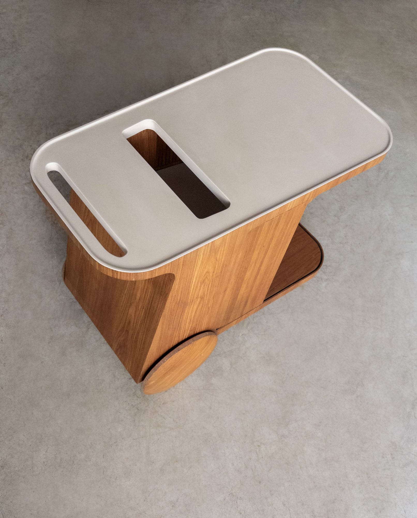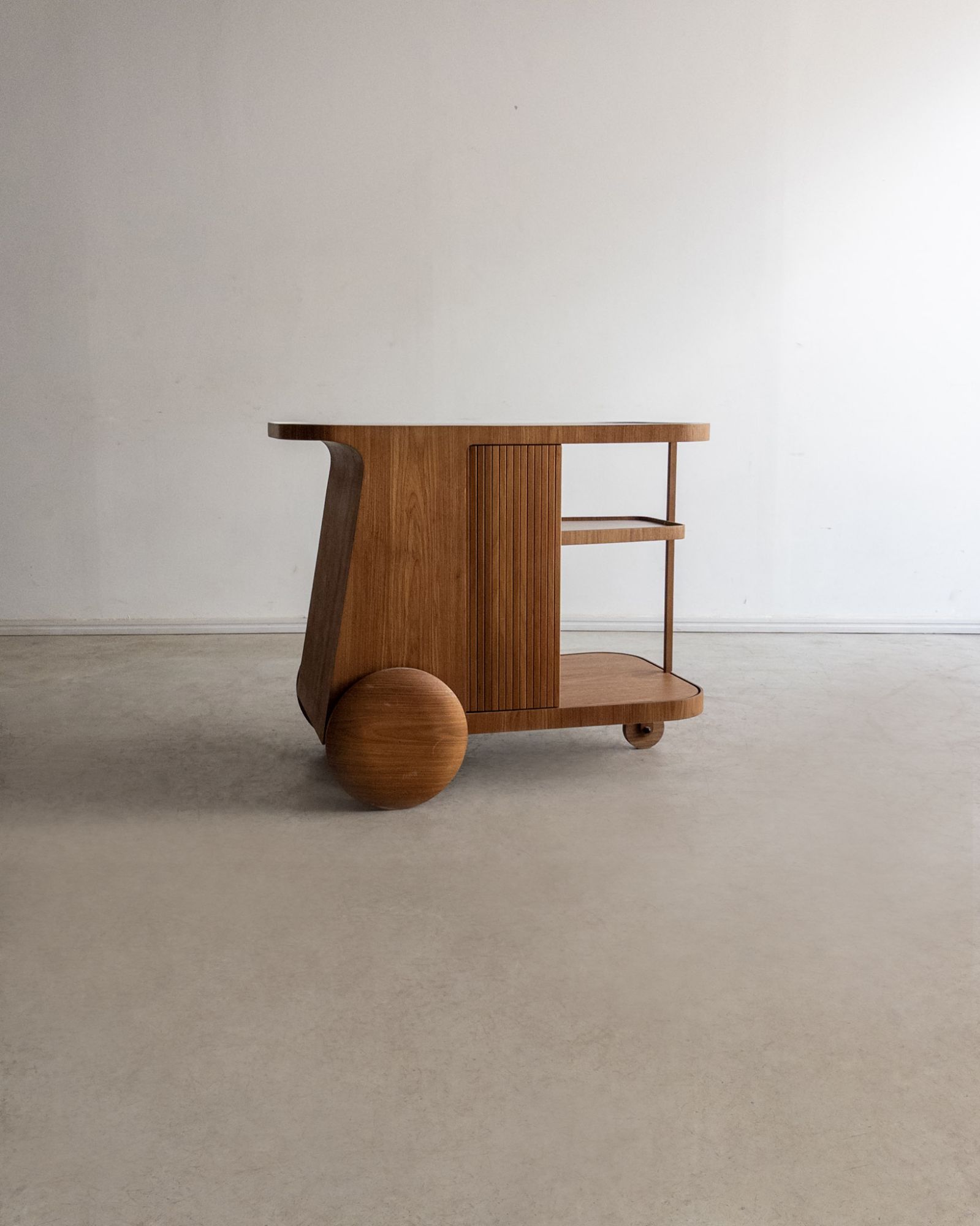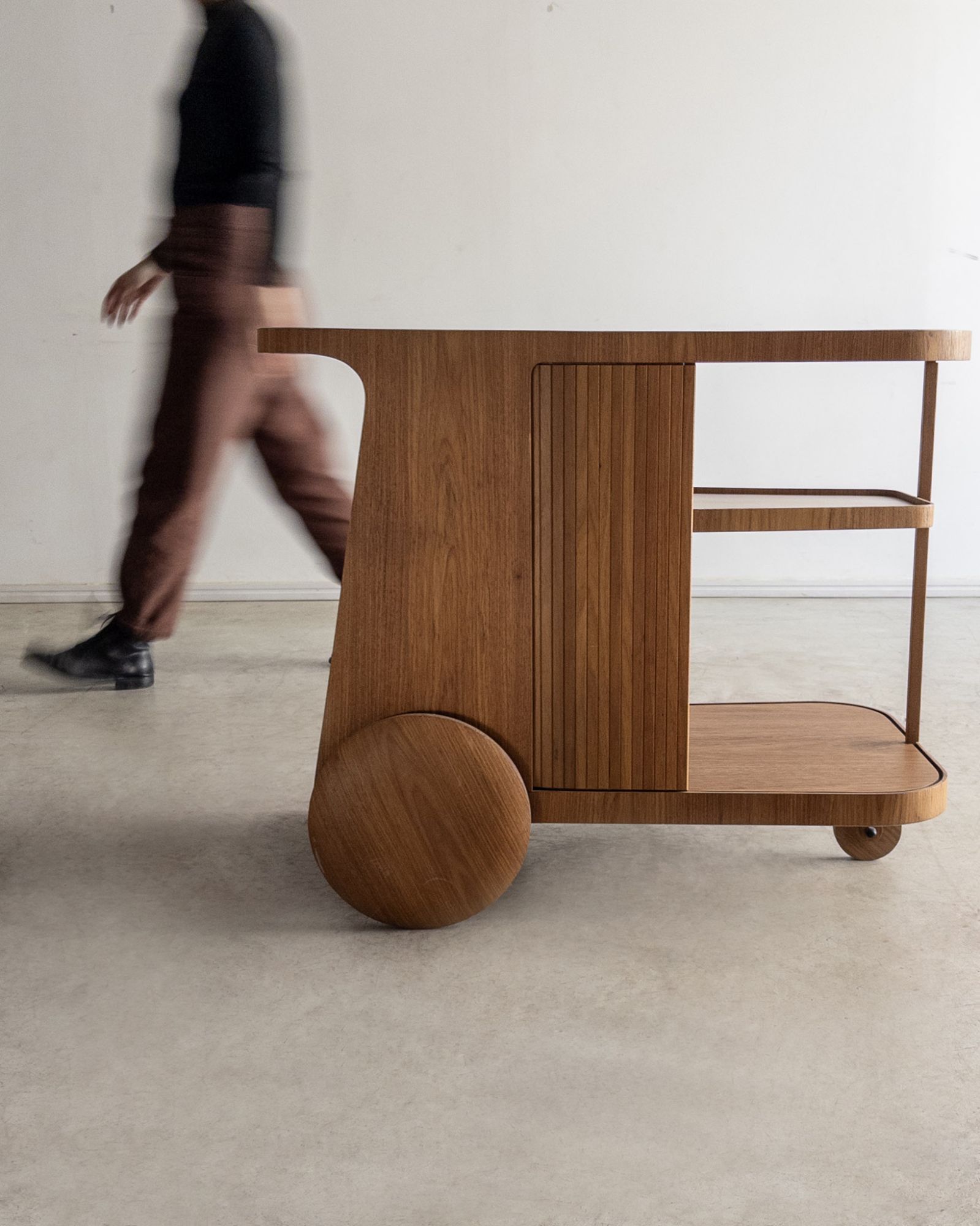 O que singulariza o CE Bar é a tensão entre o peso visual do corpo central, fechado e verticalizado, e a leveza da estrutura aberta nas laterais. As rodinhas frontais em madeira torneada funcionam quase como citação ao design escandinavo dos anos 1950, mas integradas sem literalidade. O conjunto resulta em uma peça que oscila entre objeto utilitário e presença escultórica no ambiente.