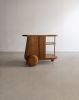 O CE Bar é um carrinho de bar desenhado por Gisela Simas em 2018, peça que exemplifica bem a abordagem da designer carioca: objetos funcionais tratados com vocabulário formal próximo à escultura. A peça combina estrutura em compensado de madeira com revestimento em fio de madeira, integrando tampo removível em material claro, prateleira intermediária e um compartimento central com porta de veneziana corrediça.