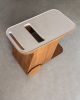 A estrutura é inteiramente em compensado de madeira com revestimento em folha natural, o que garante leveza estrutural e continuidade visual. O tampo superior, de contorno arredondado, apresenta recorte central e a prateleira intermediária acompanha o mesmo perfil do tampo. A porta do compartimento central é em veneziana de madeira, solução que alivia visualmente o volume.