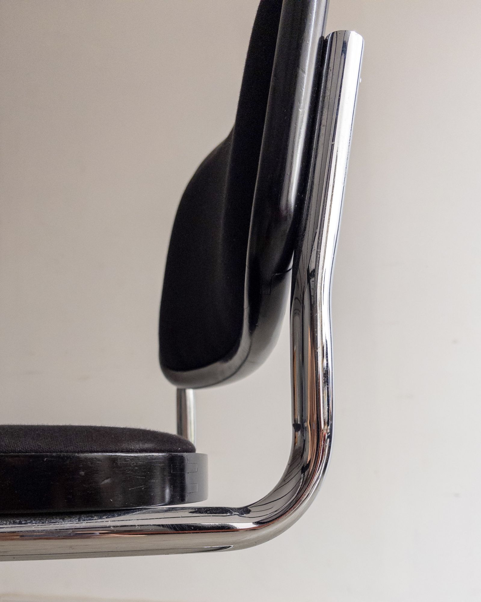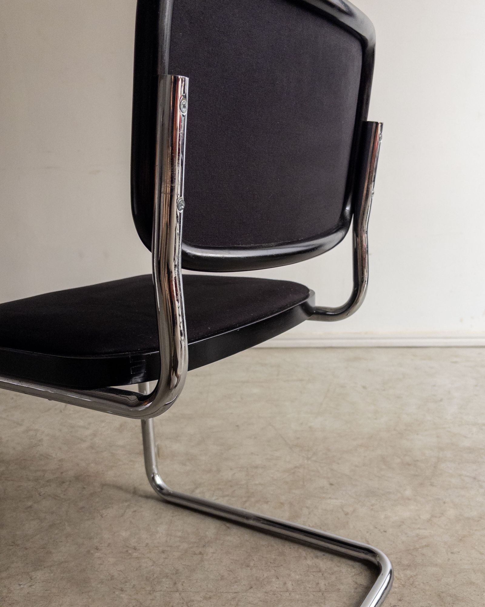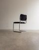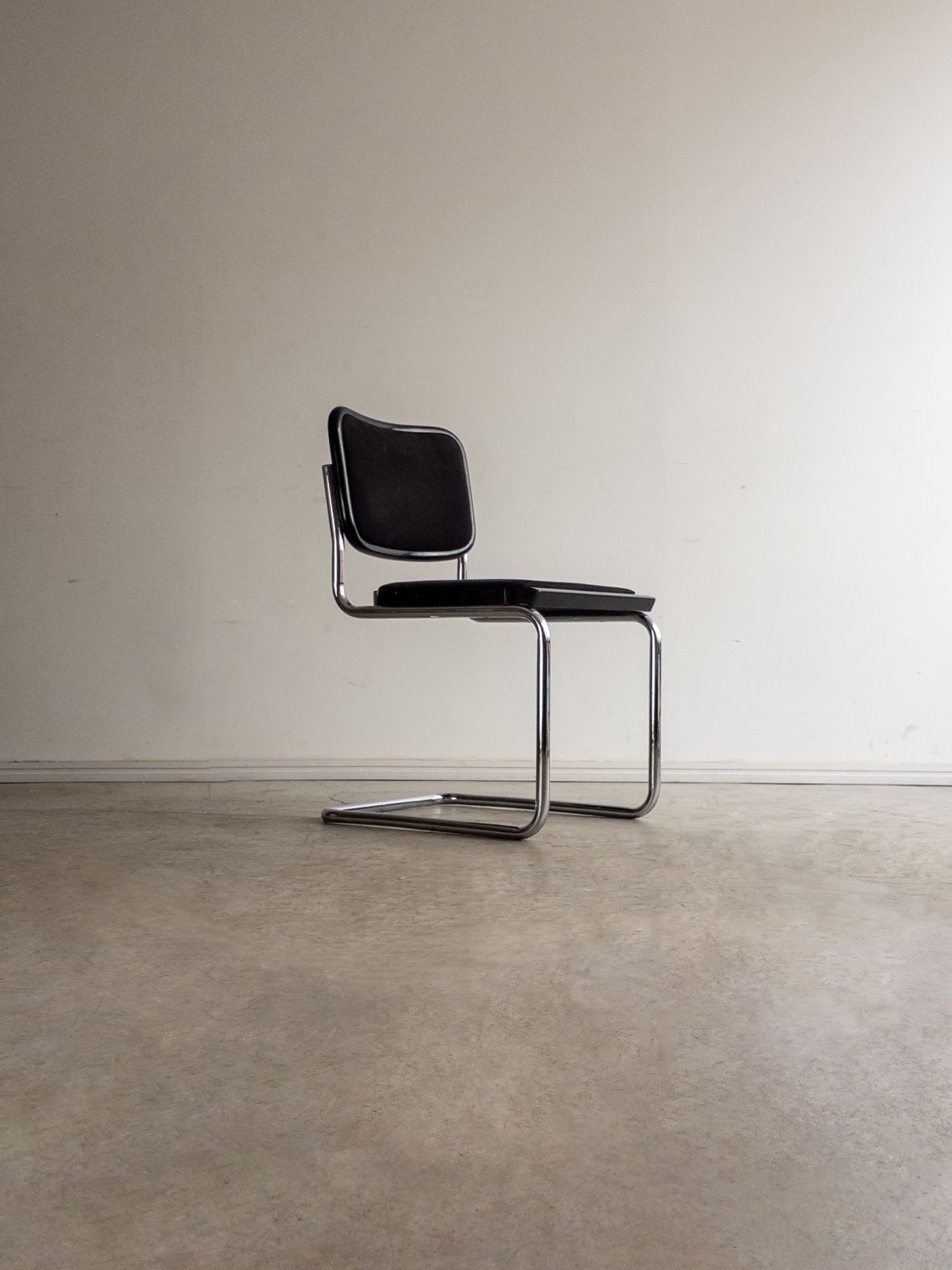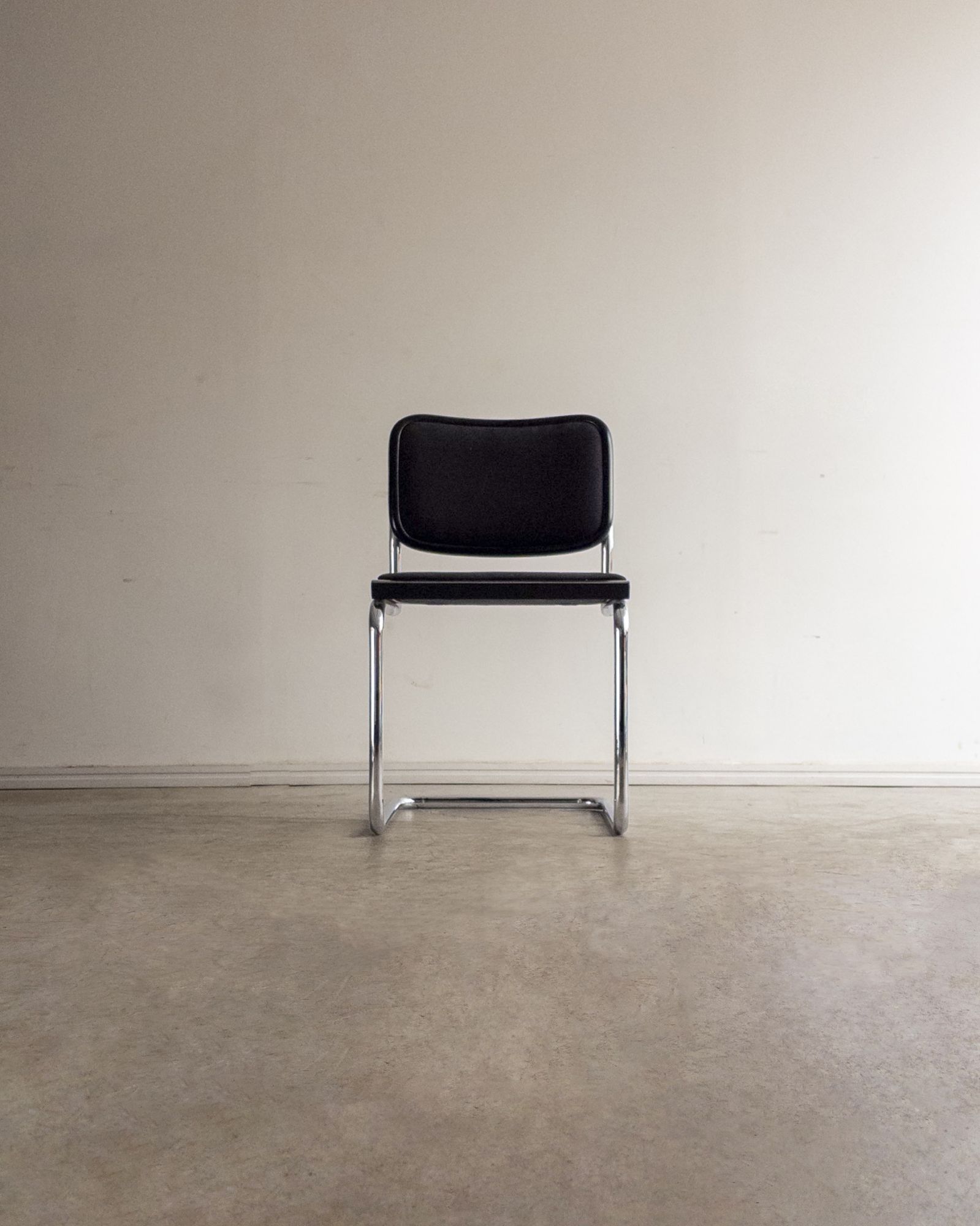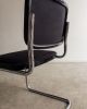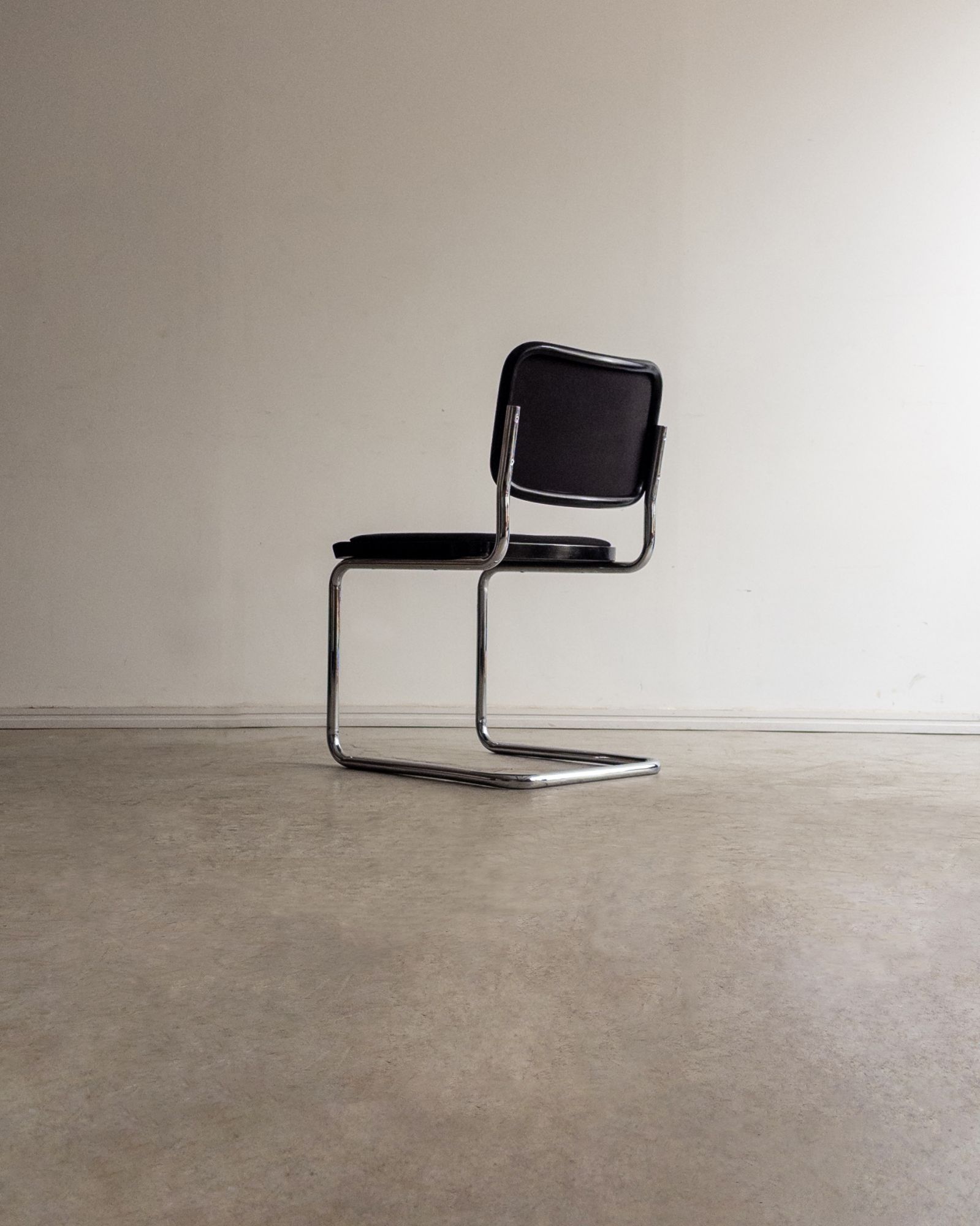 Projetada em 1928 pelo arquiteto e designer húngaro Marcel Breuer durante seu período na Bauhaus, a Cadeira Cesca é um dos marcos do design moderno do século XX. Seu traço mais distintivo é a base em balanço — um único tubo de aço contínuo que elimina as pernas traseiras e confere à peça leveza visual e uma leve flexibilidade ao sentar. Nesta edição da Forma, a estrutura é em tubo de aço inox cromado, com assento e encosto revestidos em couro preto. O conjunto é composto por quatro unidades.