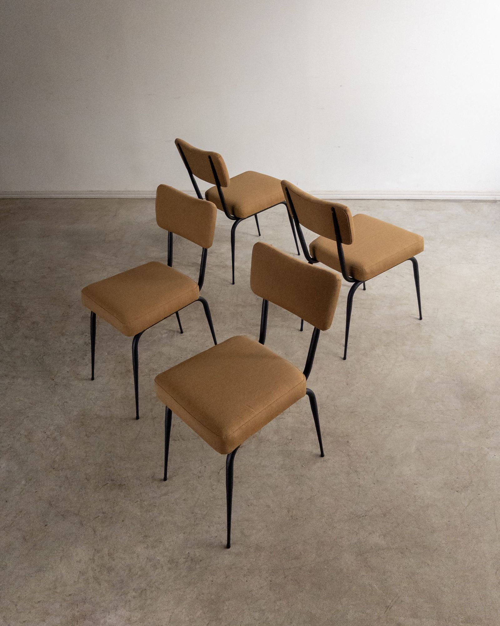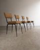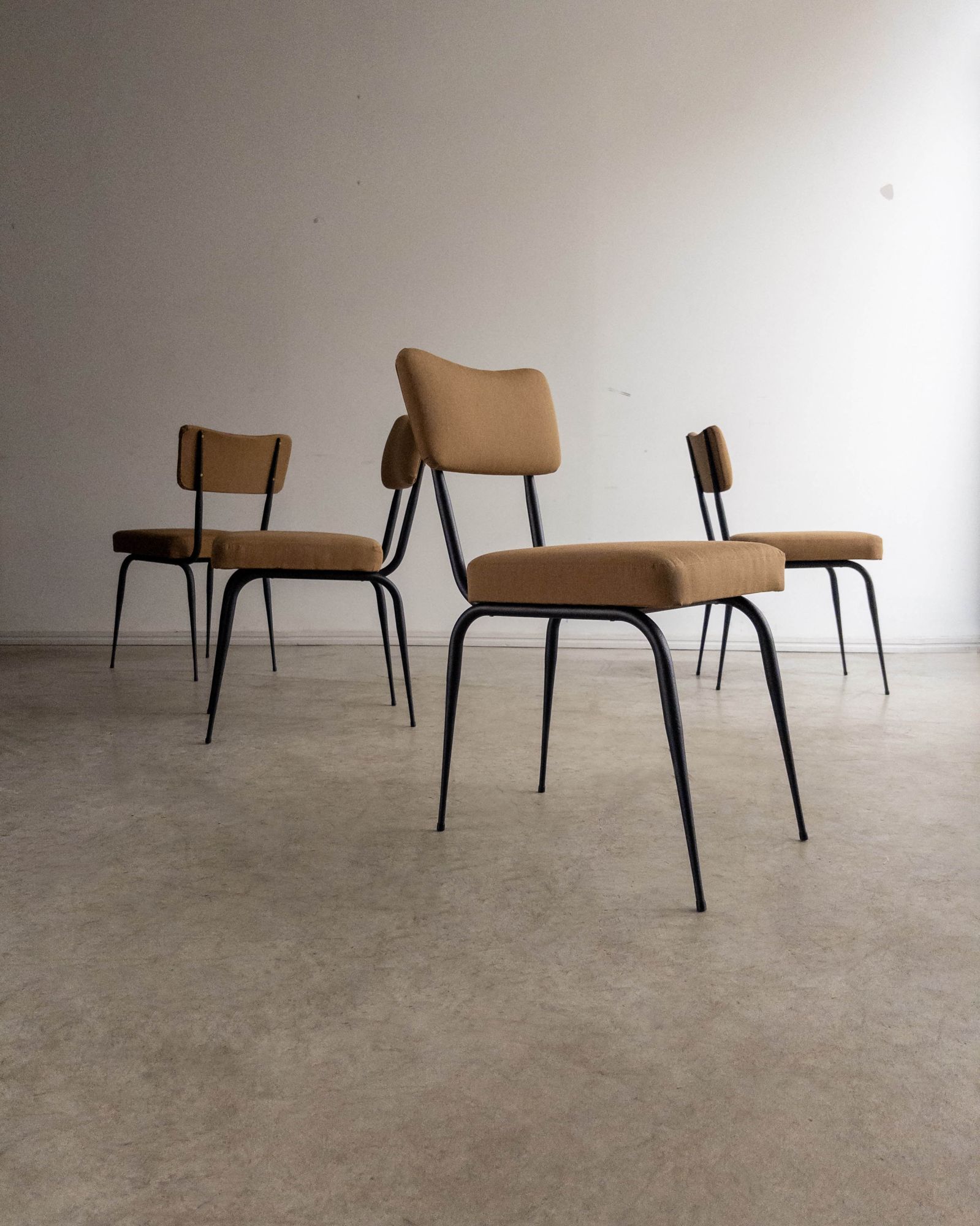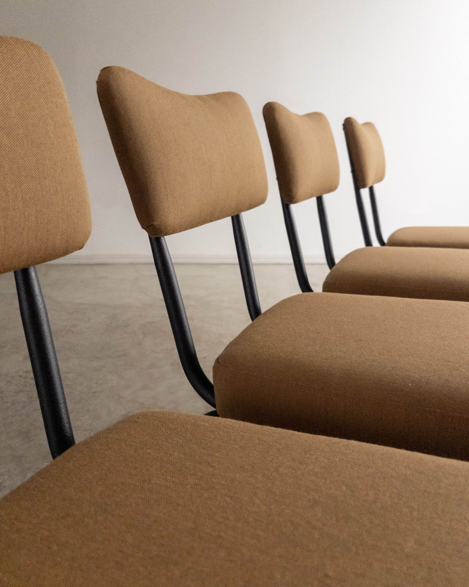 Conjunto de quatro cadeiras com estrutura em ferro curvado e tapeçaria recentemente renovada. A estrutura metálica desenha encosto curvo e assento generoso, criando uma presença leve e confortável.
