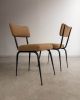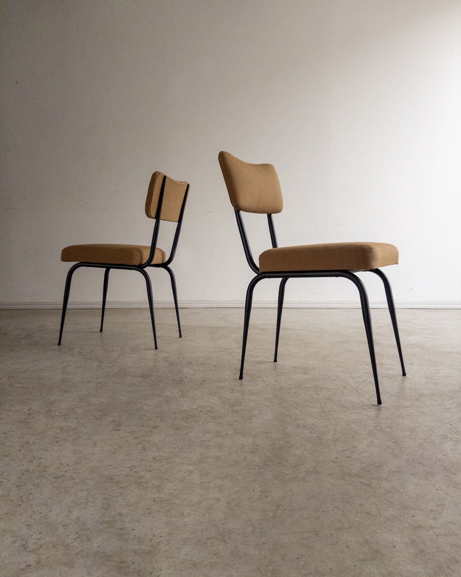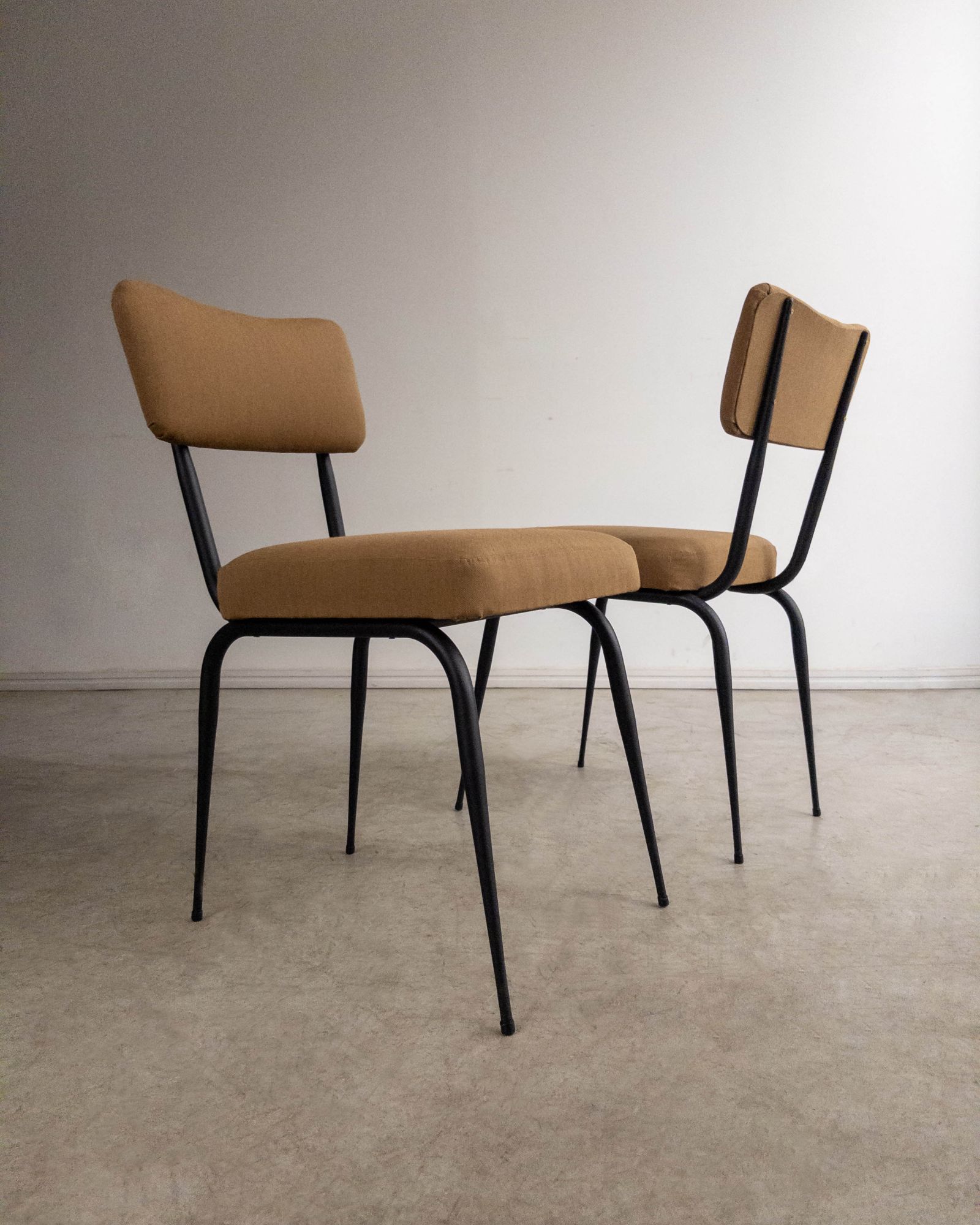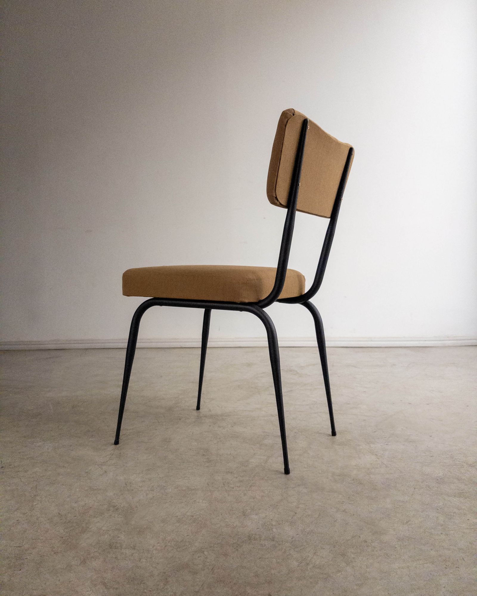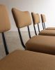 Conjunto de quatro cadeiras com estrutura em ferro curvado e tapeçaria recentemente renovada. A estrutura metálica desenha encosto curvo e assento generoso, criando uma presença leve e confortável.