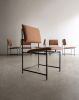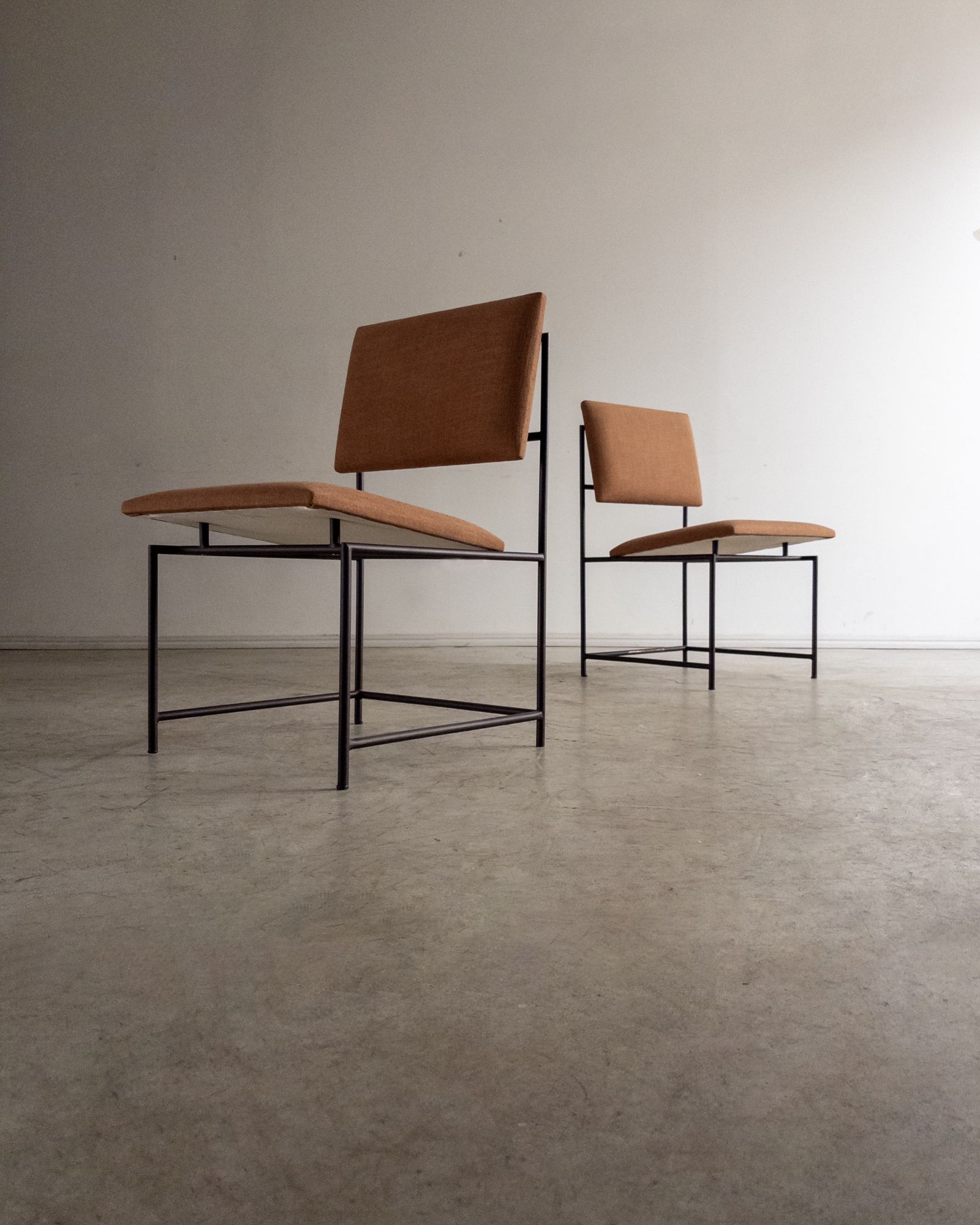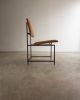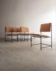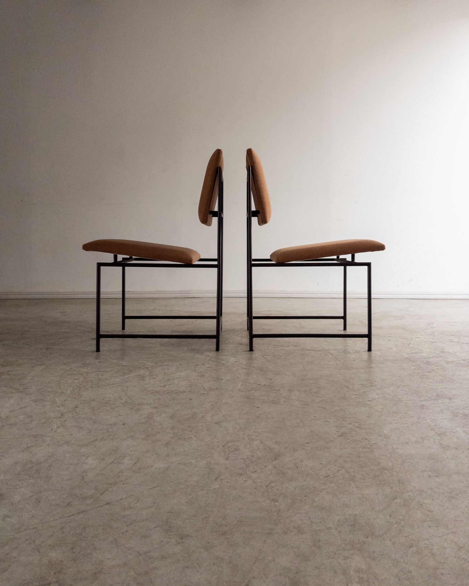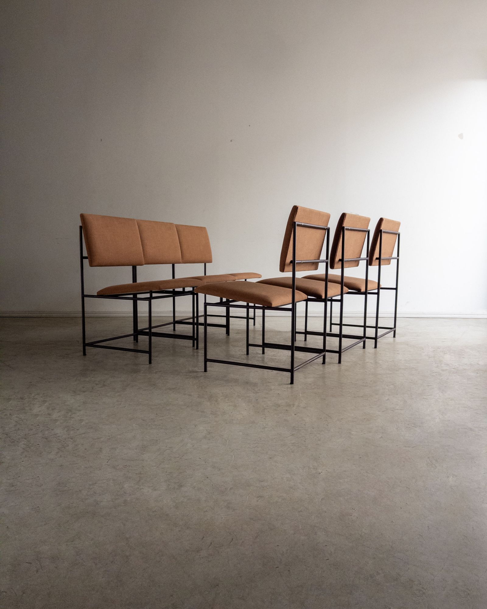 Conjunto de cadeiras com estrutura em ferro, destacando a solução estrutural aparente como elemento principal do desenho. As linhas simples e proporções equilibradas conferem versatilidade para ambientes contemporâneos. Pode apresentar leves marcas do tempo.