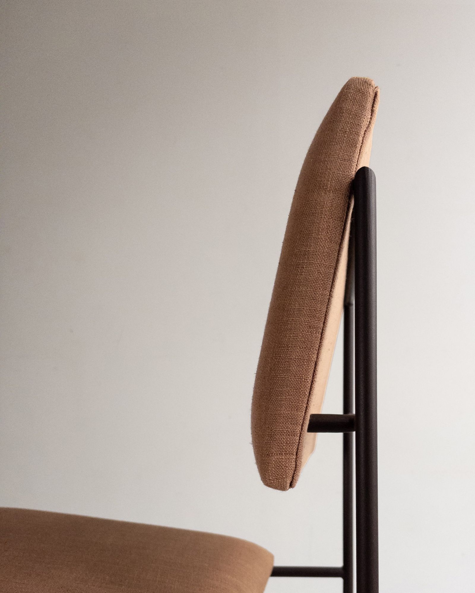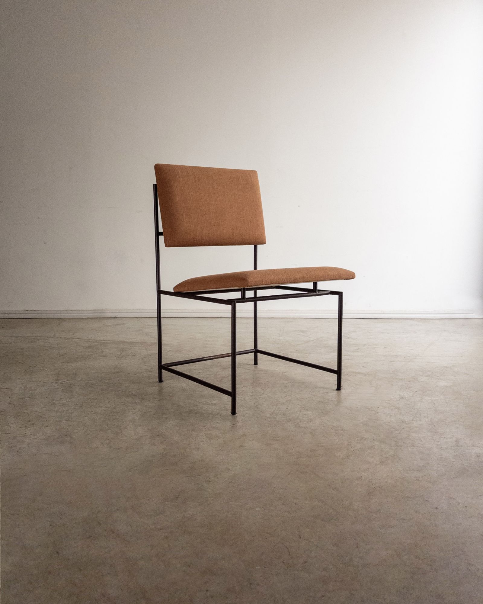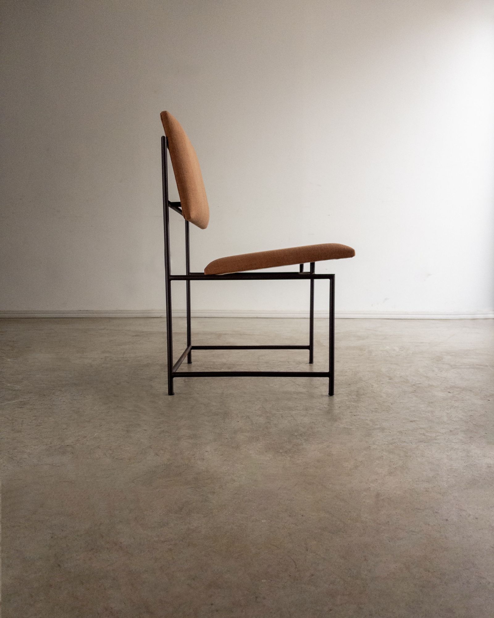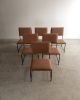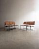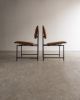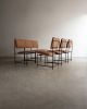 Conjunto de cadeiras com estrutura em ferro, destacando a solução estrutural aparente como elemento principal do desenho. As linhas simples e proporções equilibradas conferem versatilidade para ambientes contemporâneos. Pode apresentar leves marcas do tempo.