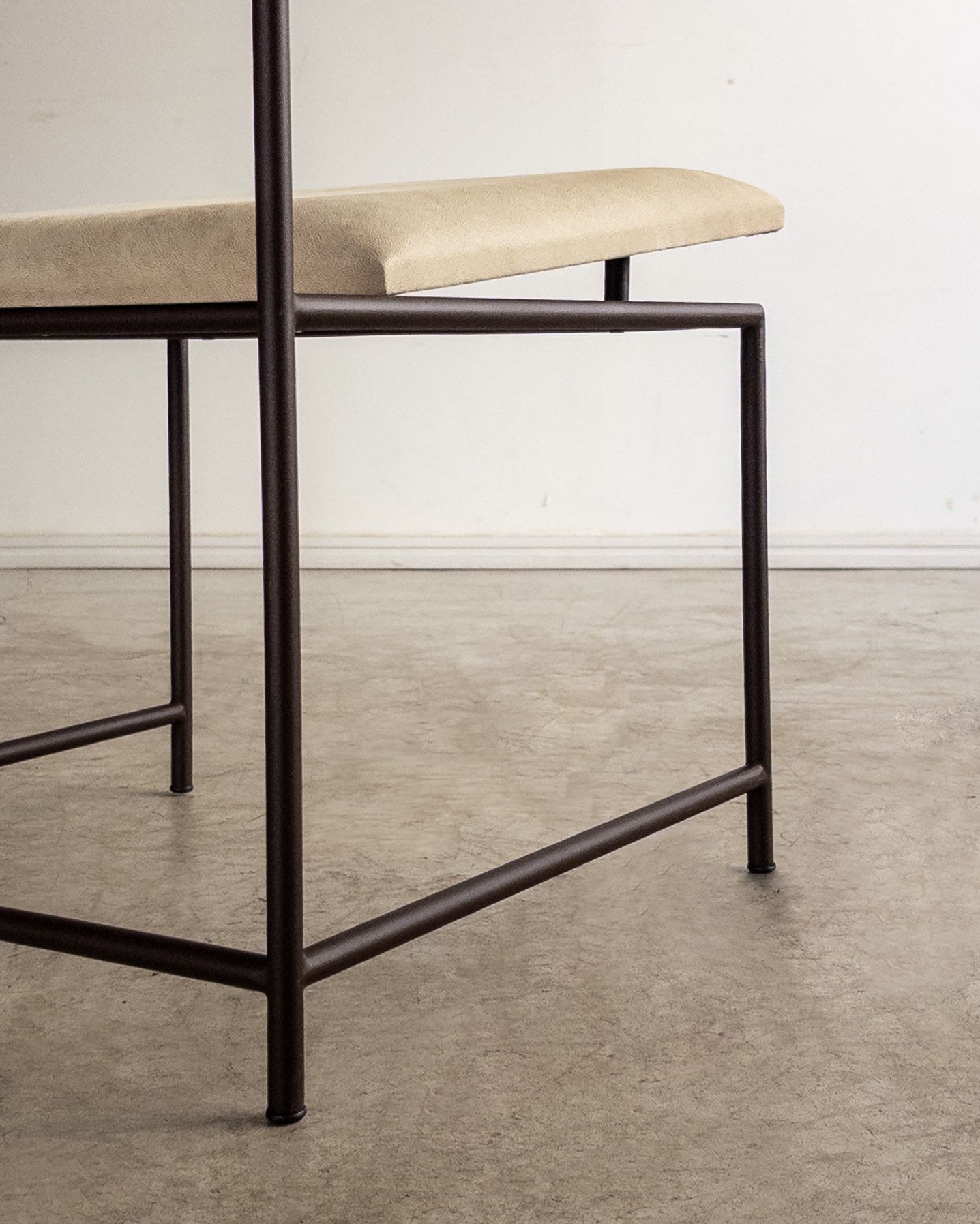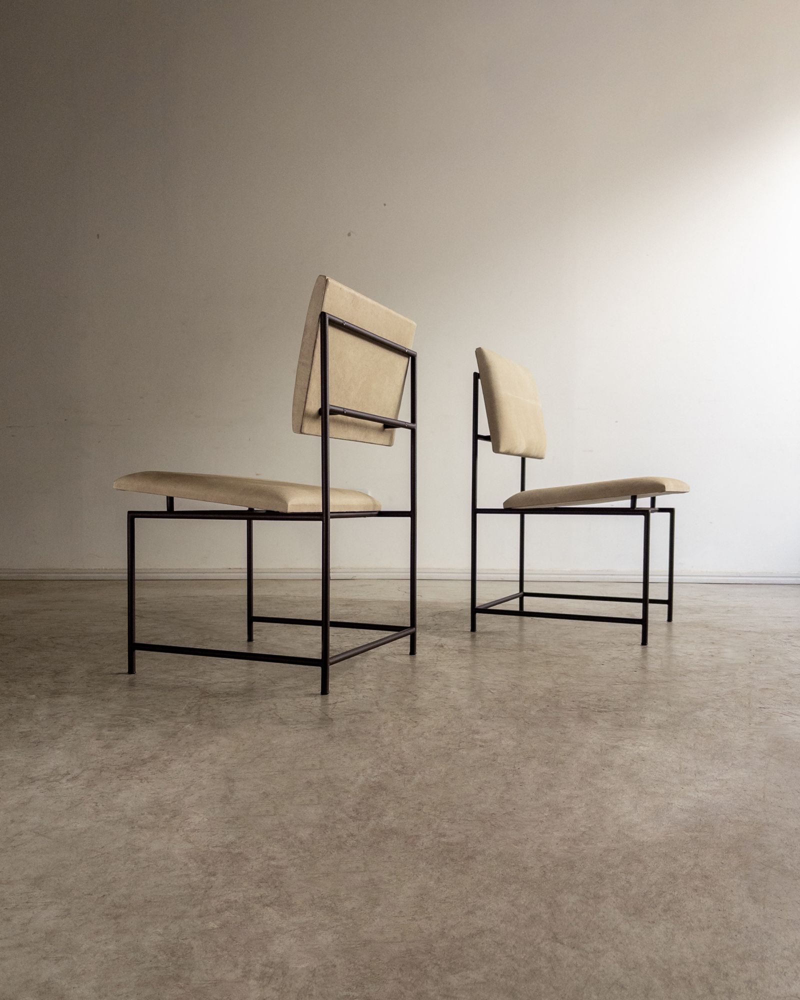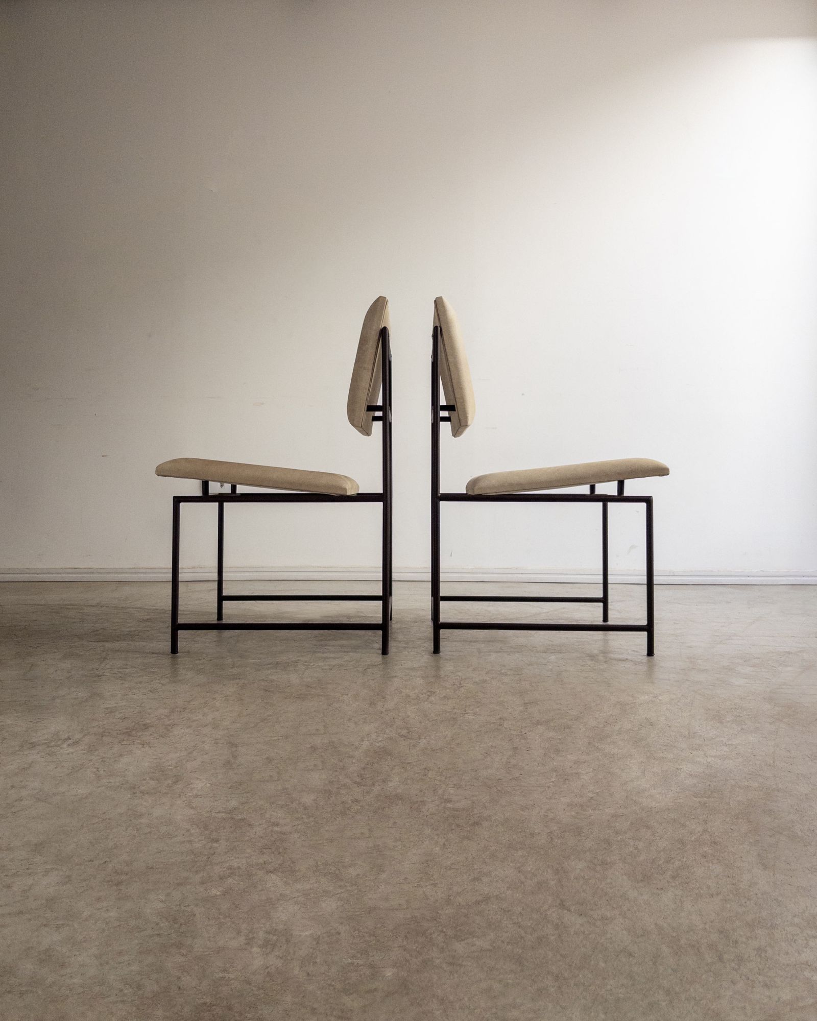 Conjunto de cadeiras com estrutura em ferro, destacando a solução estrutural aparente como elemento principal do desenho. As linhas simples e proporções equilibradas conferem versatilidade para ambientes contemporâneos. Pode apresentar leves marcas do tempo.