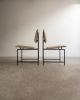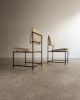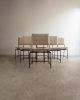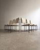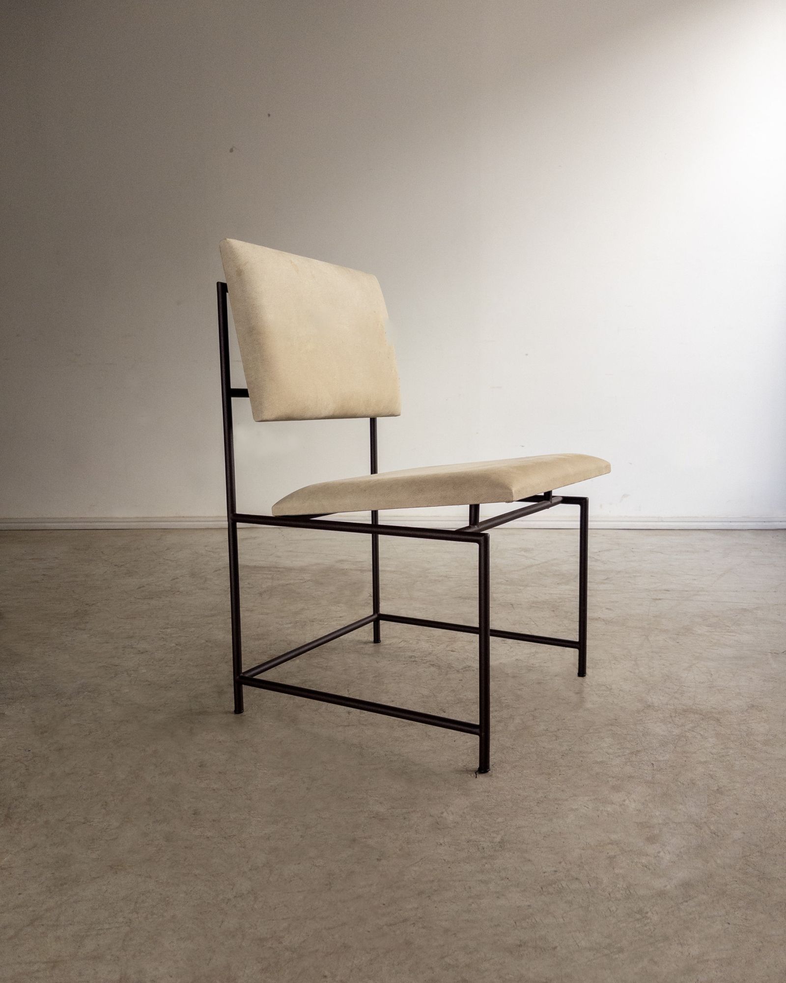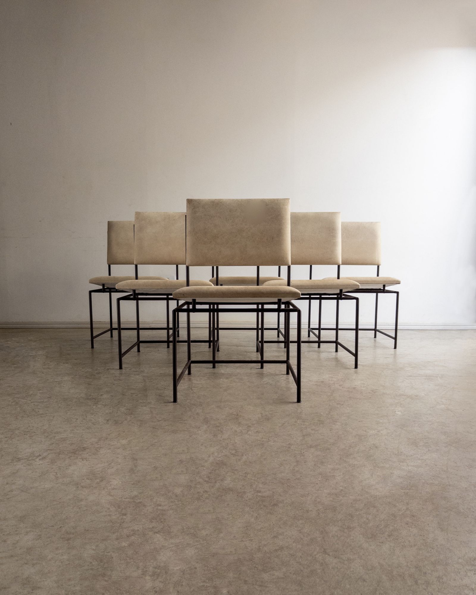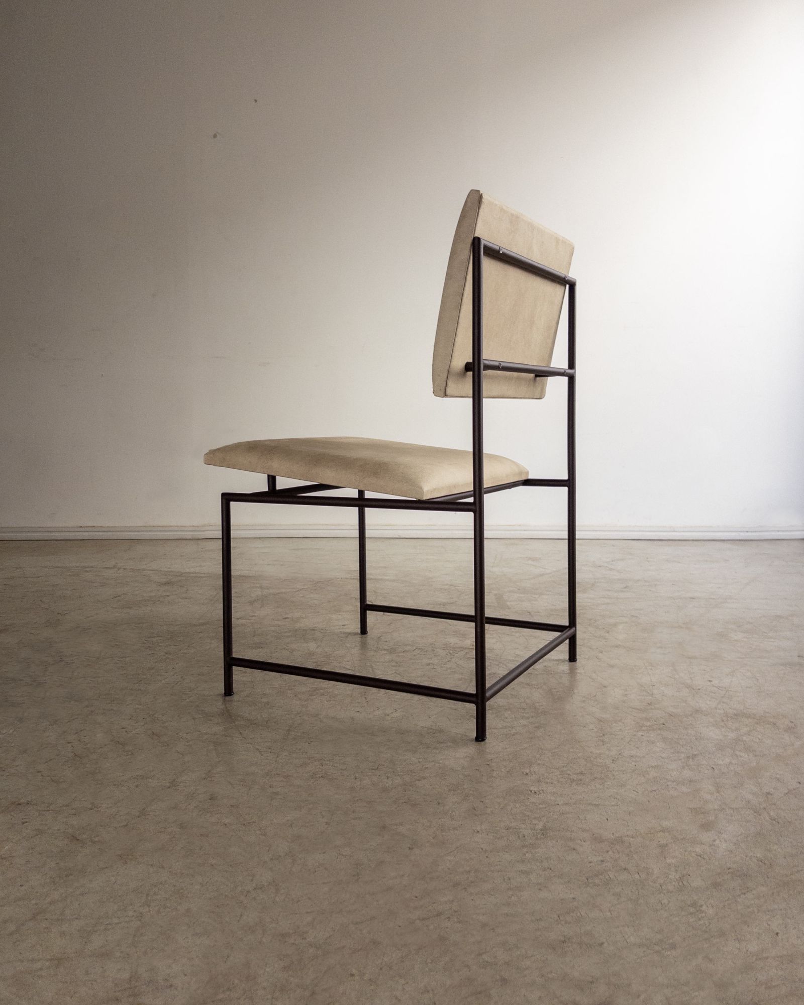 Conjunto de cadeiras com estrutura em ferro, destacando a solução estrutural aparente como elemento principal do desenho. As linhas simples e proporções equilibradas conferem versatilidade para ambientes contemporâneos. Pode apresentar leves marcas do tempo.