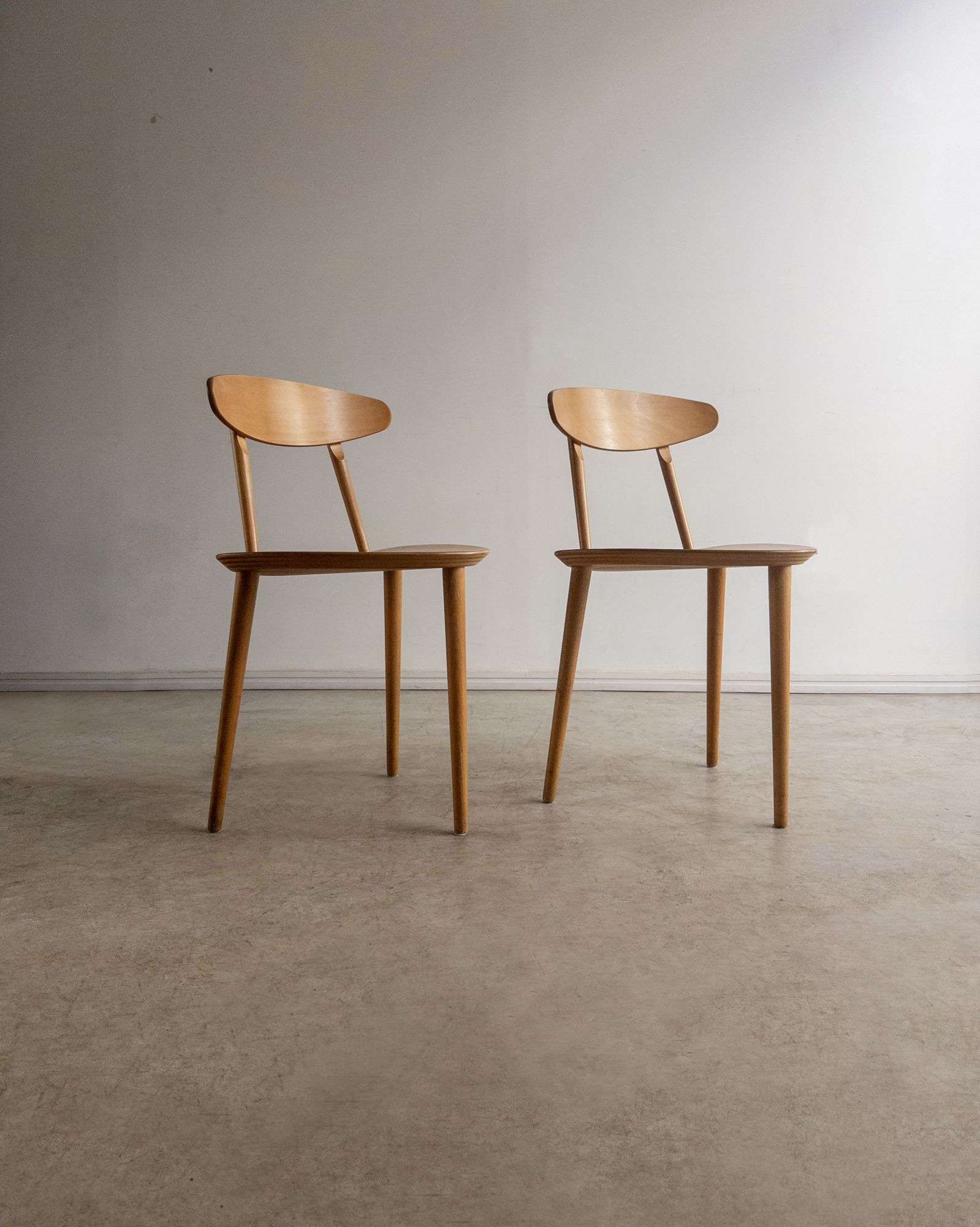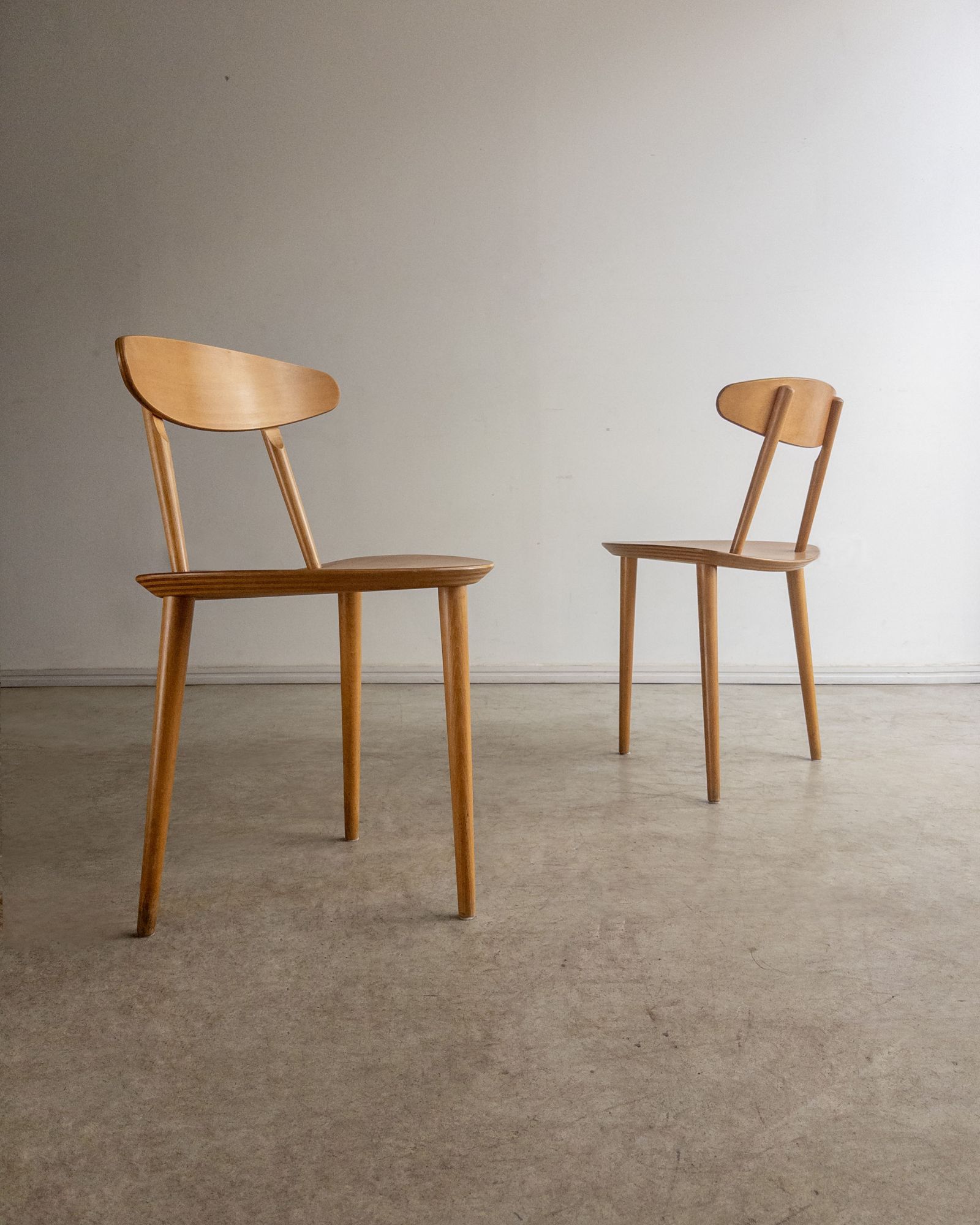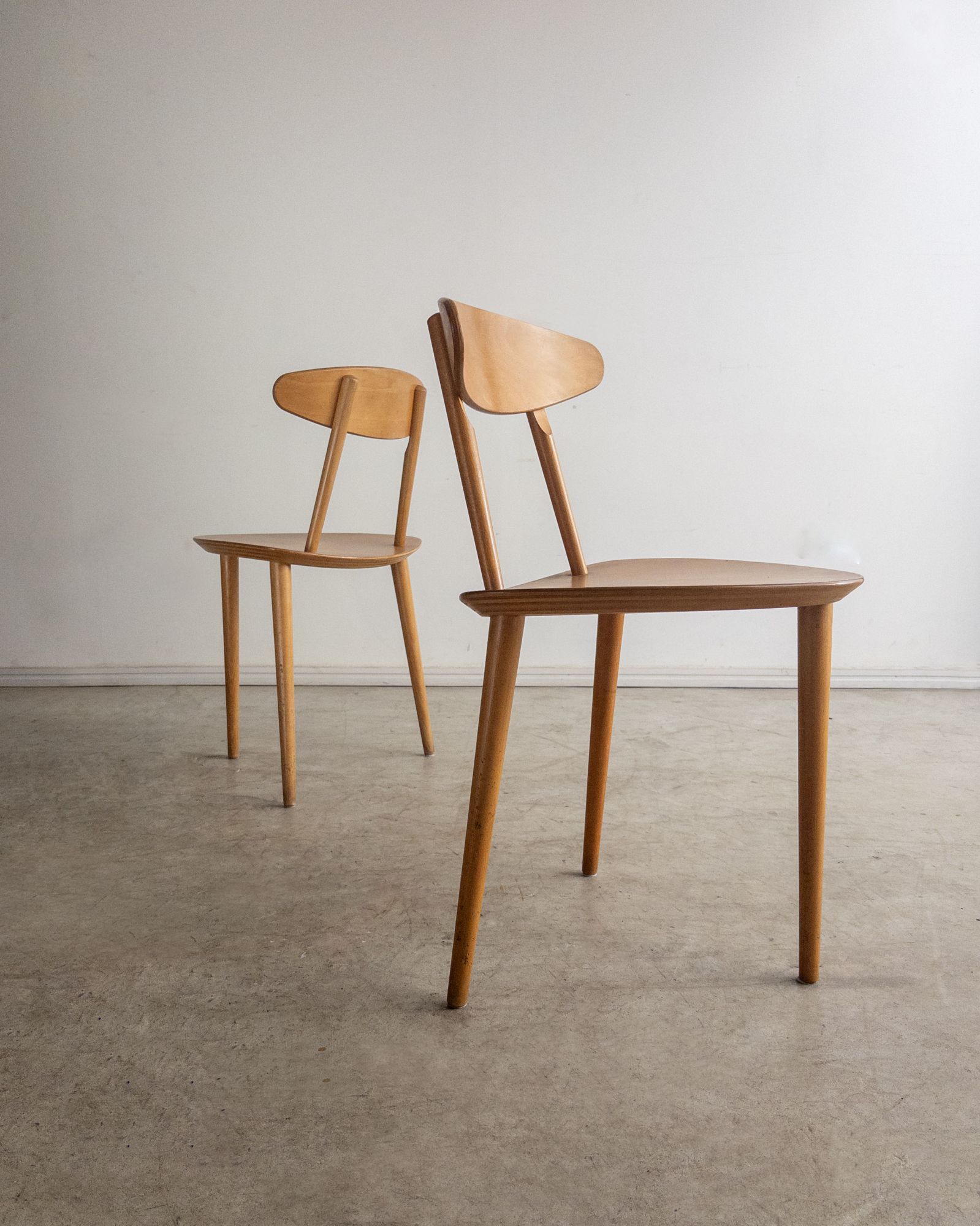 Três cadeiras em faia maciça, com encosto em forma de espaldar retilíneo. Design criado por Poul M. Volther para a dinamarquesa HAY, refletindo o ideal escandinavo de simplicidade e durabilidade. Pode apresentar leves marcas do tempo.