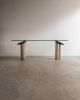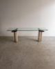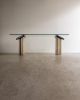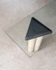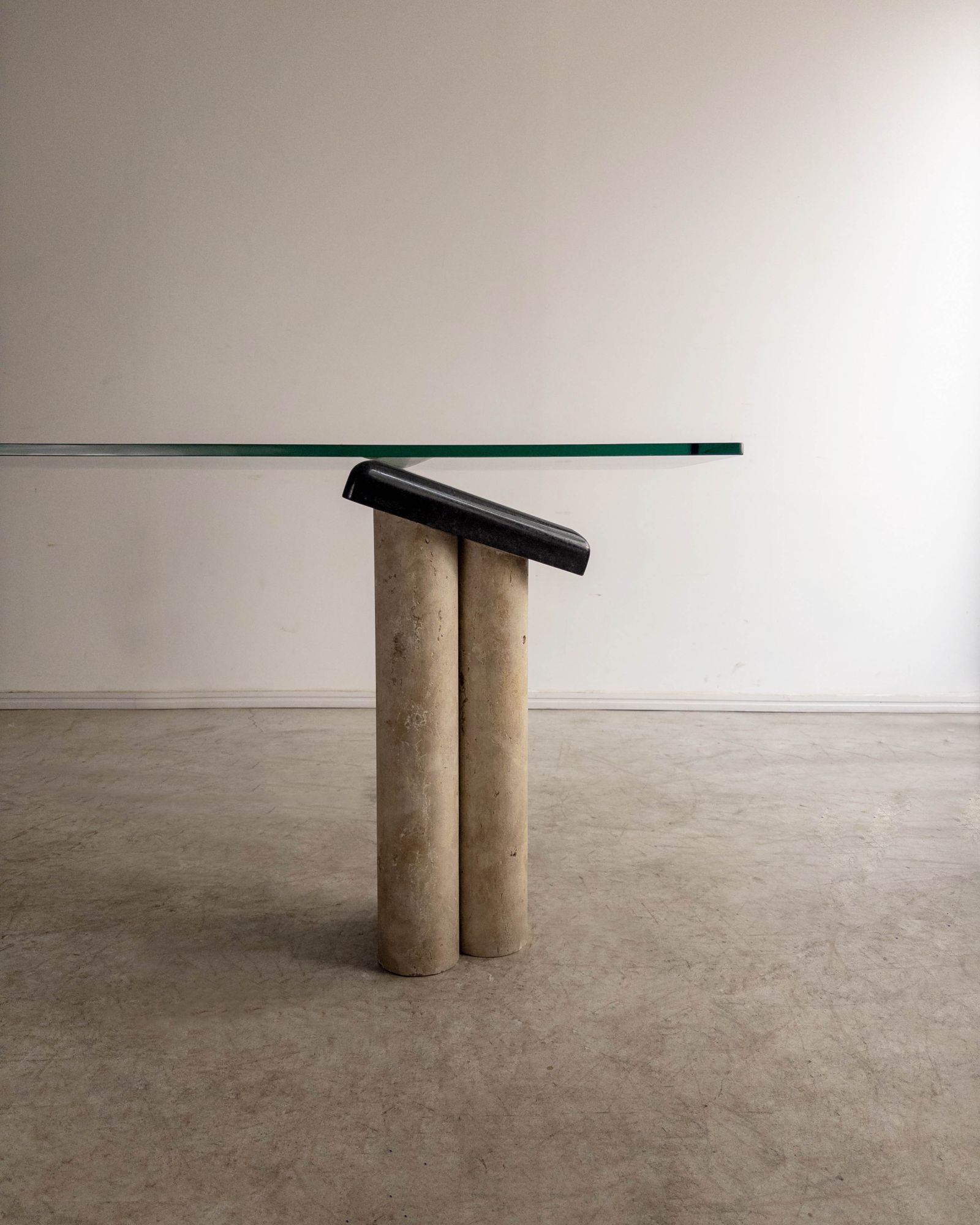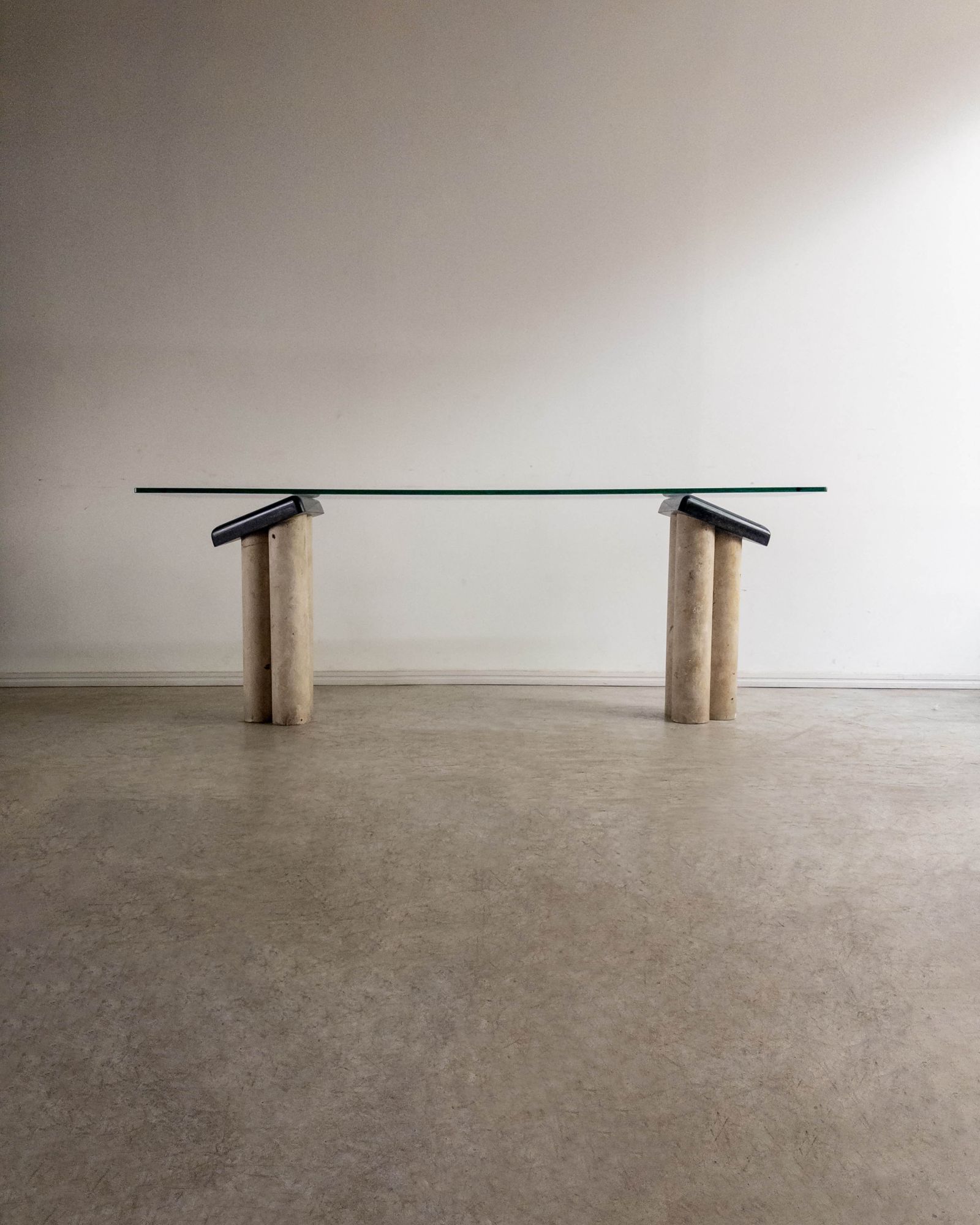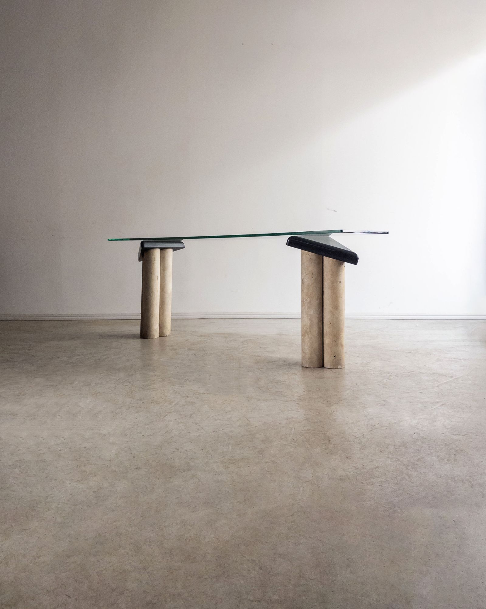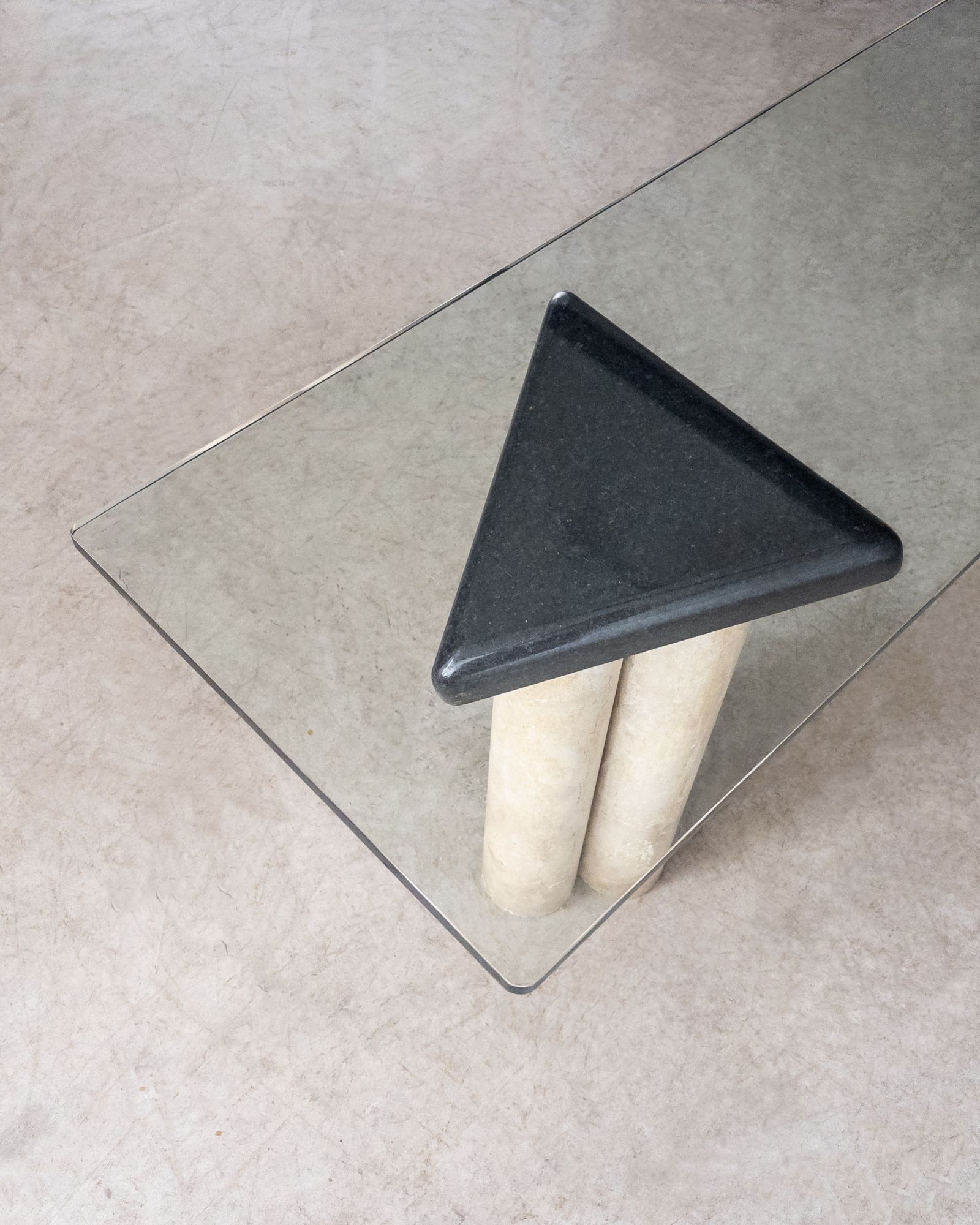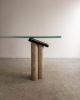 Console com composição de materiais contrastantes: pés em concreto, apoio em mármore e tampo em vidro. O desenho geométrico e a mistura de texturas refletem a estética pós-moderna do período. Pode apresentar leves marcas do tempo.