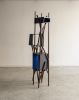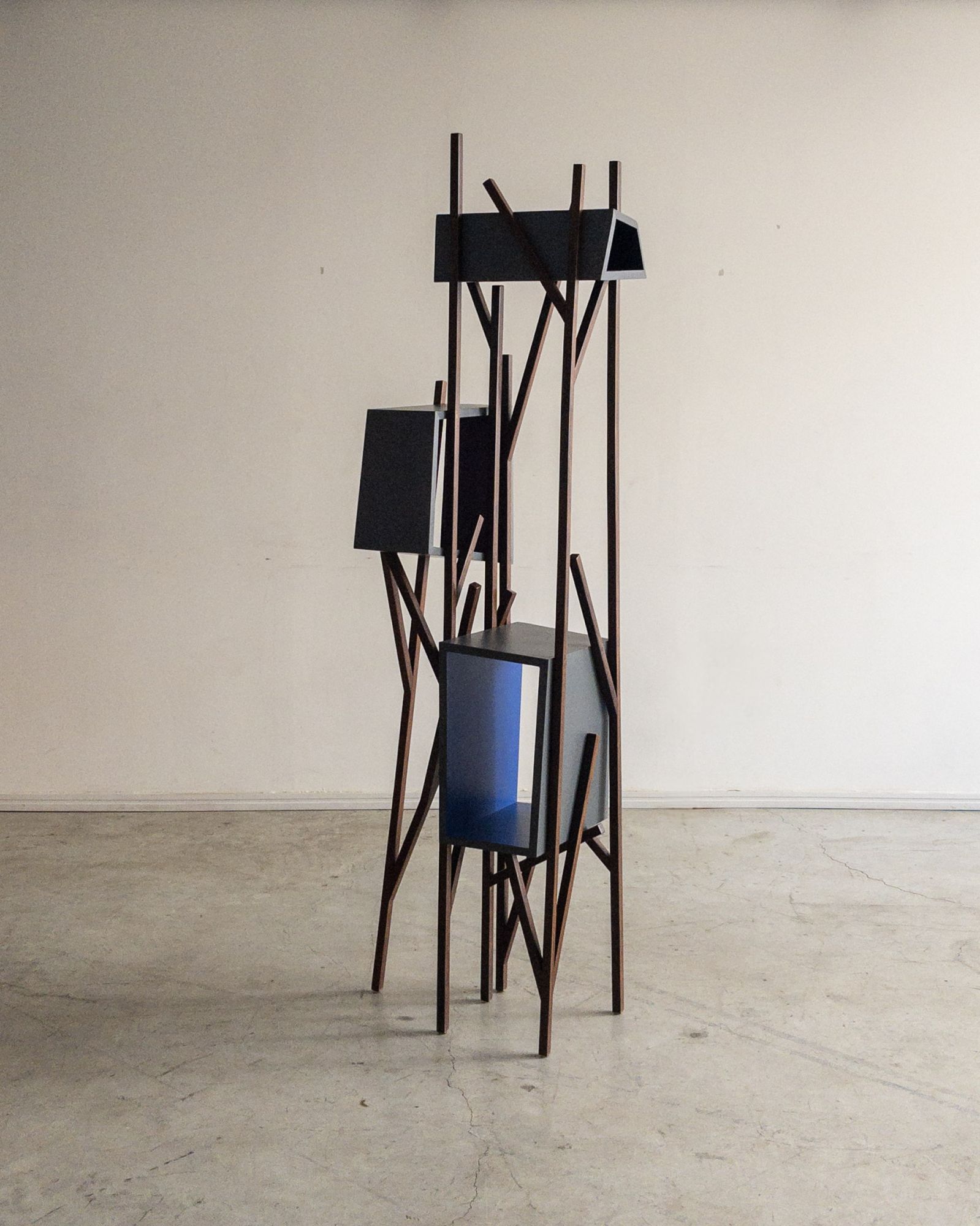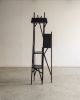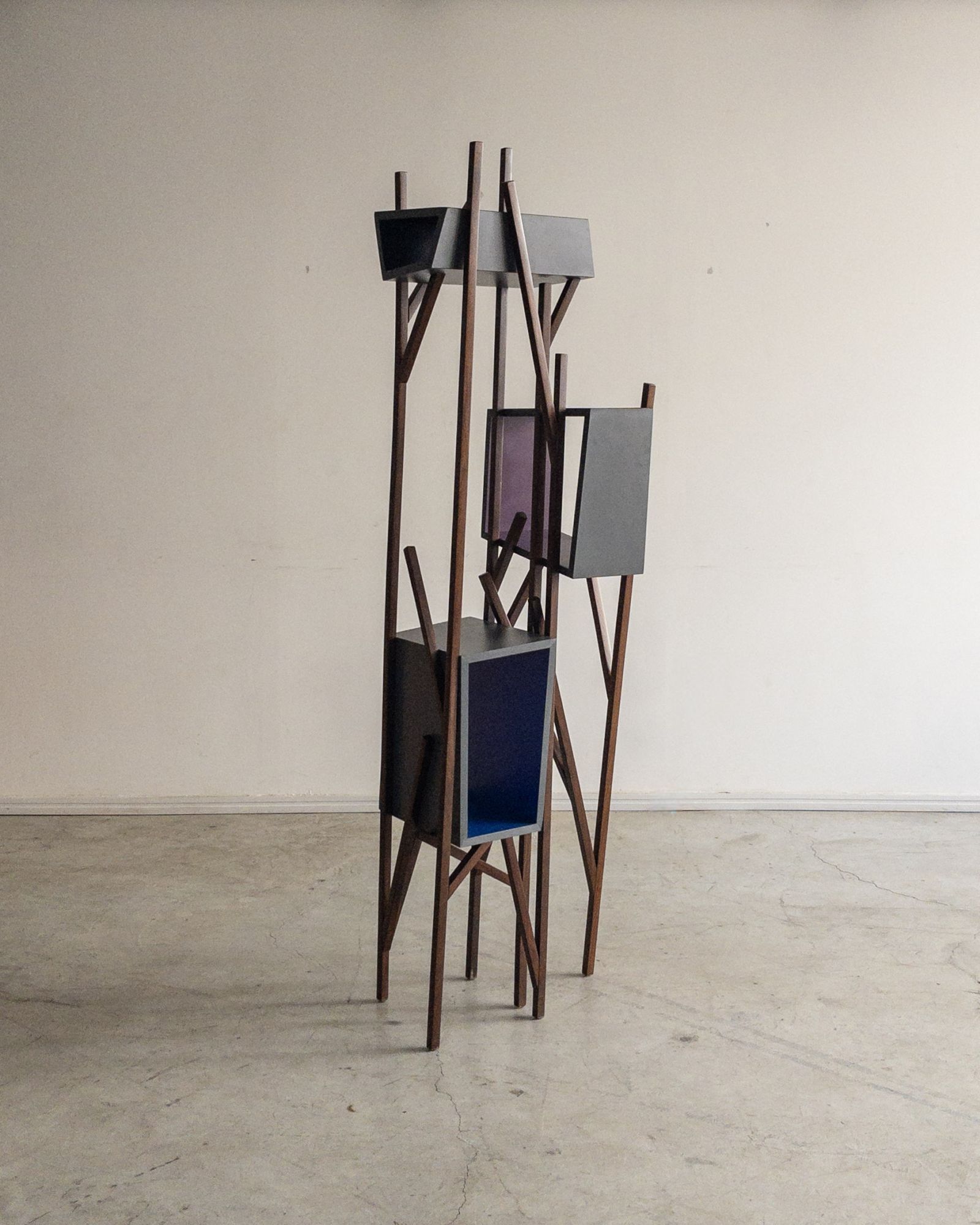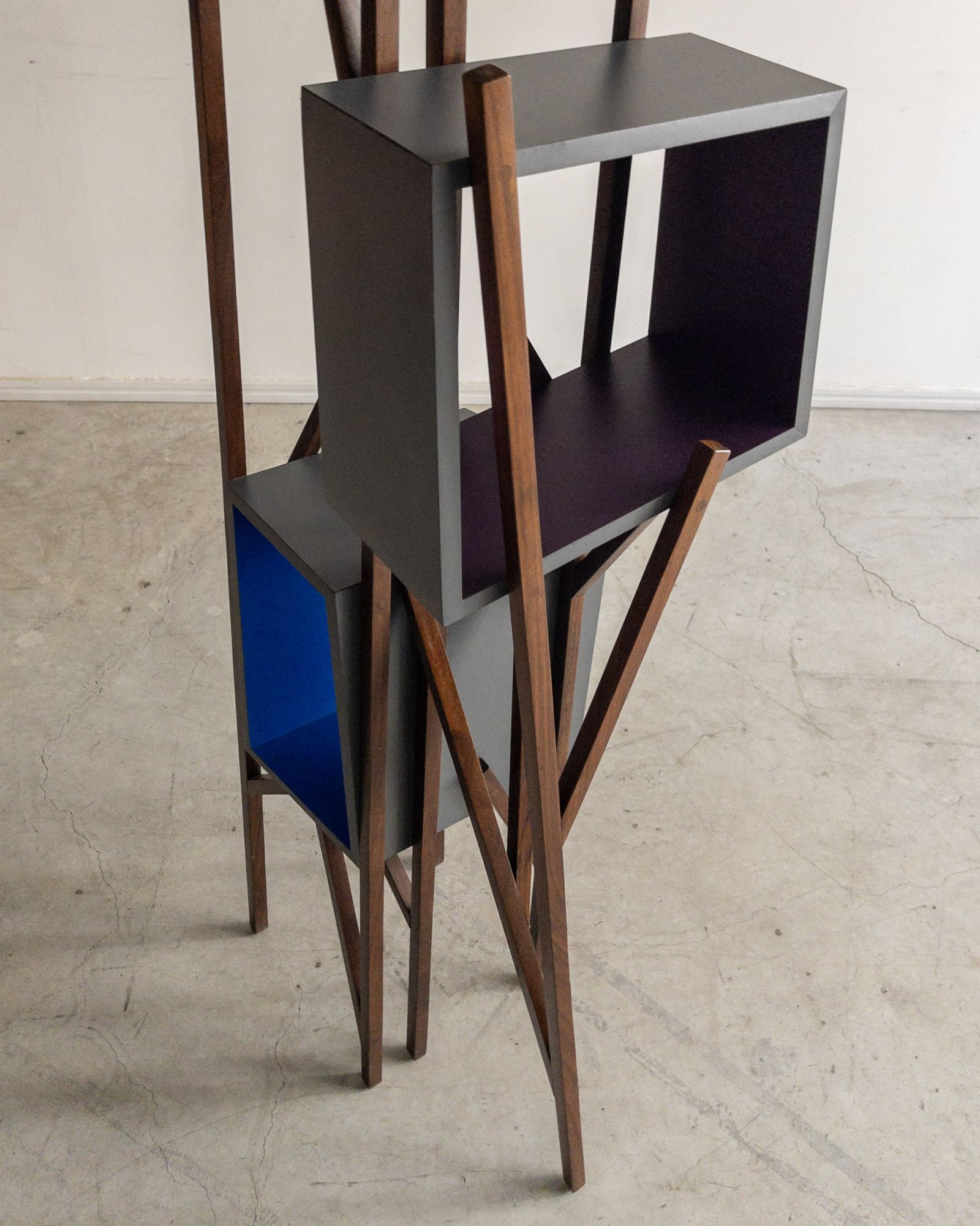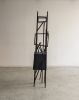 O jacarandá de demolição evidencia o olhar sensível de Paulo Alves para a matéria e para a construção do móvel. A estrutura vertical se ramifica como um desenho orgânico no espaço, formando uma trama de montantes delgados que sustenta nichos geométricos em diferentes alturas, criando ritmo, profundidade e tensão visual.
