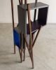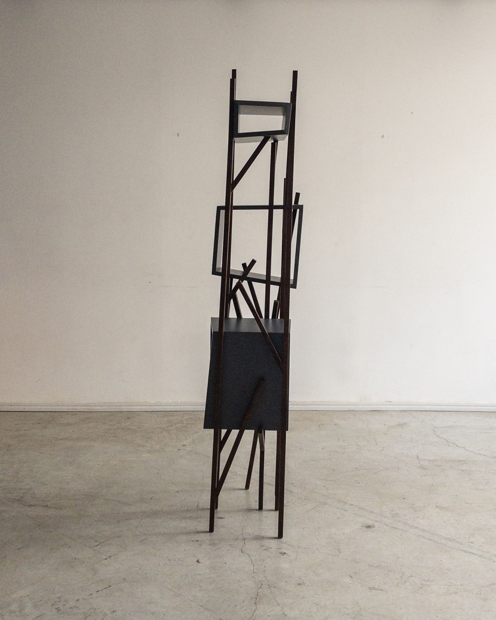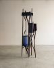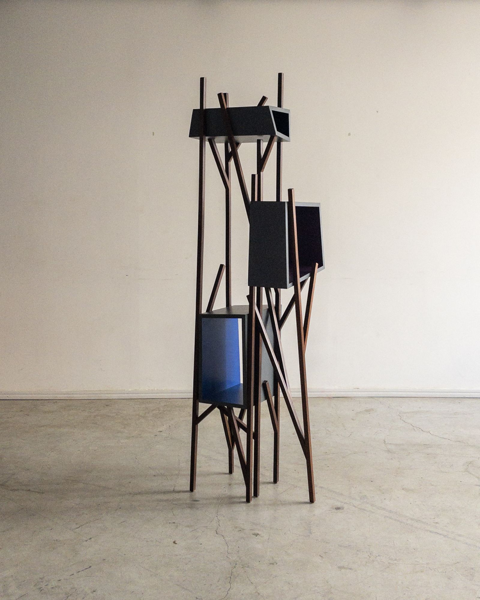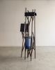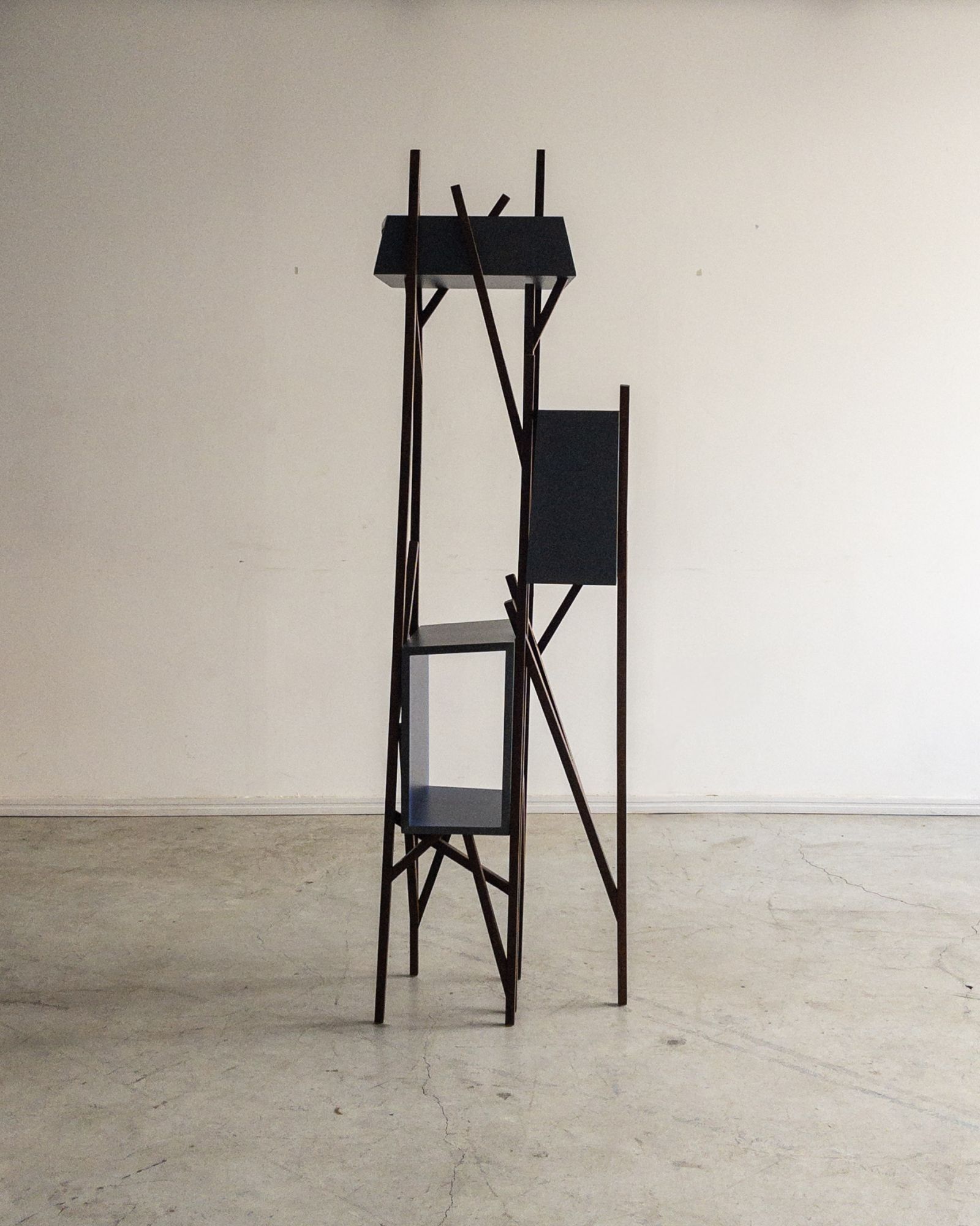 O jacarandá de demolição evidencia o olhar sensível de Paulo Alves para a matéria e para a construção do móvel. A estrutura vertical se ramifica como um desenho orgânico no espaço, formando uma trama de montantes delgados que sustenta nichos geométricos em diferentes alturas, criando ritmo, profundidade e tensão visual.
