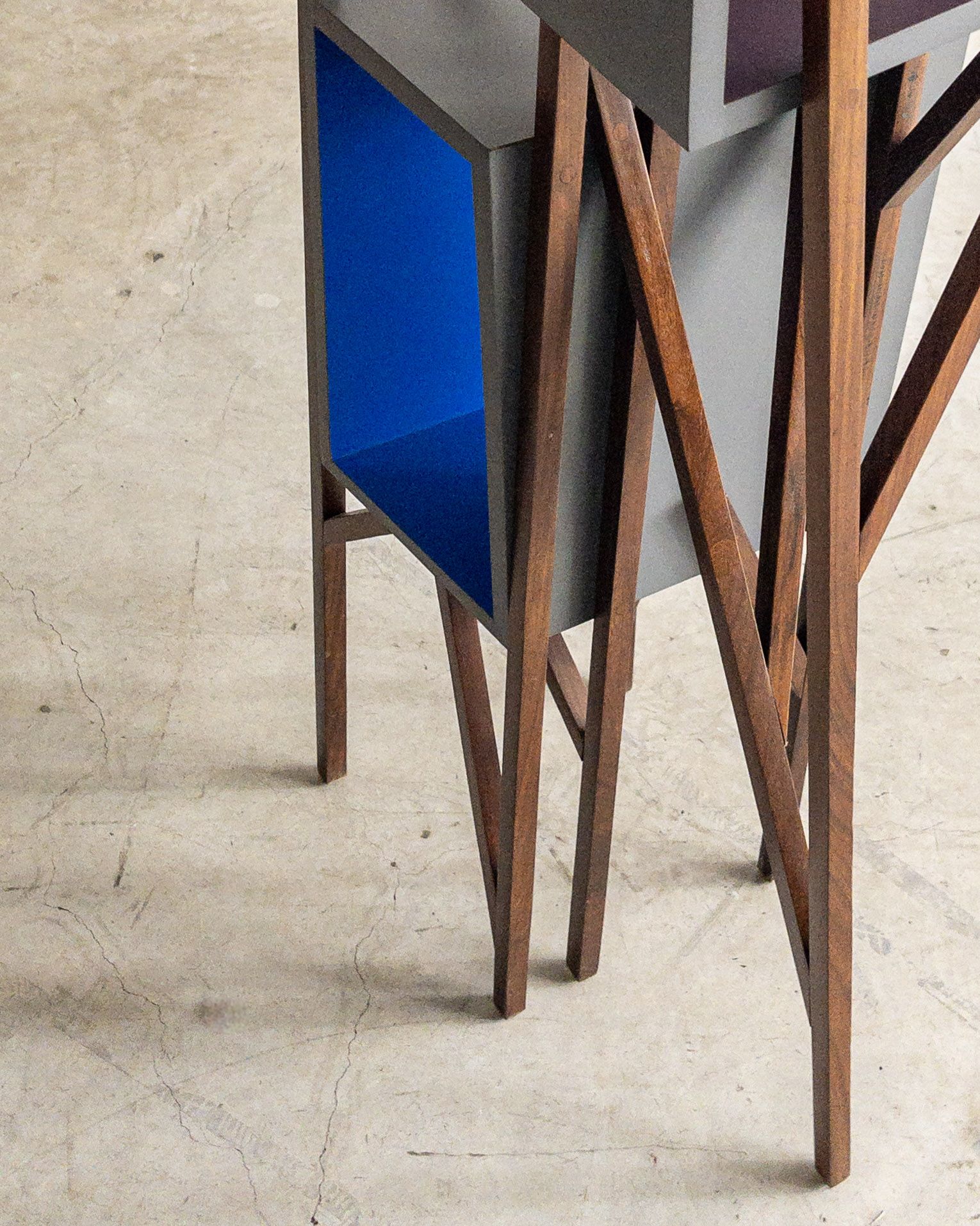Entre arquitetura e escultura, a peça revela o interesse do designer pela expressividade da madeira e pela construção do móvel como gesto estrutural.