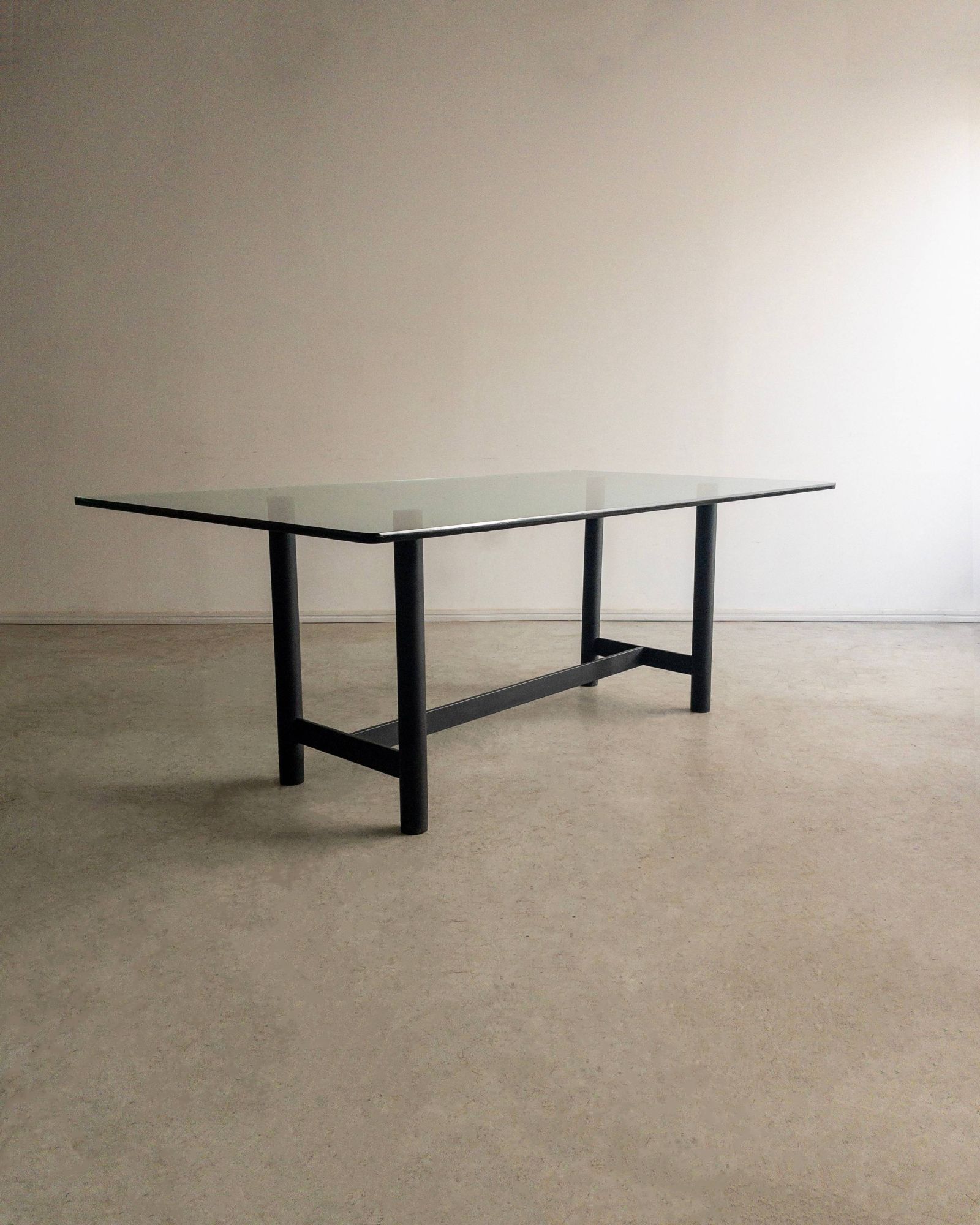 A Mesa de Jantar 'Cencini' foi desenhada por Arthur Casas nos anos 1990 e produzida pela Casas Edições de Design, linha editorial criada pelo próprio arquiteto no início de sua carreira como plataforma para o mobiliário desenvolvido em paralelo aos projetos de interiores. É uma peça do momento em que Casas ainda construía seu vocabulário, antes da expansão internacional do Studio Arthur Casas, e carrega a marca desse período: estruturas diretas, materiais industriais tratados com precisão e legibilidade formal acima de qualquer ornamento.