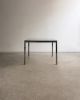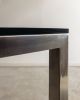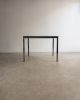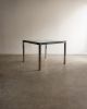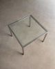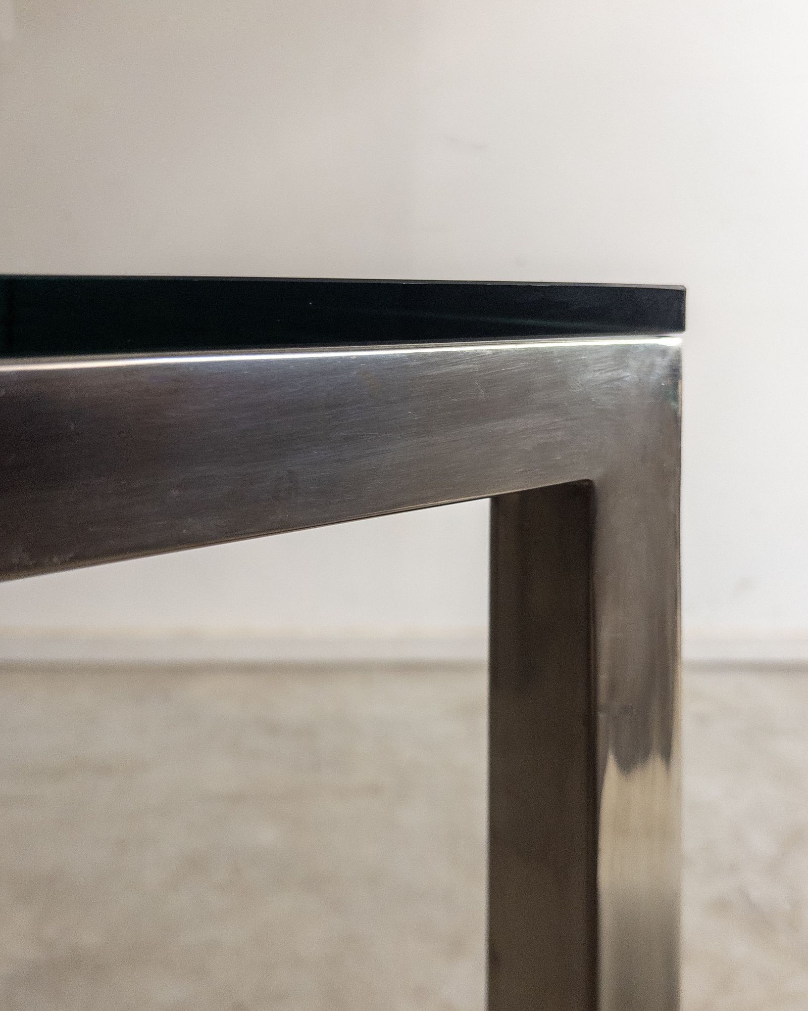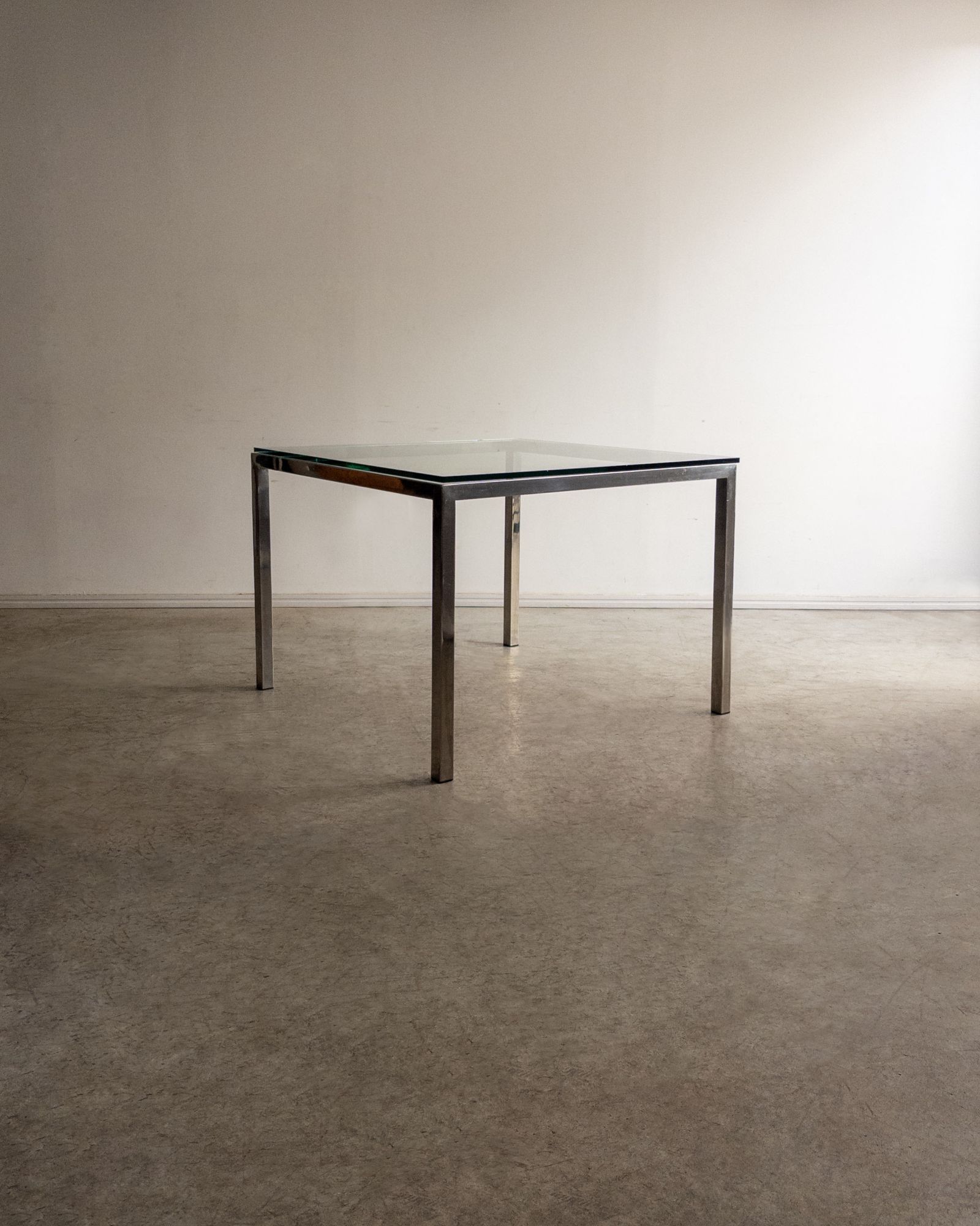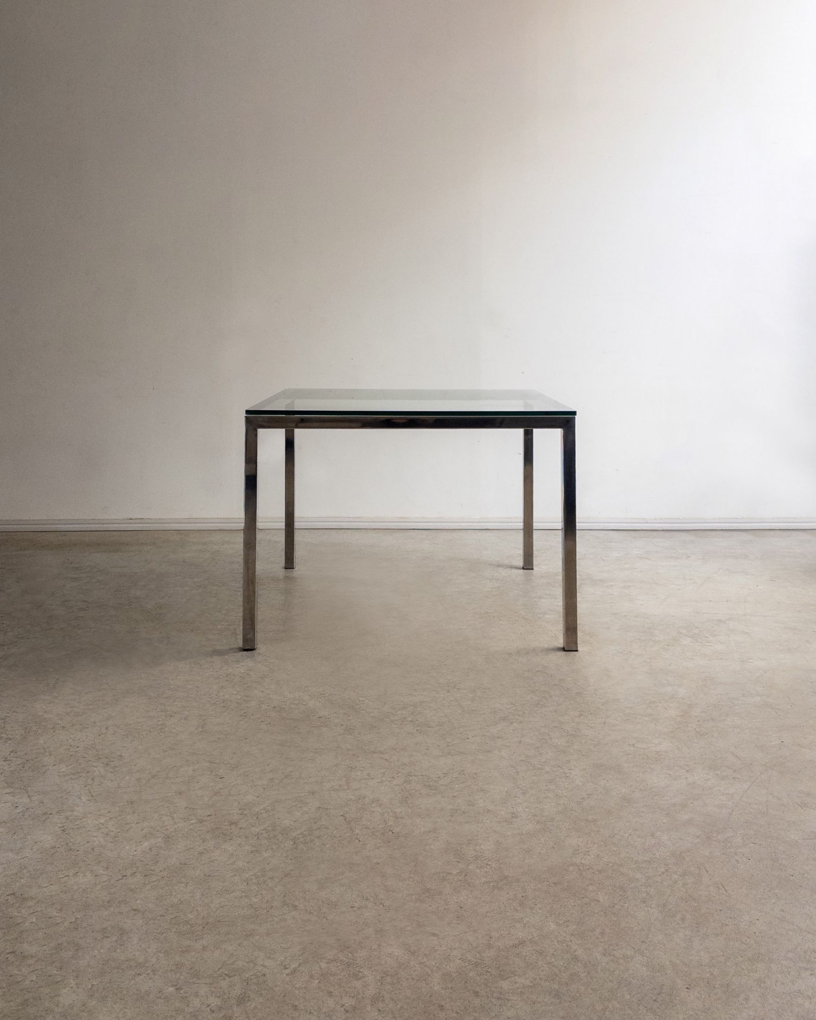 Estrutura em aço inox e tampo em vidro. Desenho direto e quase didático. Poderia estar em um escritório da Florence Knoll, mas está aqui, pronta para resolver a vida real.