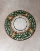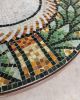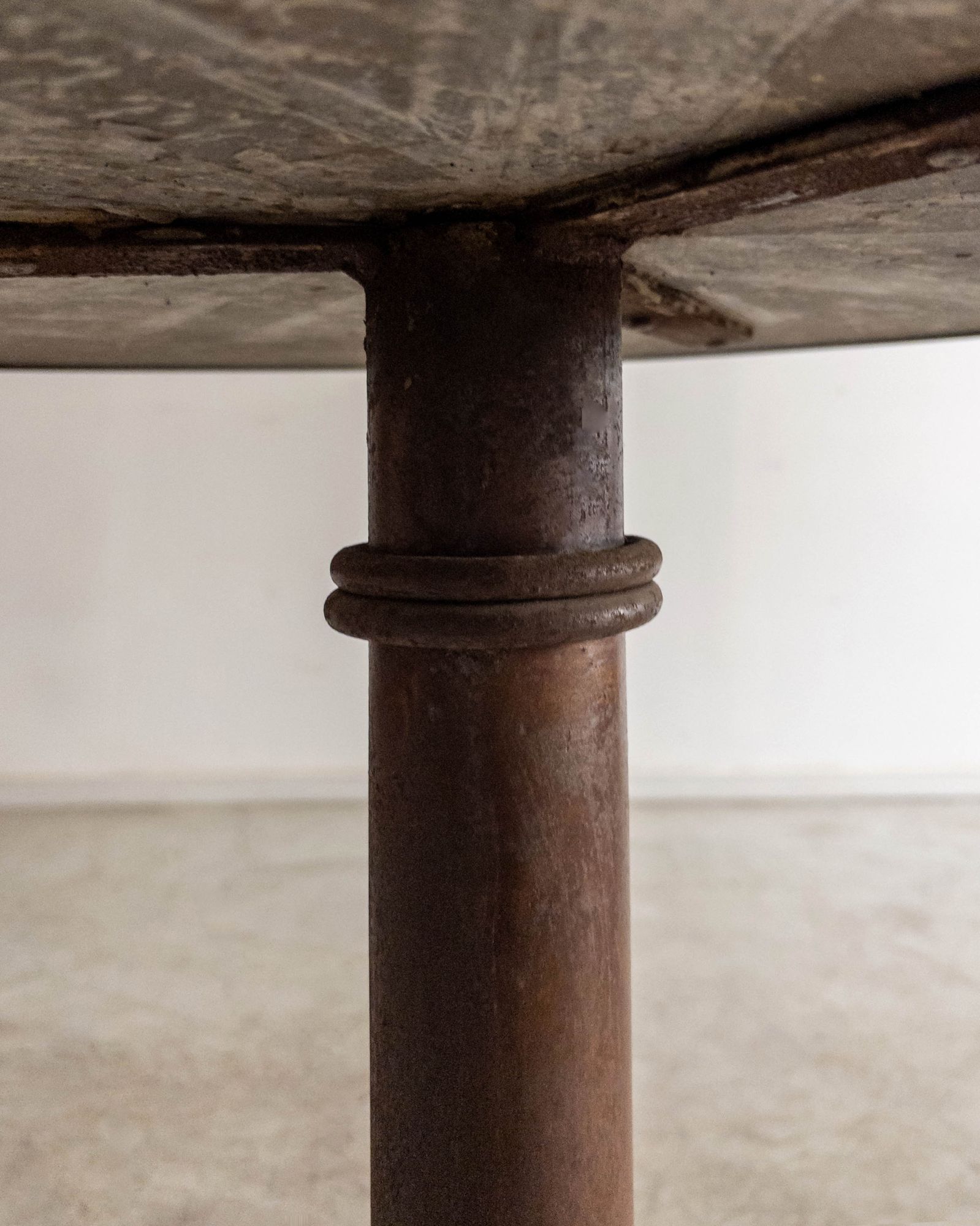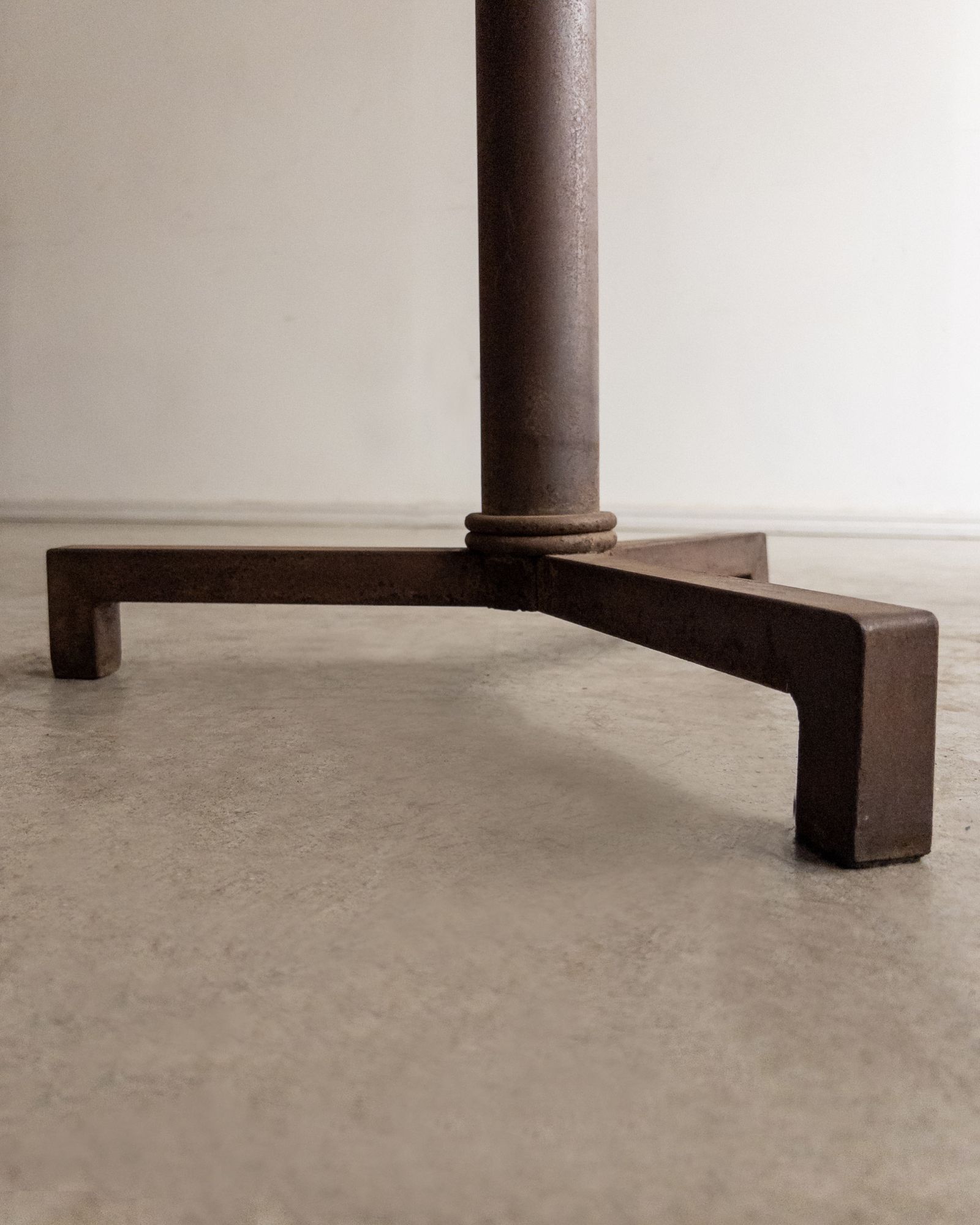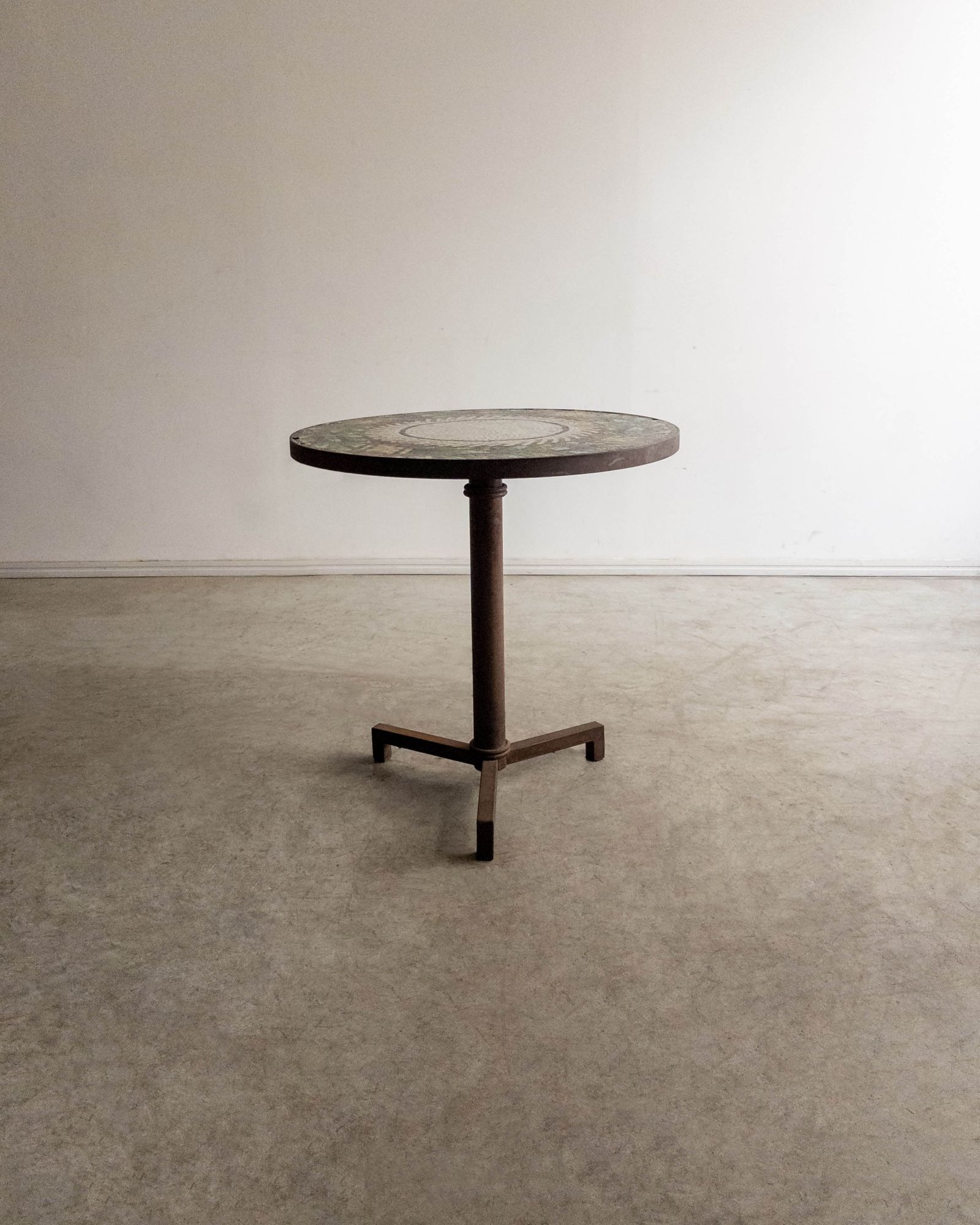Mesa com tampo em mosaico e estrutura em ferro, combinando superfície artesanal e base estrutural simples. O contraste entre textura e estrutura cria uma peça expressiva e versátil. Pode apresentar leves marcas do tempo.