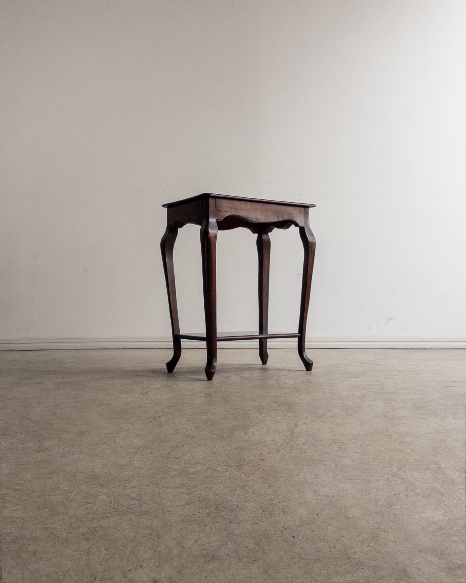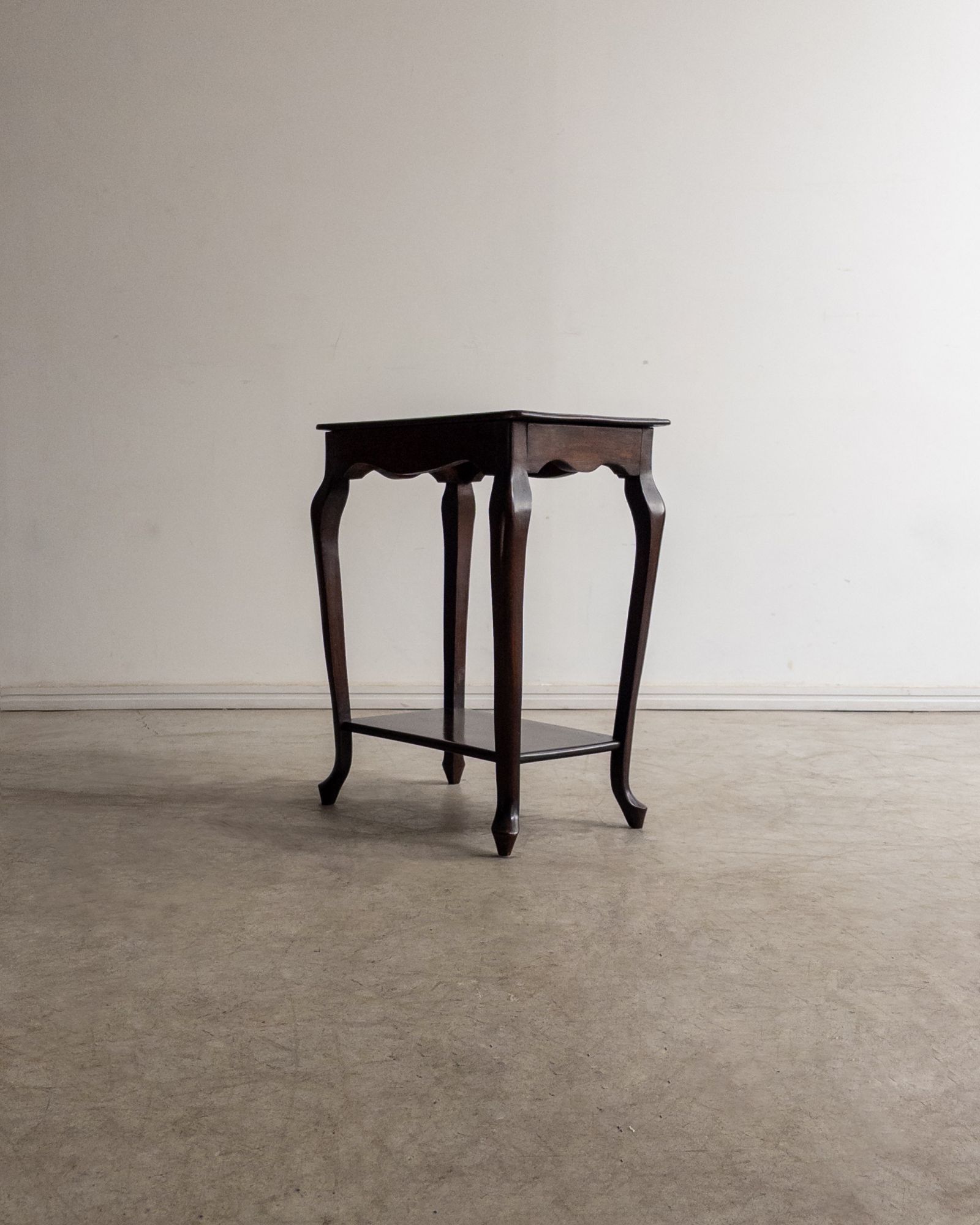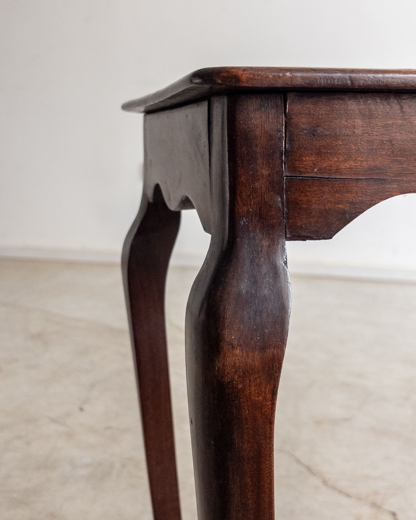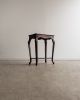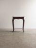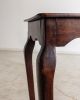 Mesa lateral em madeira maciça, trabalhada manualmente, com tampo retangular de bordas suavemente boleadas e pés curvos que reforçam sua construção artesanal de época. Uma peça de desenho tradicional e proporções delicadas. Pode apresentar leves marcas do tempo.
