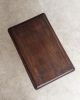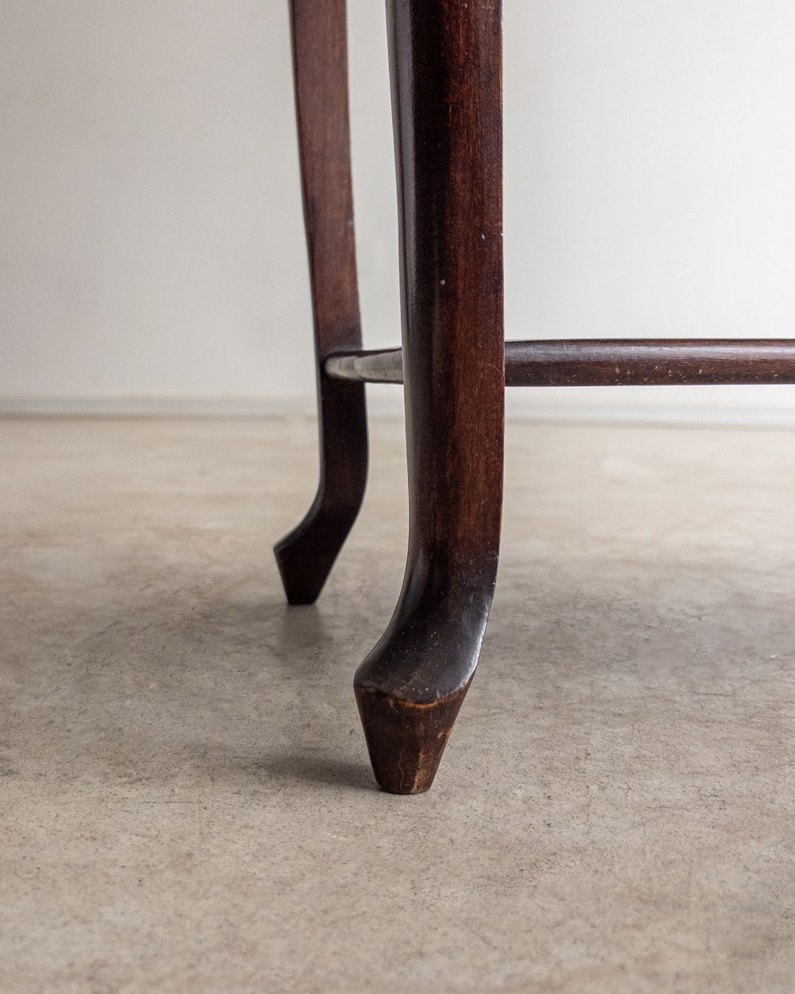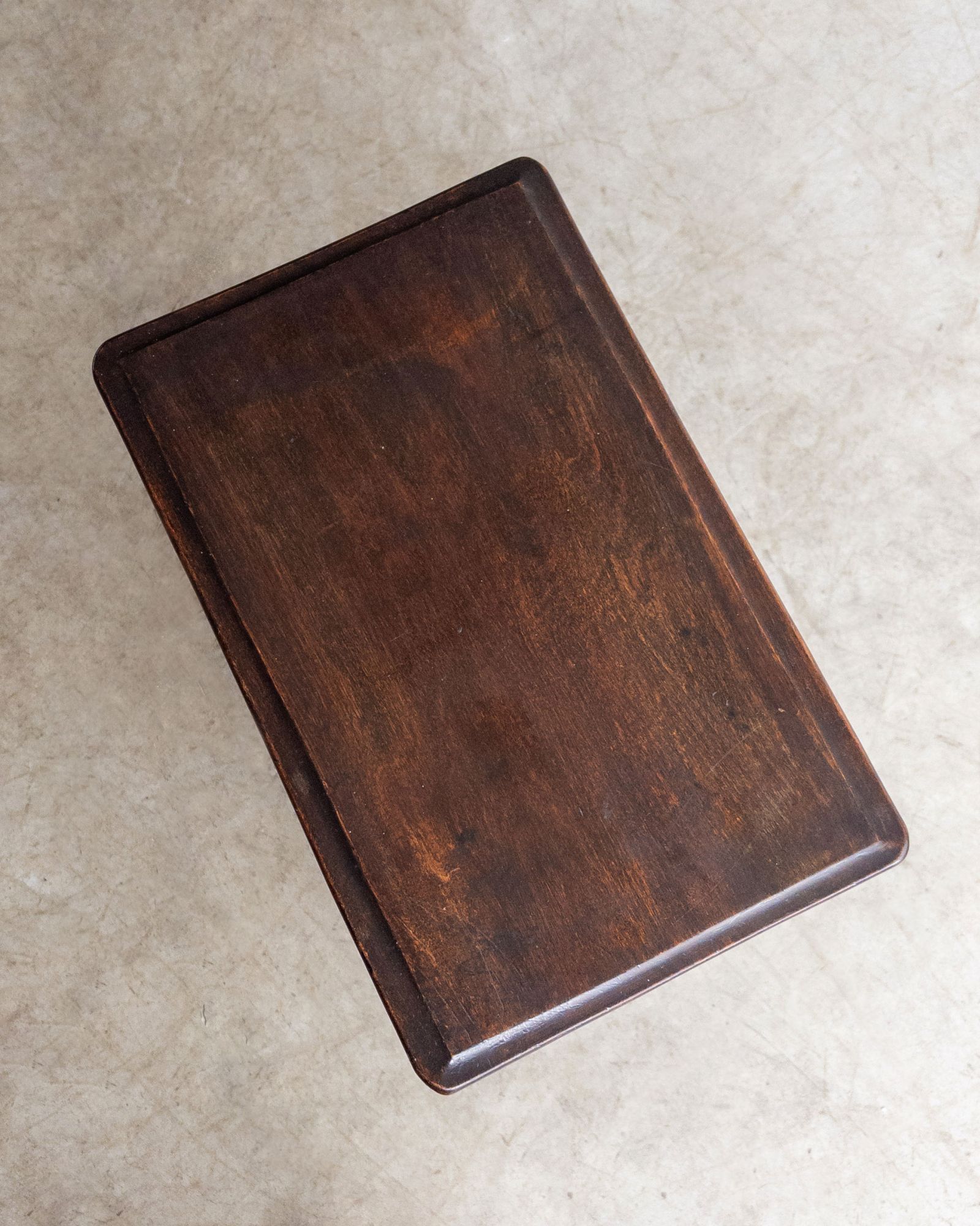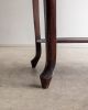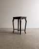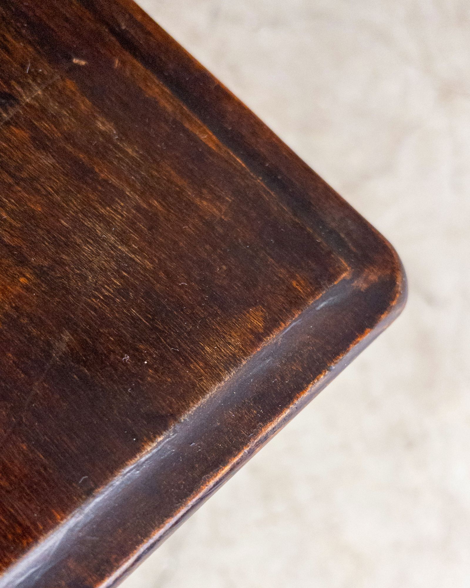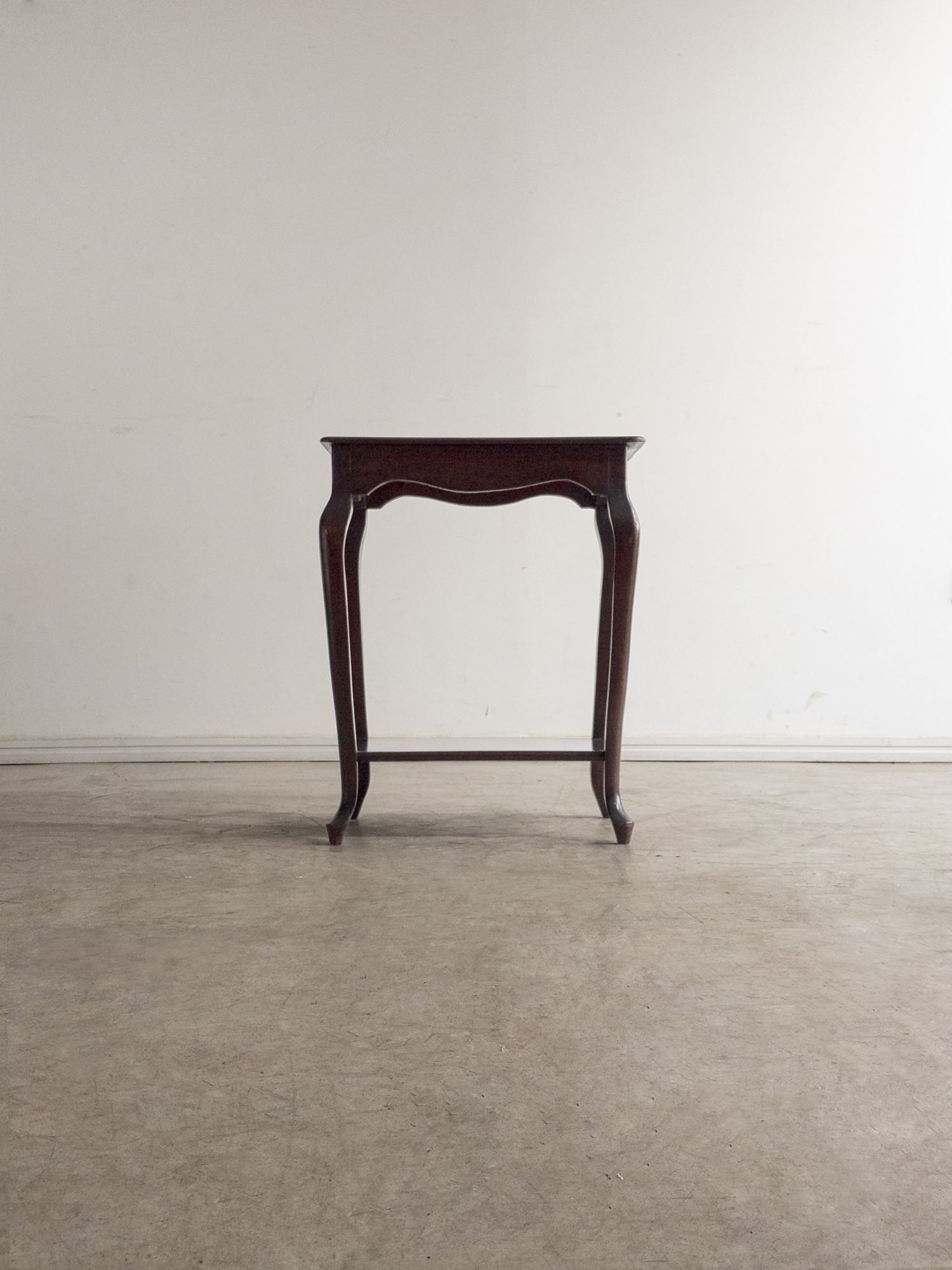 Mesa lateral em madeira maciça, trabalhada manualmente, com tampo retangular de bordas suavemente boleadas e pés curvos que reforçam sua construção artesanal de época. Uma peça de desenho tradicional e proporções delicadas. Pode apresentar leves marcas do tempo.