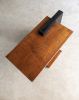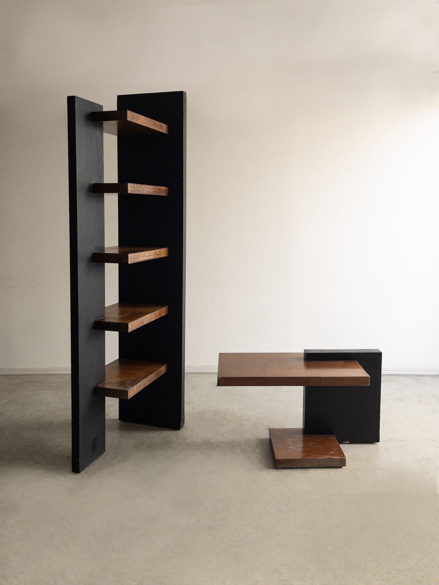 Mesa lateral com volumetria geométrica e composição assimétrica inspirada no construtivismo. Estrutura em madeira revestida em rádica de imbuia, destacando o desenho arquitetônico da peça. Pode apresentar leves marcas do tempo.