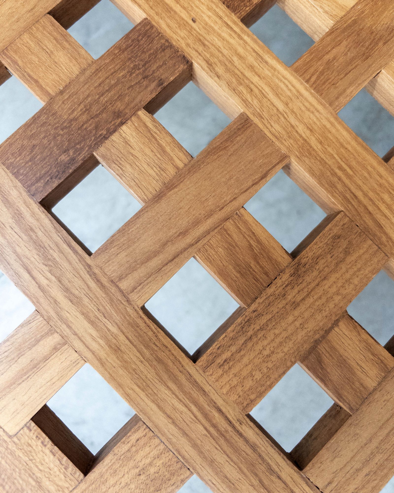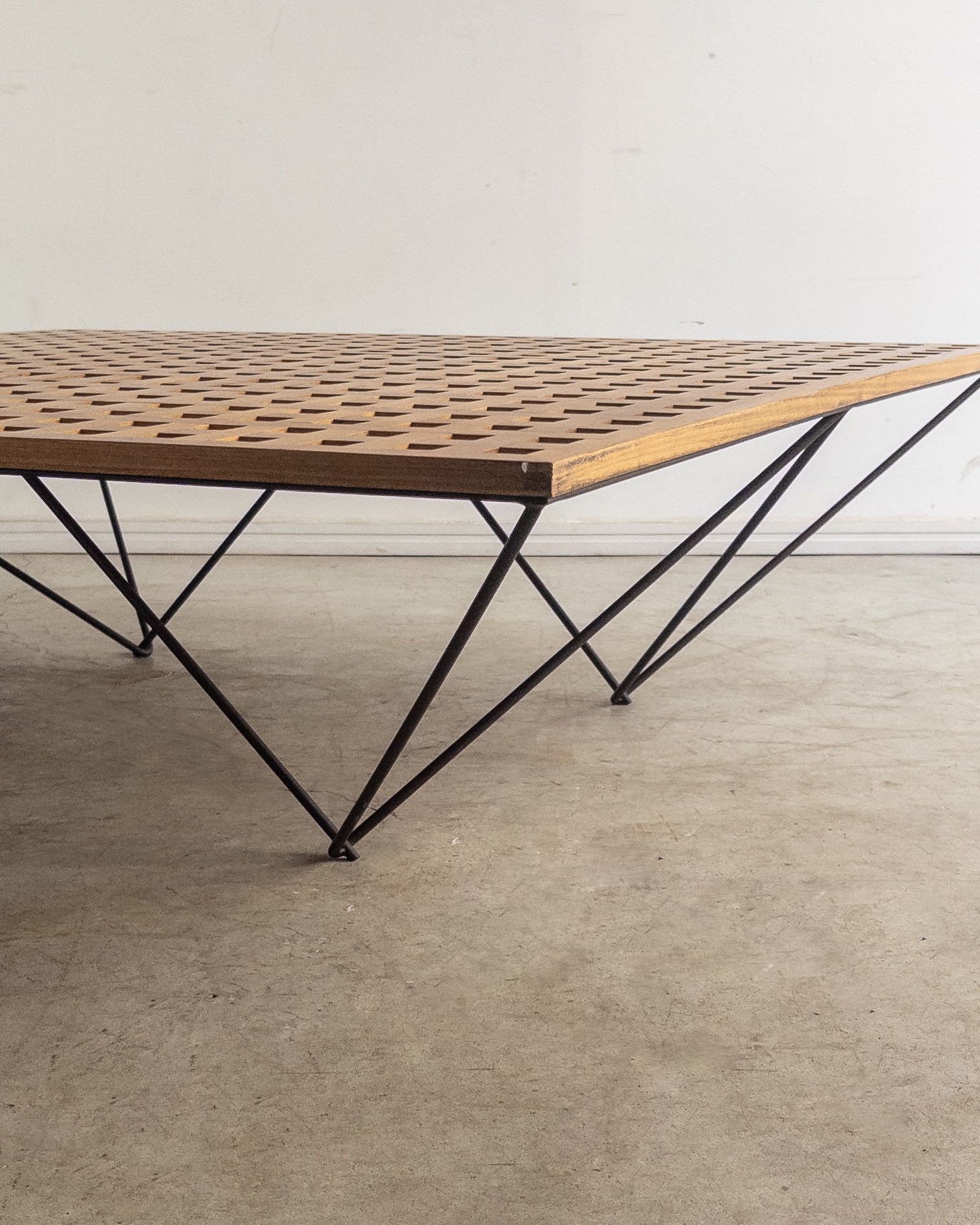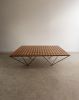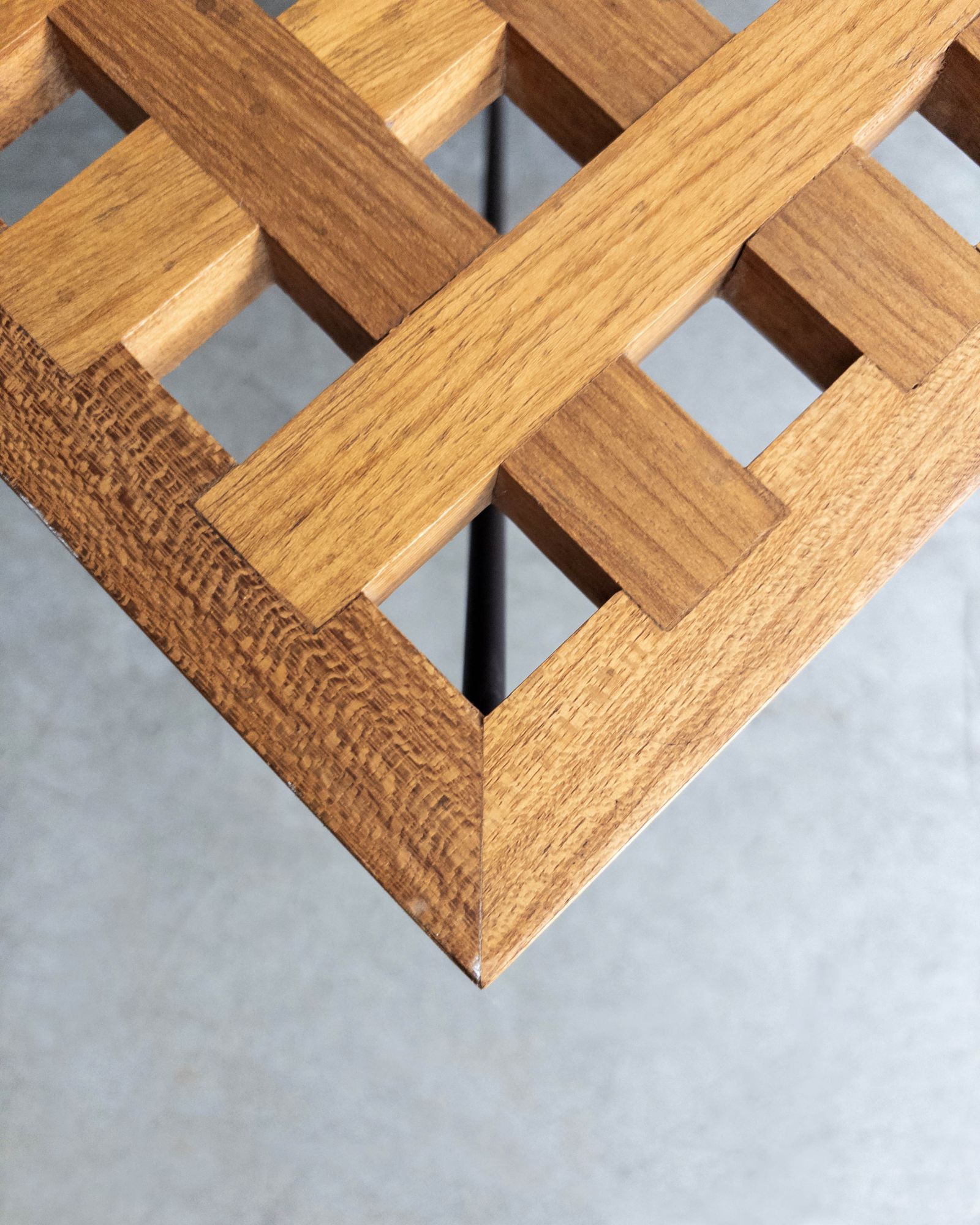Estrutura leve e bem resolvida com tampo em madeira freijó tramada em padrão muxarabi e base geométrica em metal pintado. Uma peça de desenho limpo e proporções amplas. Pode apresentar leves marcas do tempo.