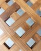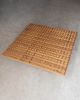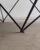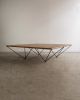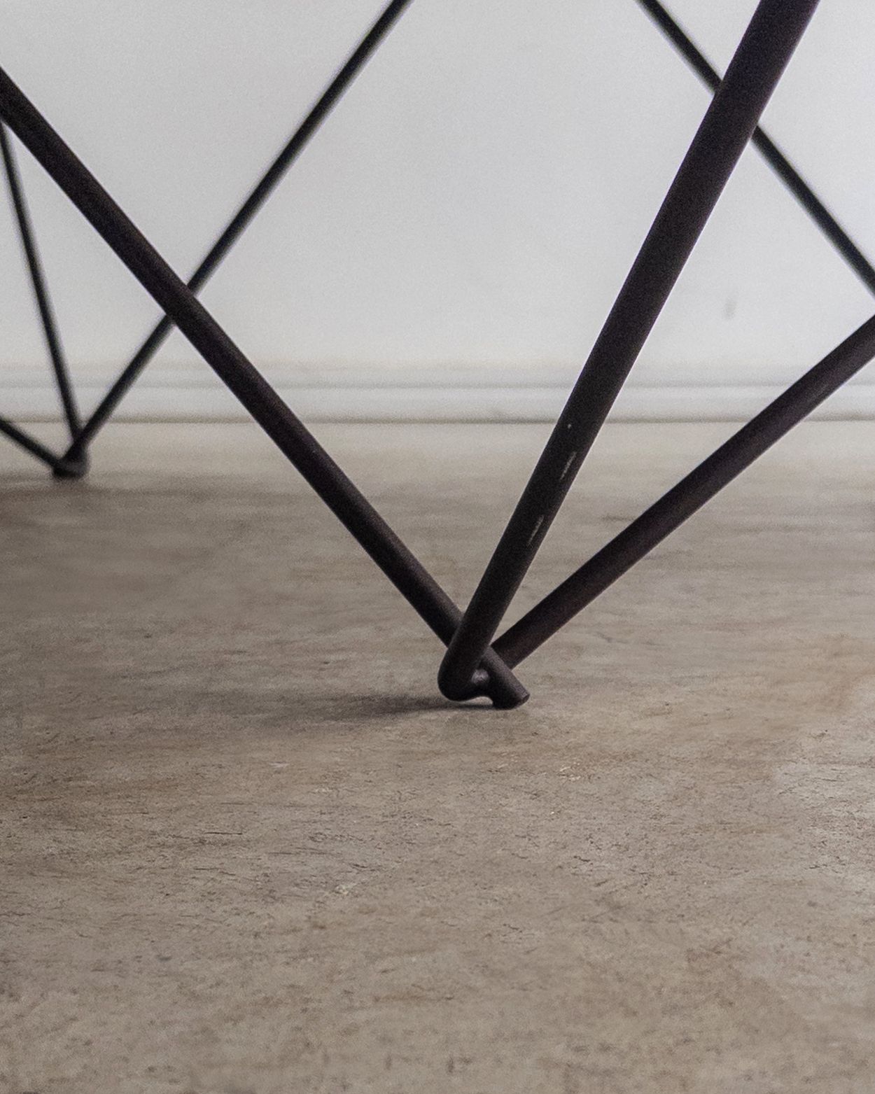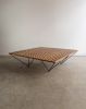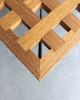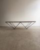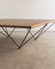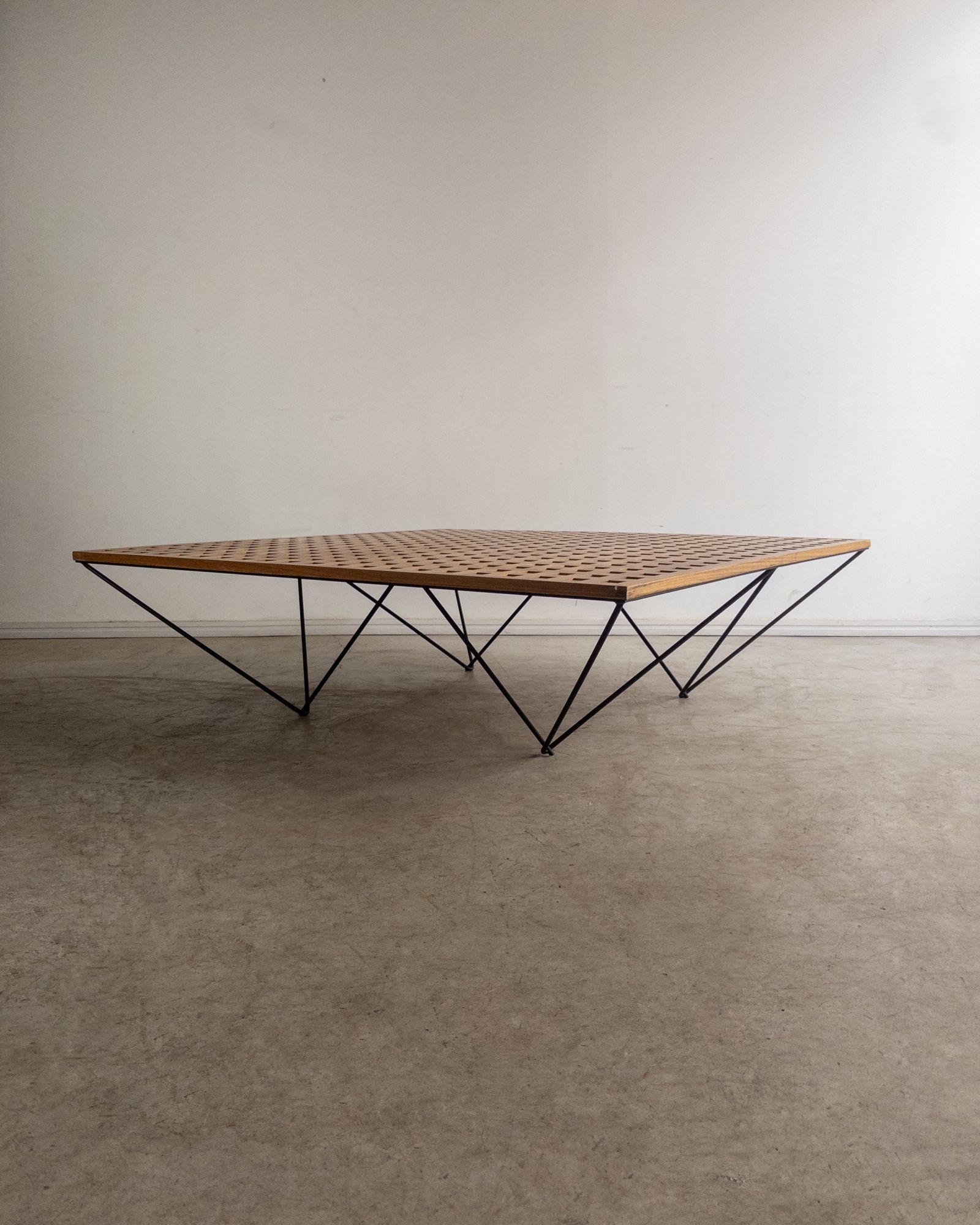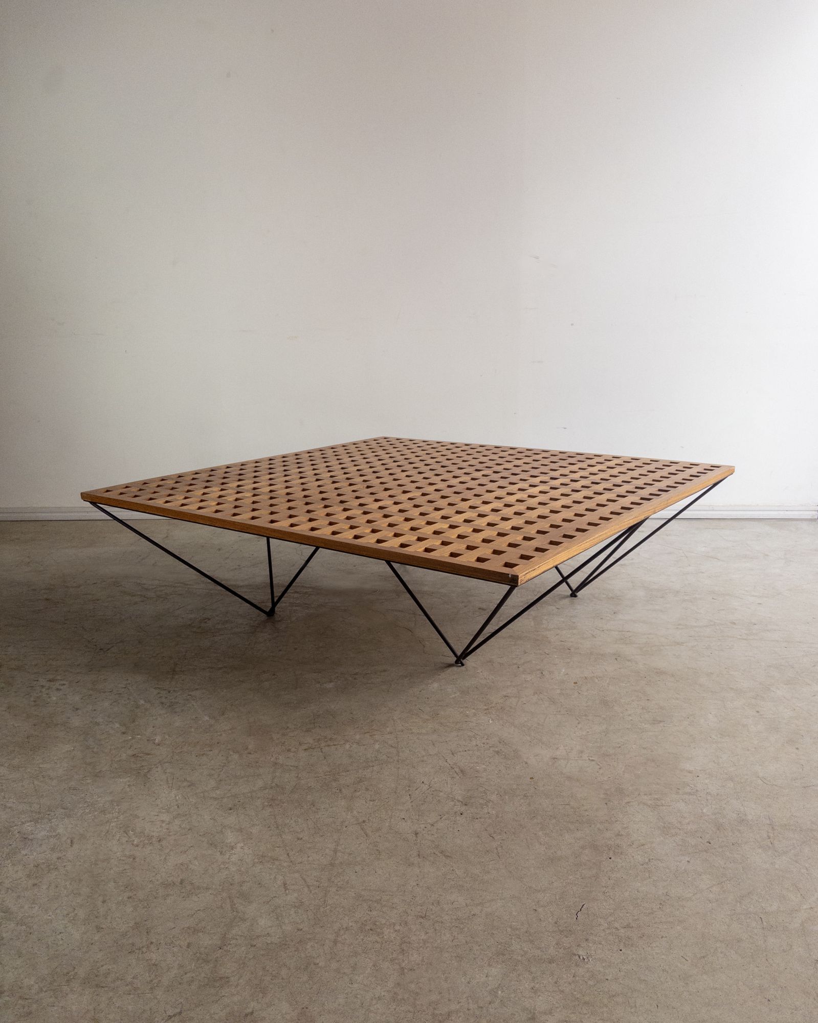 Estrutura leve e bem resolvida com tampo em madeira freijó tramada em padrão muxarabi e base geométrica em metal pintado. Uma peça de desenho limpo e proporções amplas. Pode apresentar leves marcas do tempo.