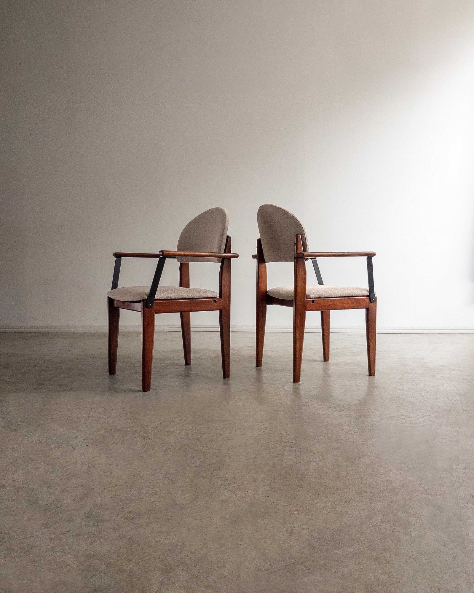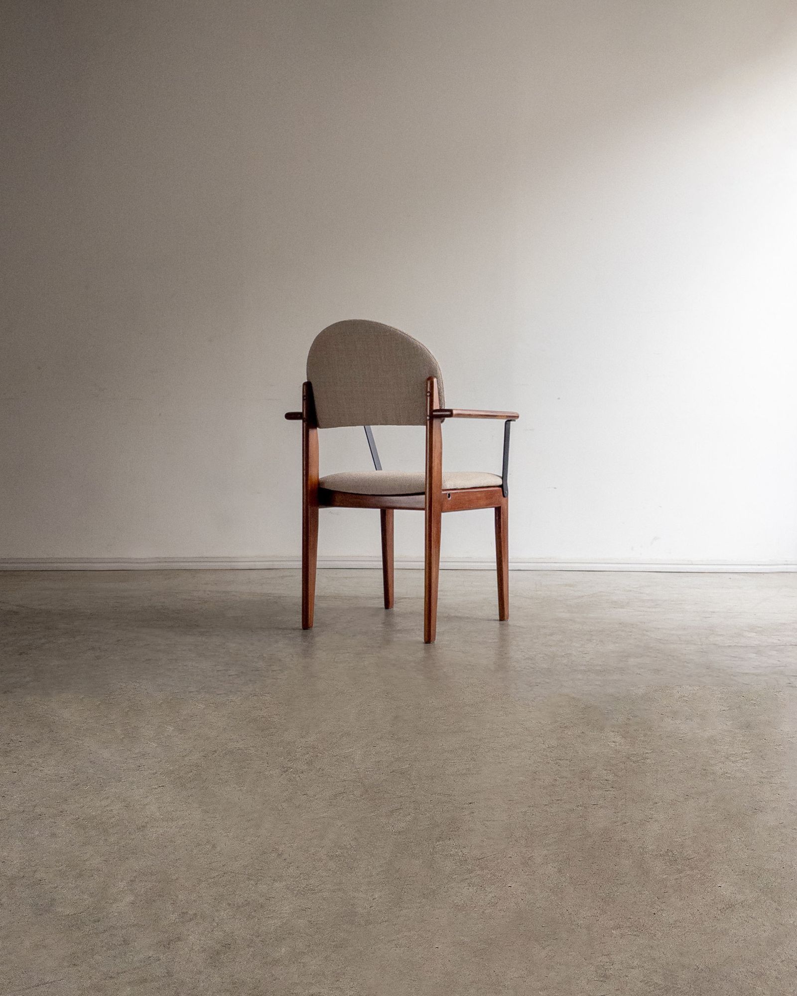 O interesse da peça está nesse diálogo entre materiais. A madeira define o volume principal, enquanto o metal desenha uma linha mais leve e gráfica nas laterais. O resultado é uma cadeira que mantém a solidez do conjunto, mas com maior abertura visual.