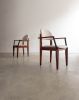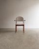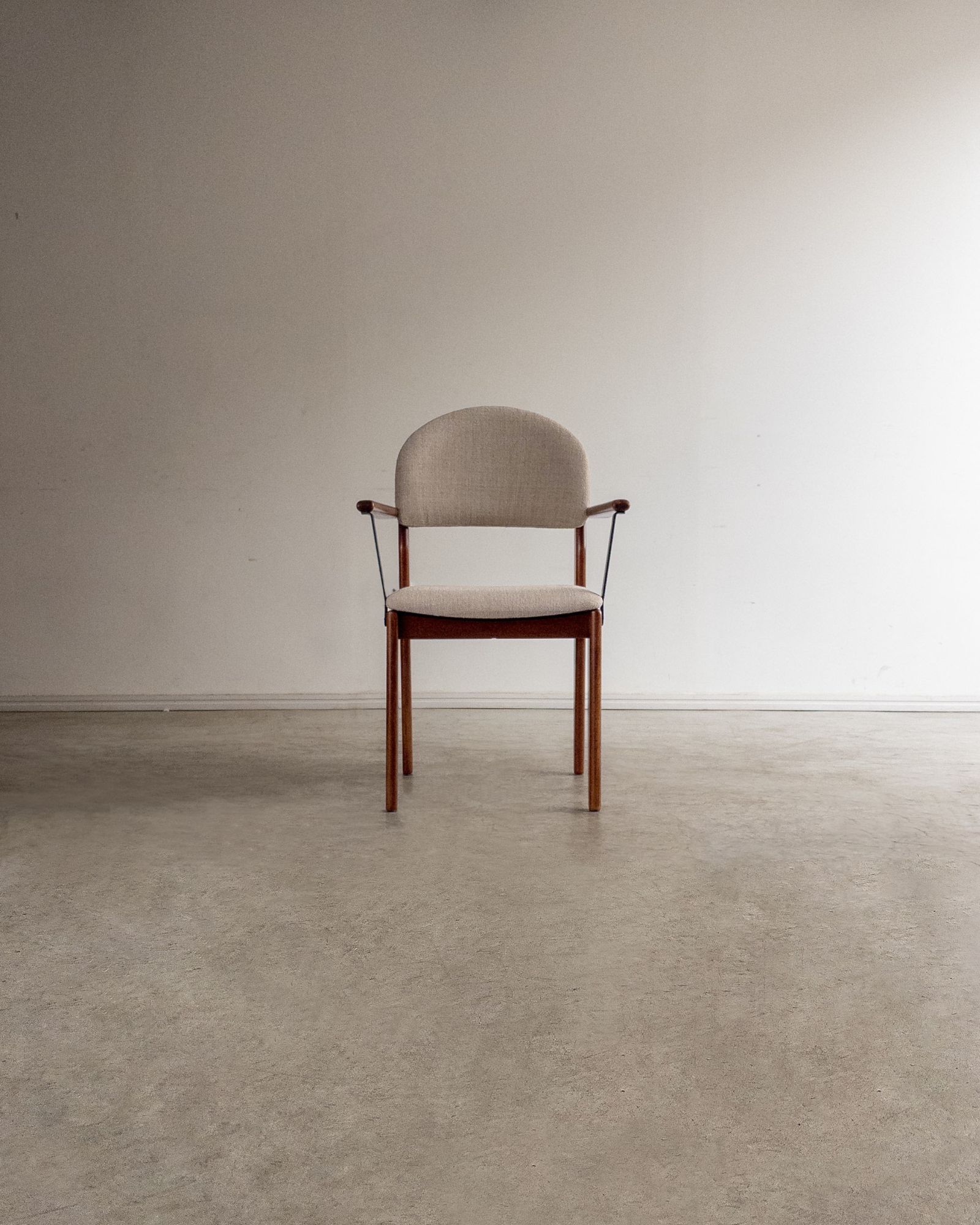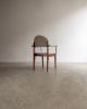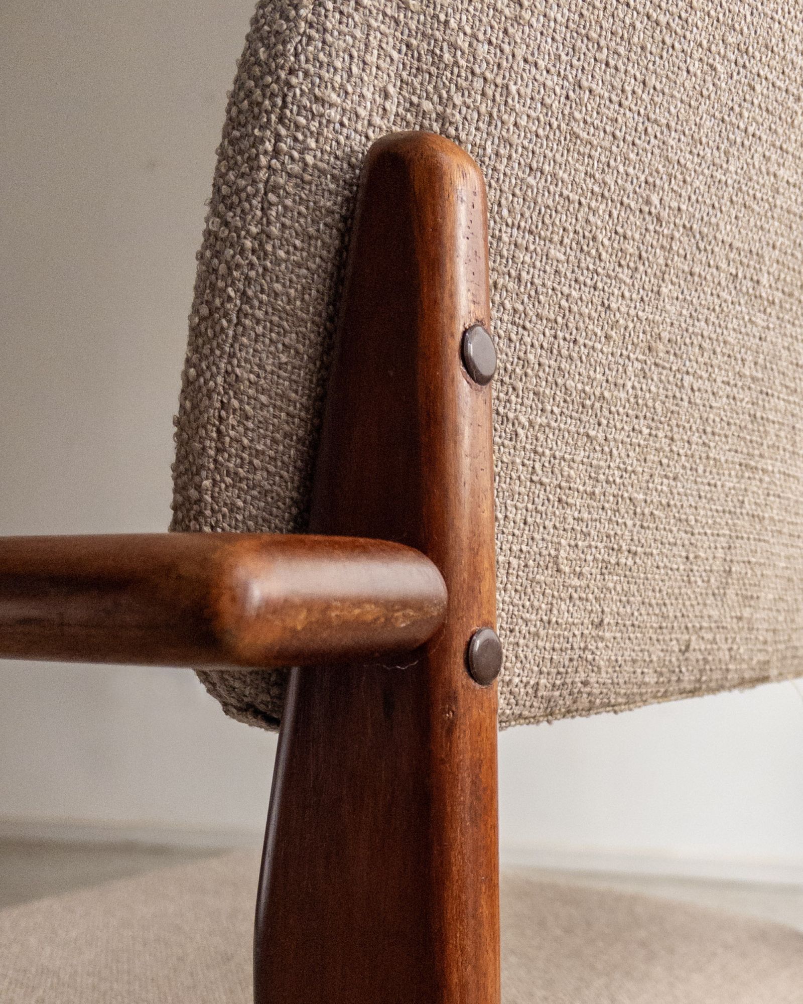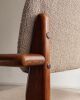 A base é em madeira maciça, com seção reta e encaixes aparentes. Assento e encosto estofados mantêm a curvatura suave já vista em outros modelos. Os braços são resolvidos com uma combinação de madeira e barras metálicas, fixadas externamente, o que evidencia o sistema de montagem e cria um contraste material discreto.