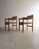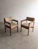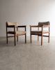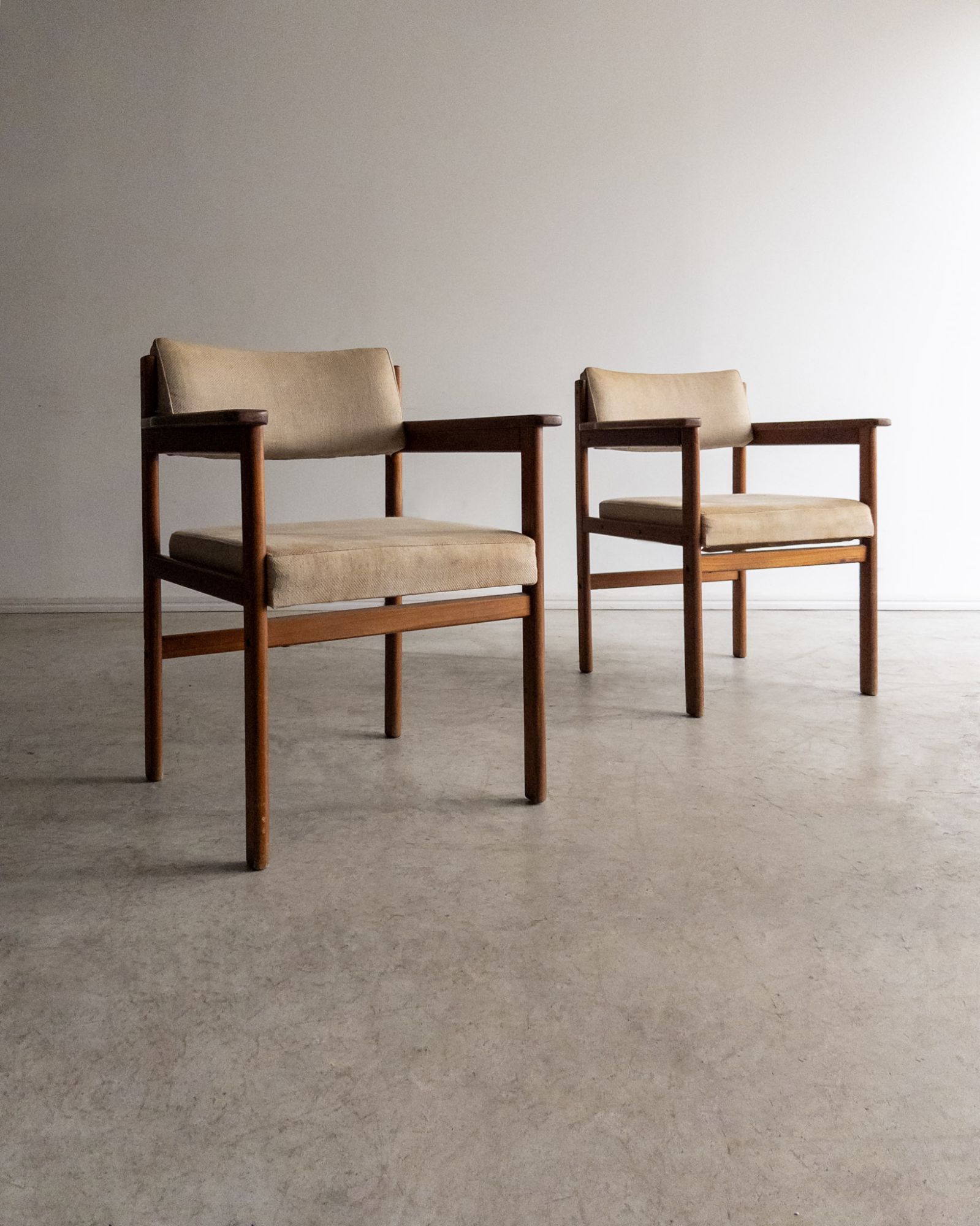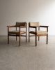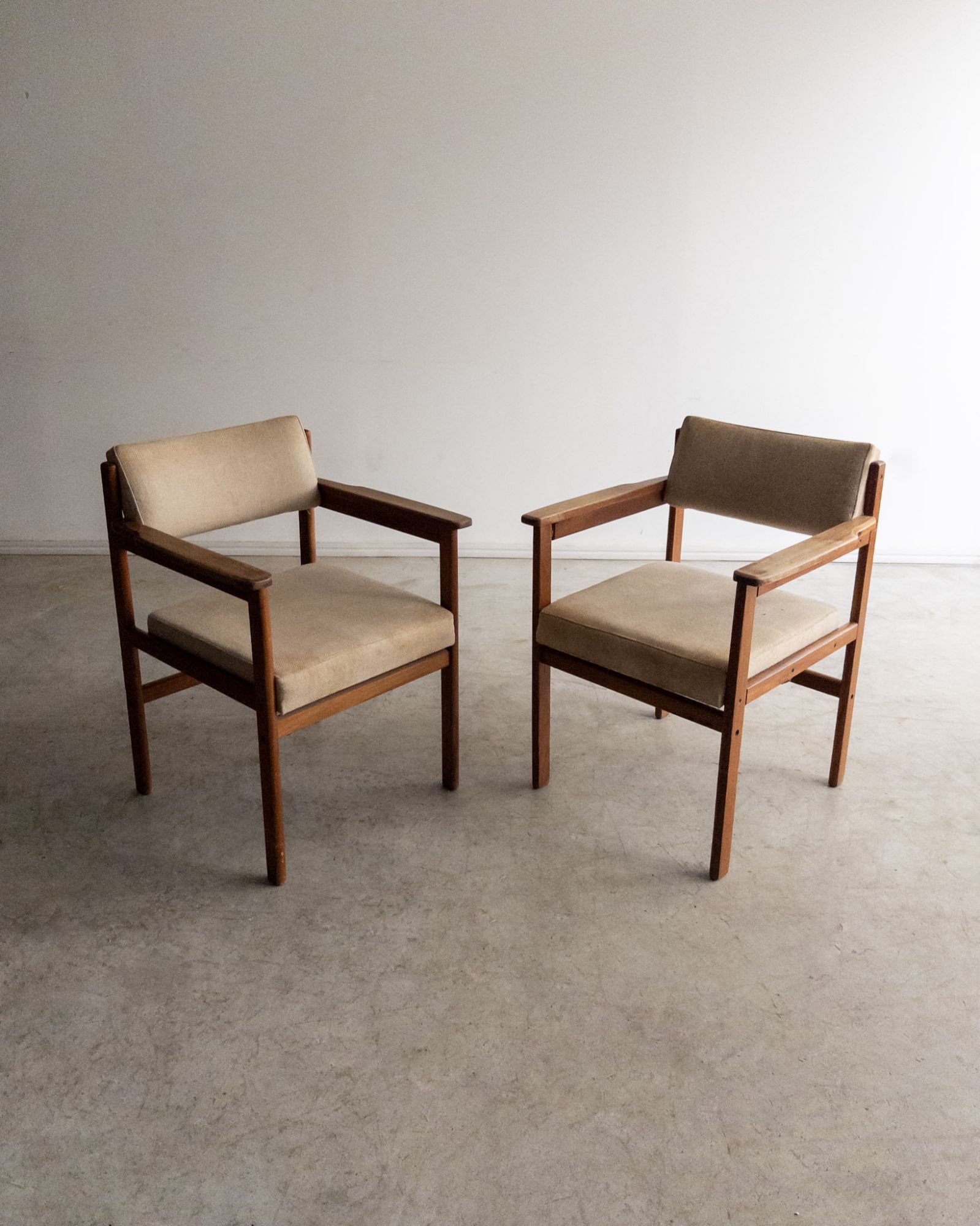 Par de cadeiras 'Tião', desenhadas por Sergio Rodrigues por volta de 1950 e produzidas pela Oca, a loja-ateliê que o próprio designer fundou no Rio de Janeiro e que se tornaria um dos espaços centrais do design moderno brasileiro. A edição Oca confere às peças rastreabilidade direta ao contexto original de produção, quando Rodrigues desenvolveu um vocabulário pessoal que combinava estruturas em madeiras brasileiras maciças com estofamentos generosos e encaixes sem parafusos, numa proposta que contrariava o industrialismo europeu com soluções artesanais de alta precisão.