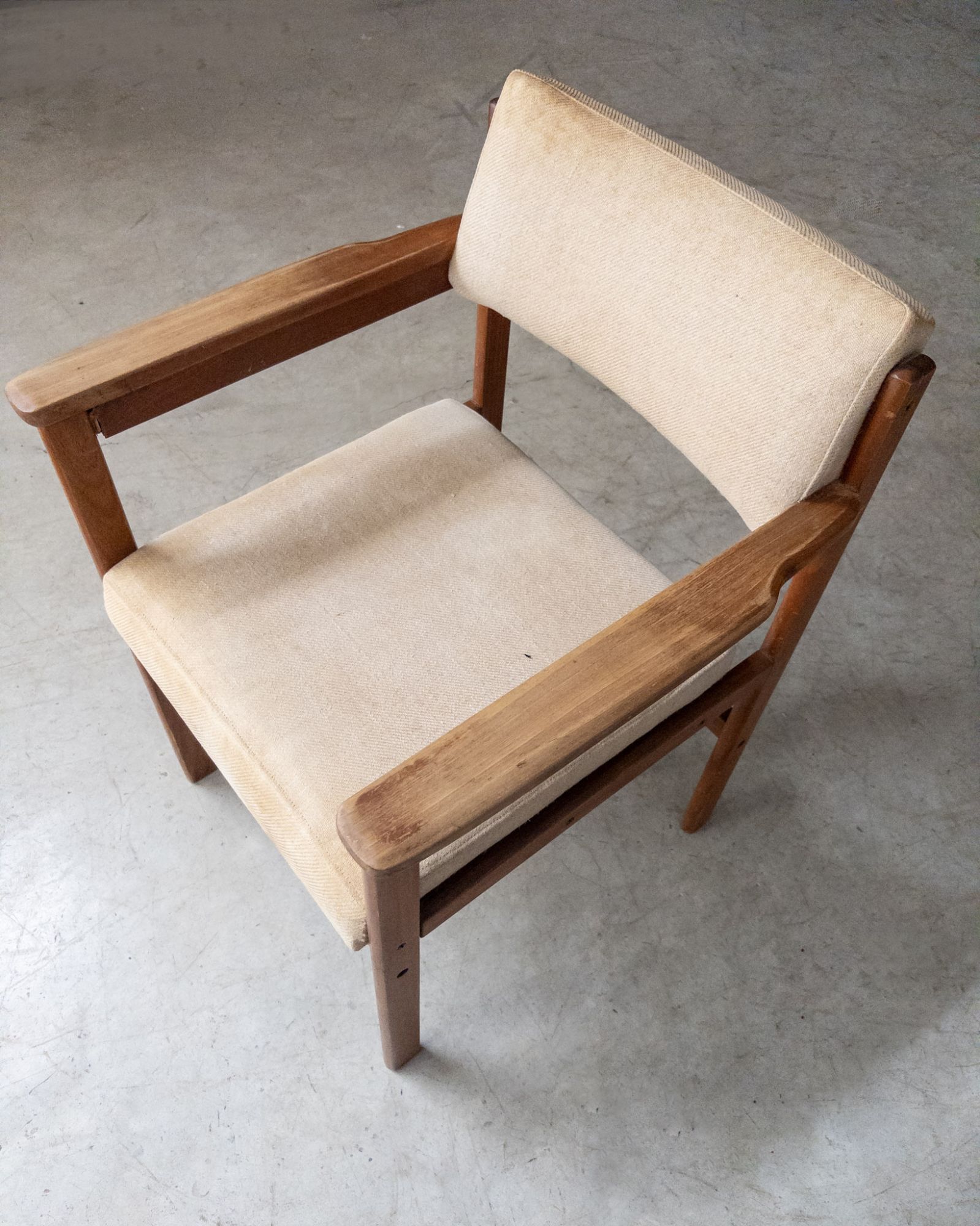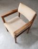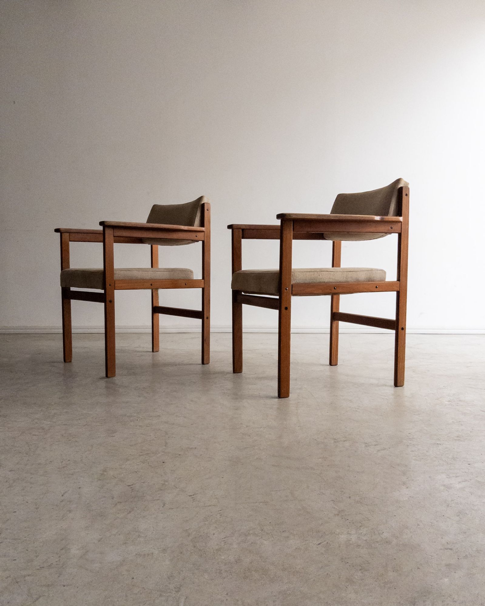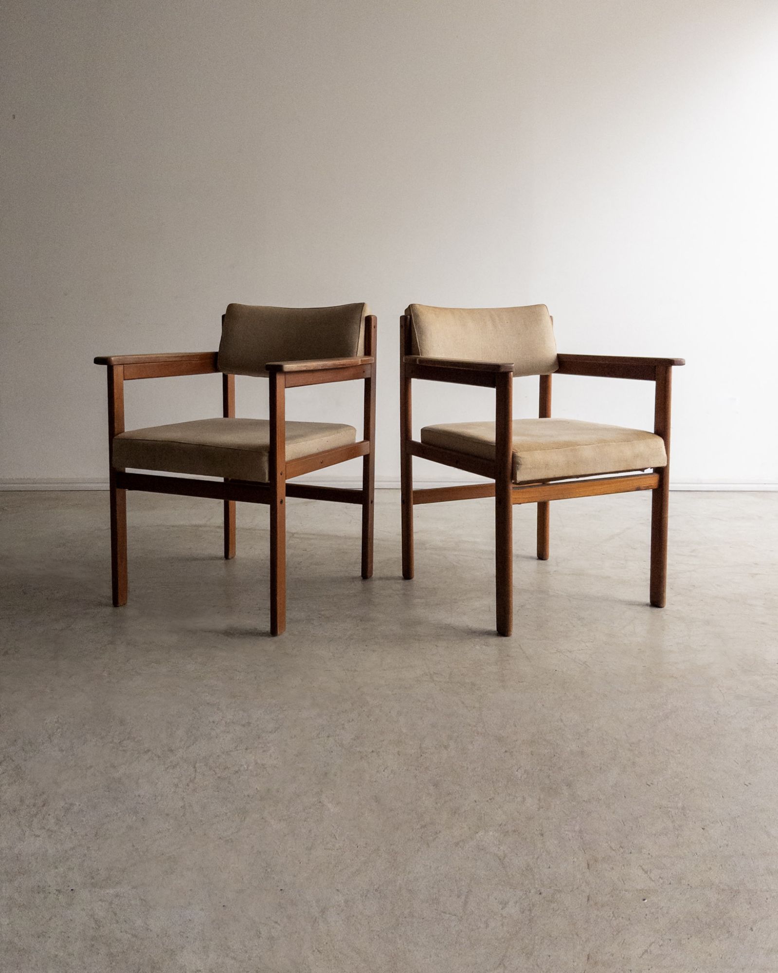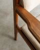 A cadeira 'Tião' tem estrutura em freijó maciço, madeira de tonalidade quente e veio marcado, trabalhada em seção retangular com arestas ligeiramente chanfradas. A grelha estrutural é ortogonal e direta: quatro pernas verticais unidas por travessas horizontais em dois níveis, formando um chassi aberto onde assento e encosto são inseridos como planos independentes. Os braços, integrados à estrutura superior, prolongam-se levemente além da linha frontal da cadeira. Assento e encosto são estofados em tecido bege de textura discreta, fixados à estrutura sem baquetes ou molduras aparentes.