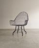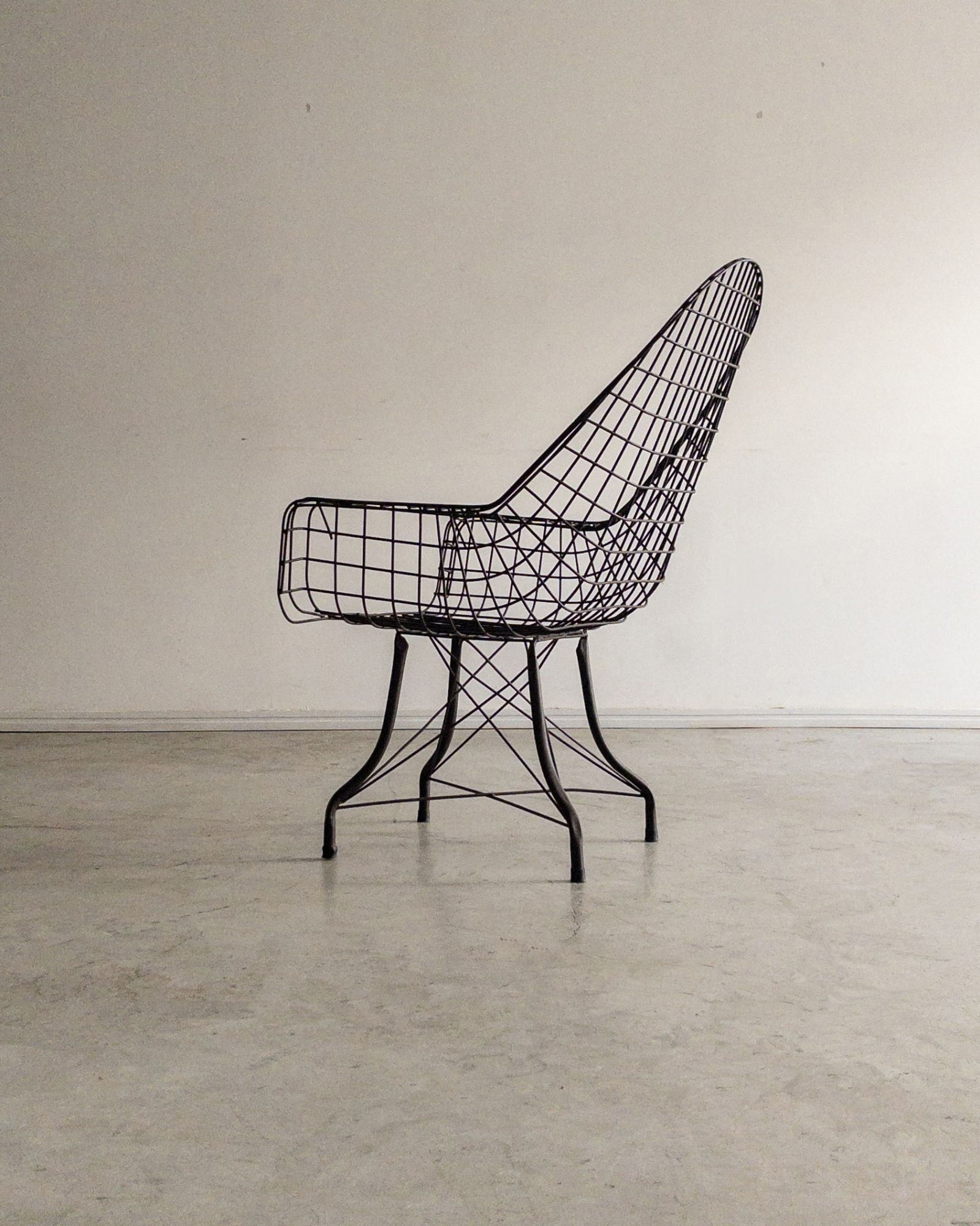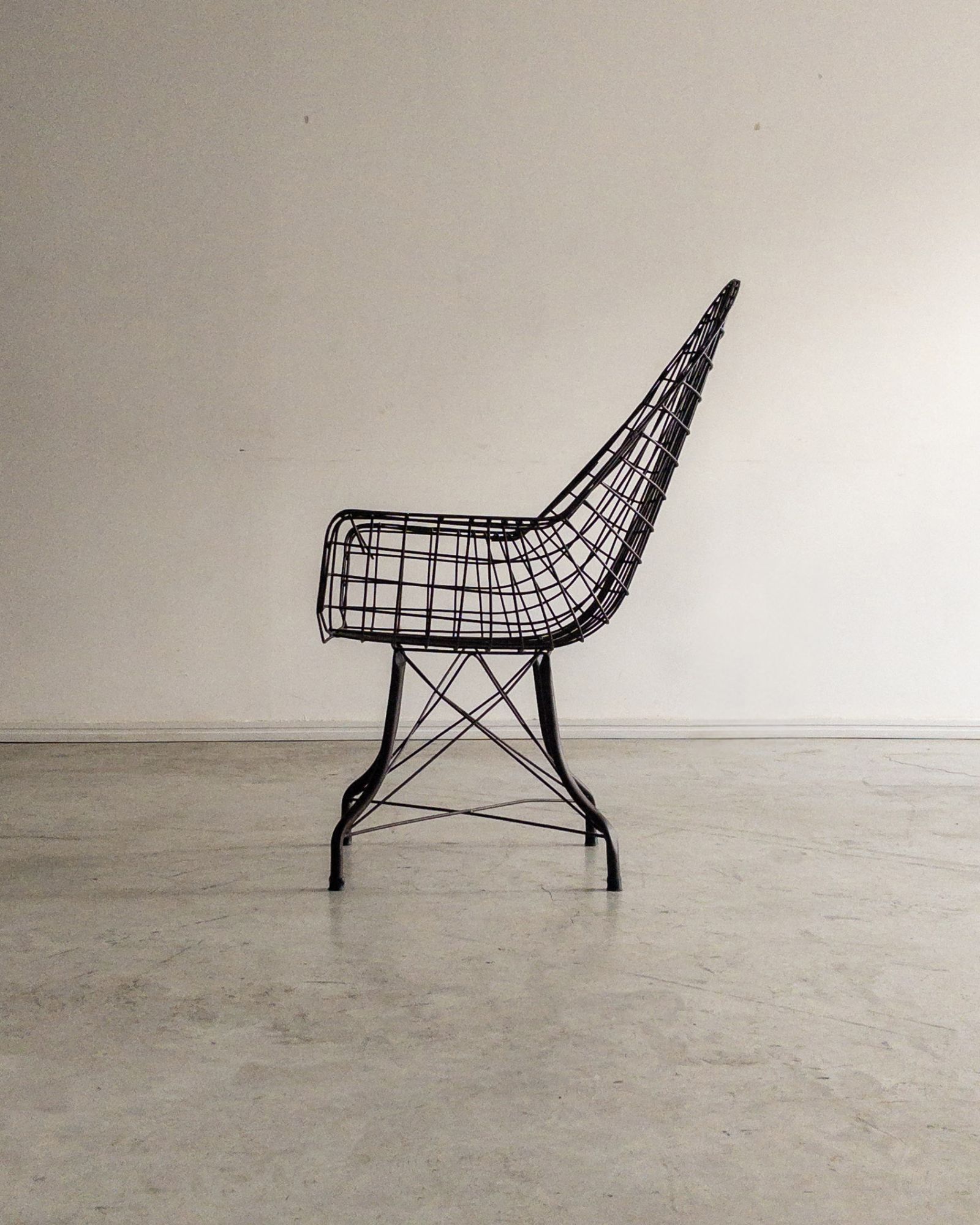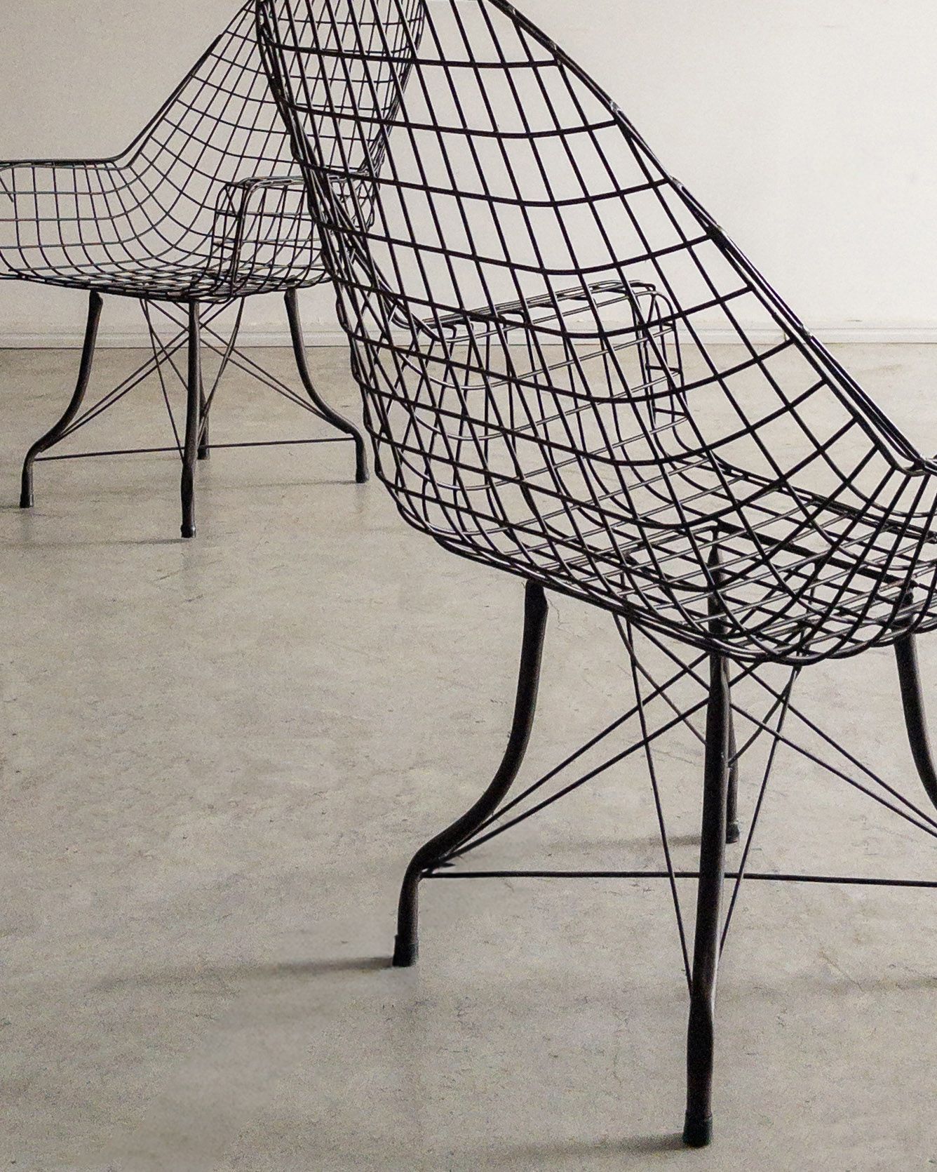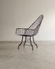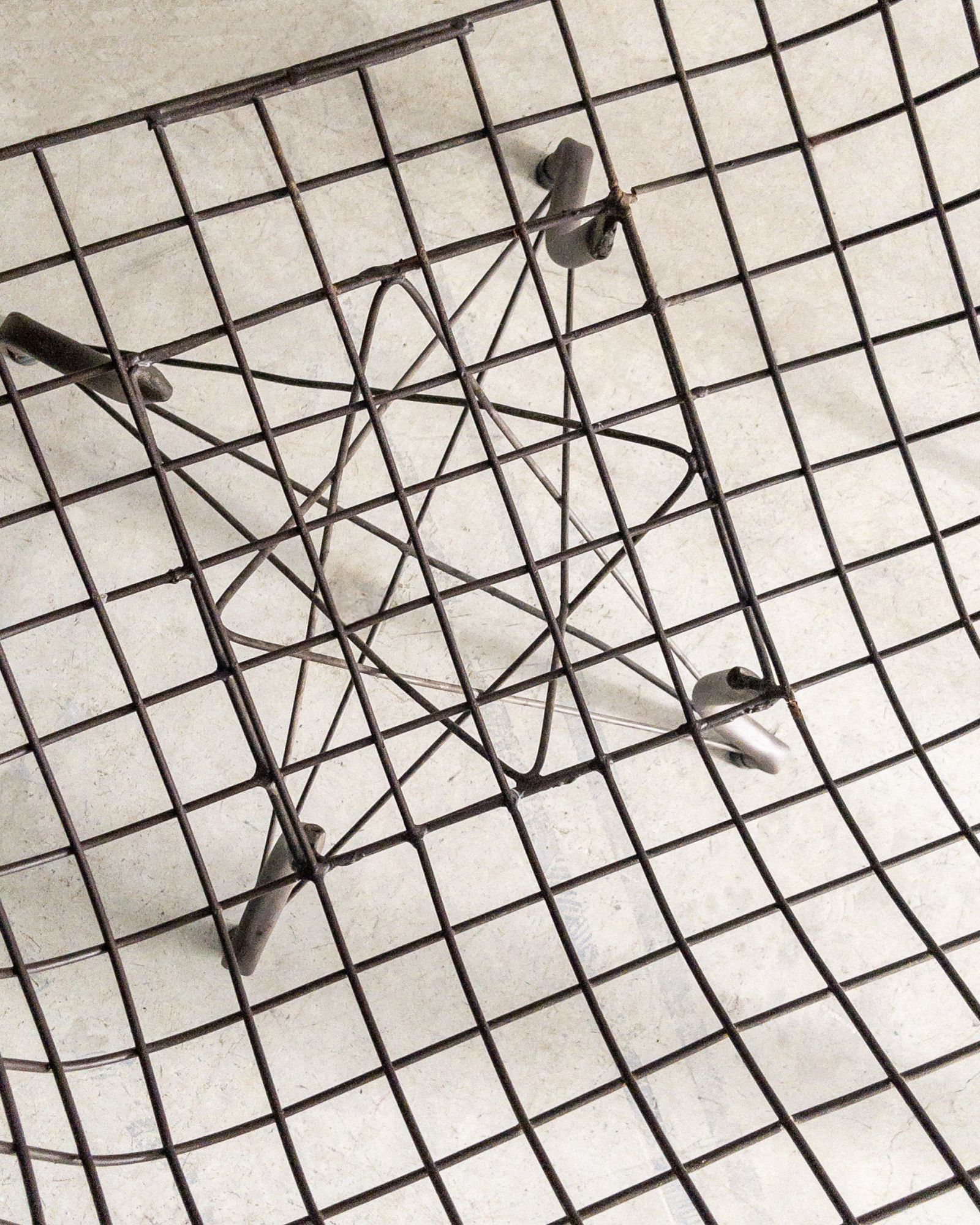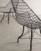 Estrutura metálica com desenho marcante. O ferro tramado pintado em corten forma uma malha contínua que desenha assento, encosto e braços em uma estrutura inteiriça e bem resolvida. A base metálica, com travamentos diagonais, reforça a estabilidade do conjunto e contribui para a leveza visual da peça. Podem apresentar leves desgastes e marcas do tempo.