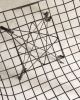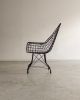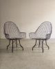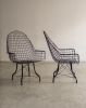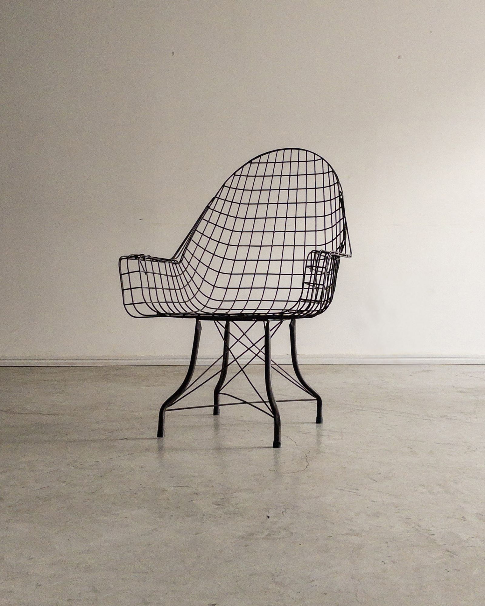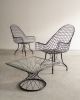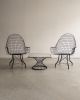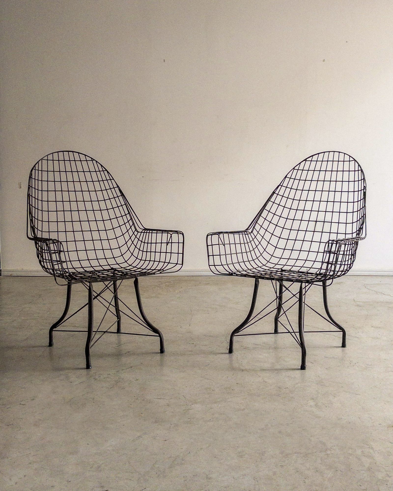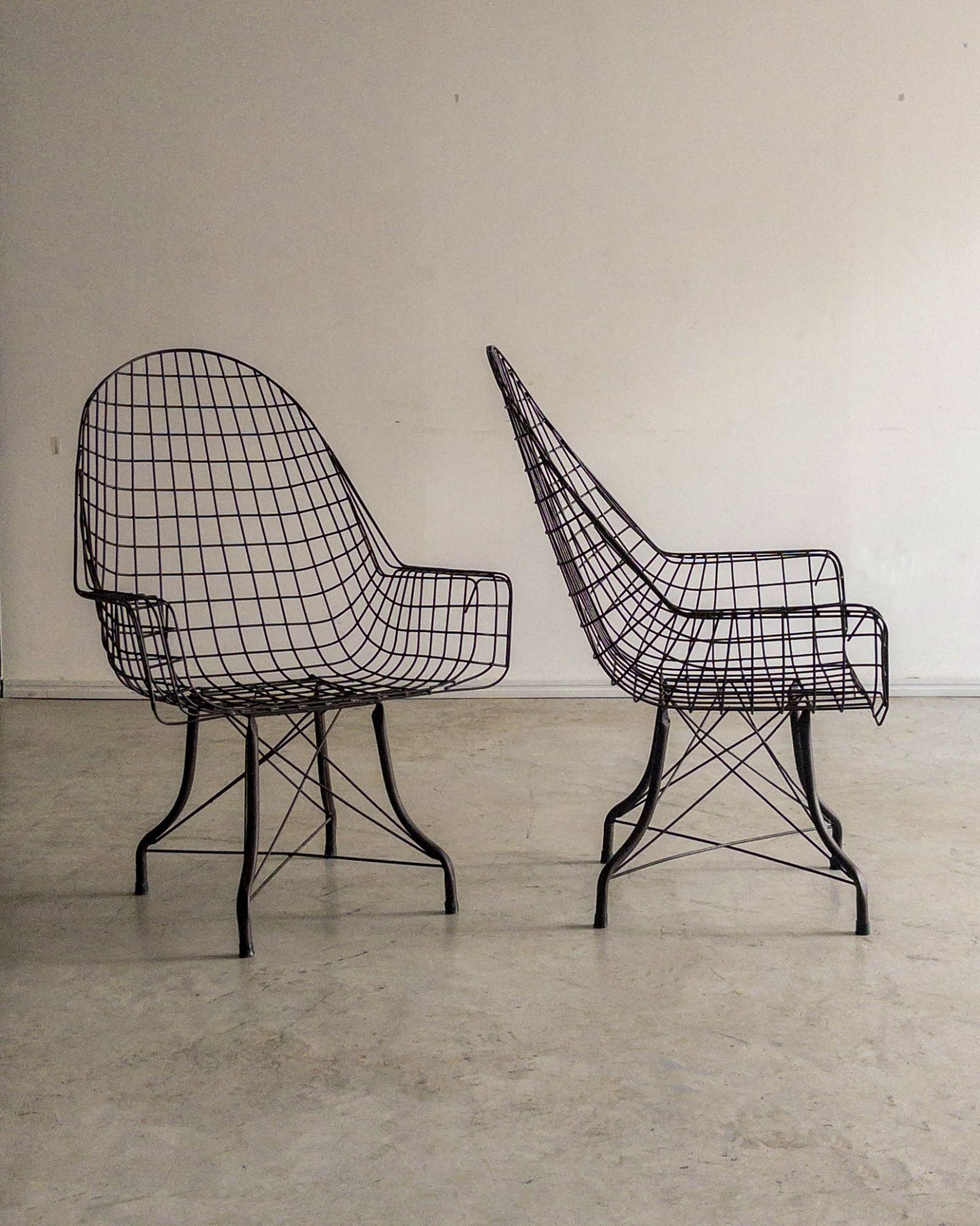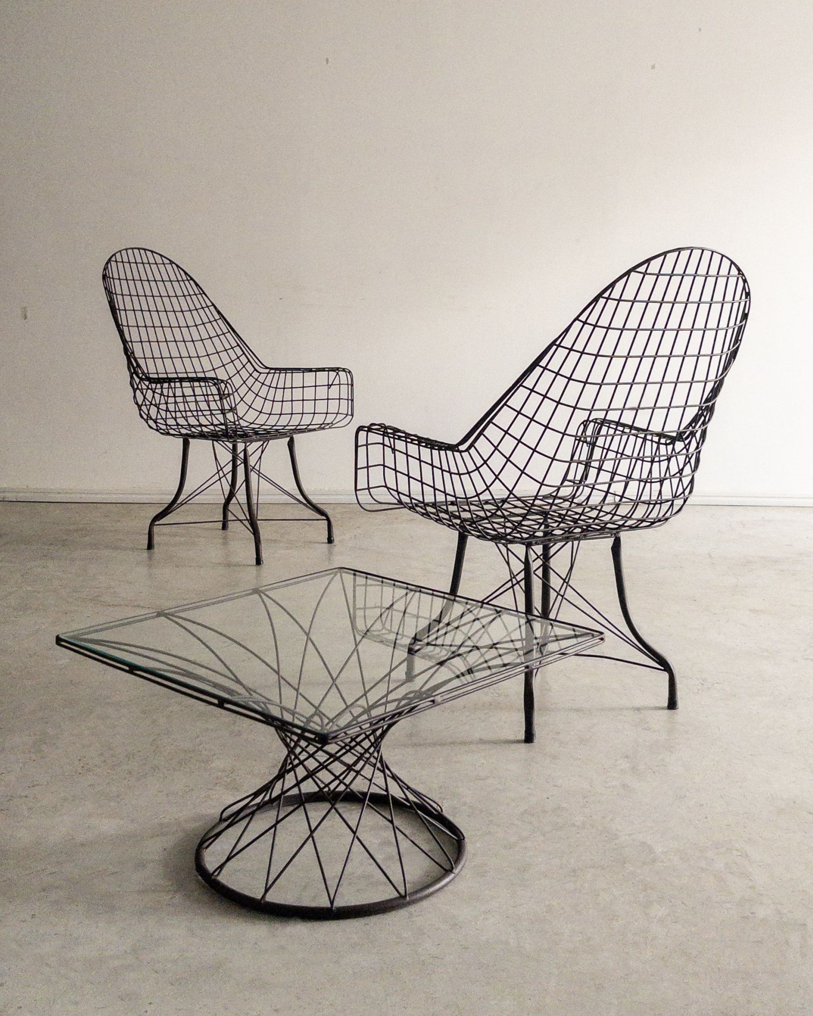Estrutura metálica com desenho marcante. O ferro tramado pintado em corten forma uma malha contínua que desenha assento, encosto e braços em uma estrutura inteiriça e bem resolvida. A base metálica, com travamentos diagonais, reforça a estabilidade do conjunto e contribui para a leveza visual da peça. Podem apresentar leves desgastes e marcas do tempo.