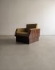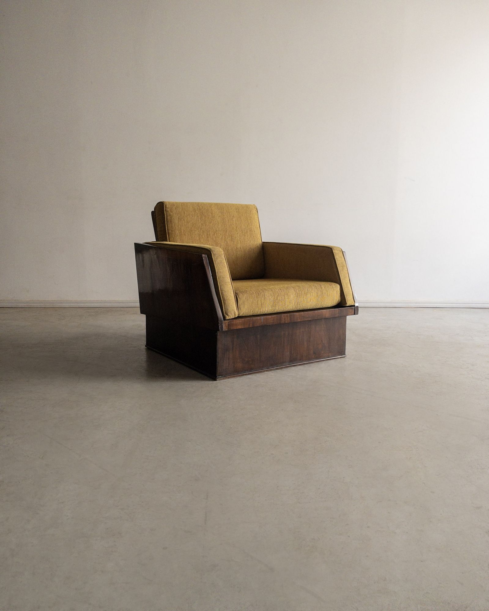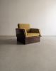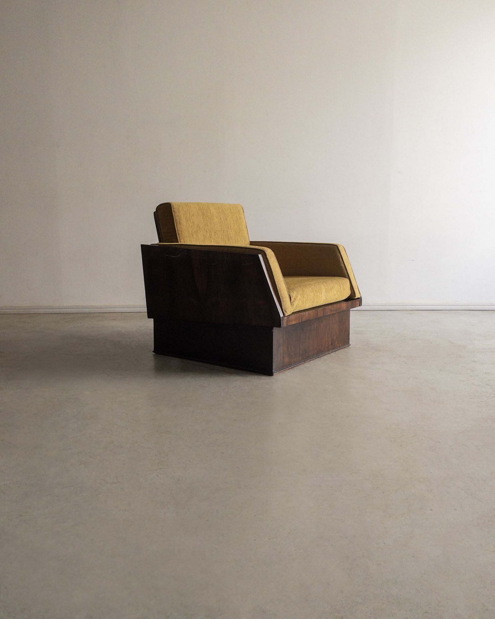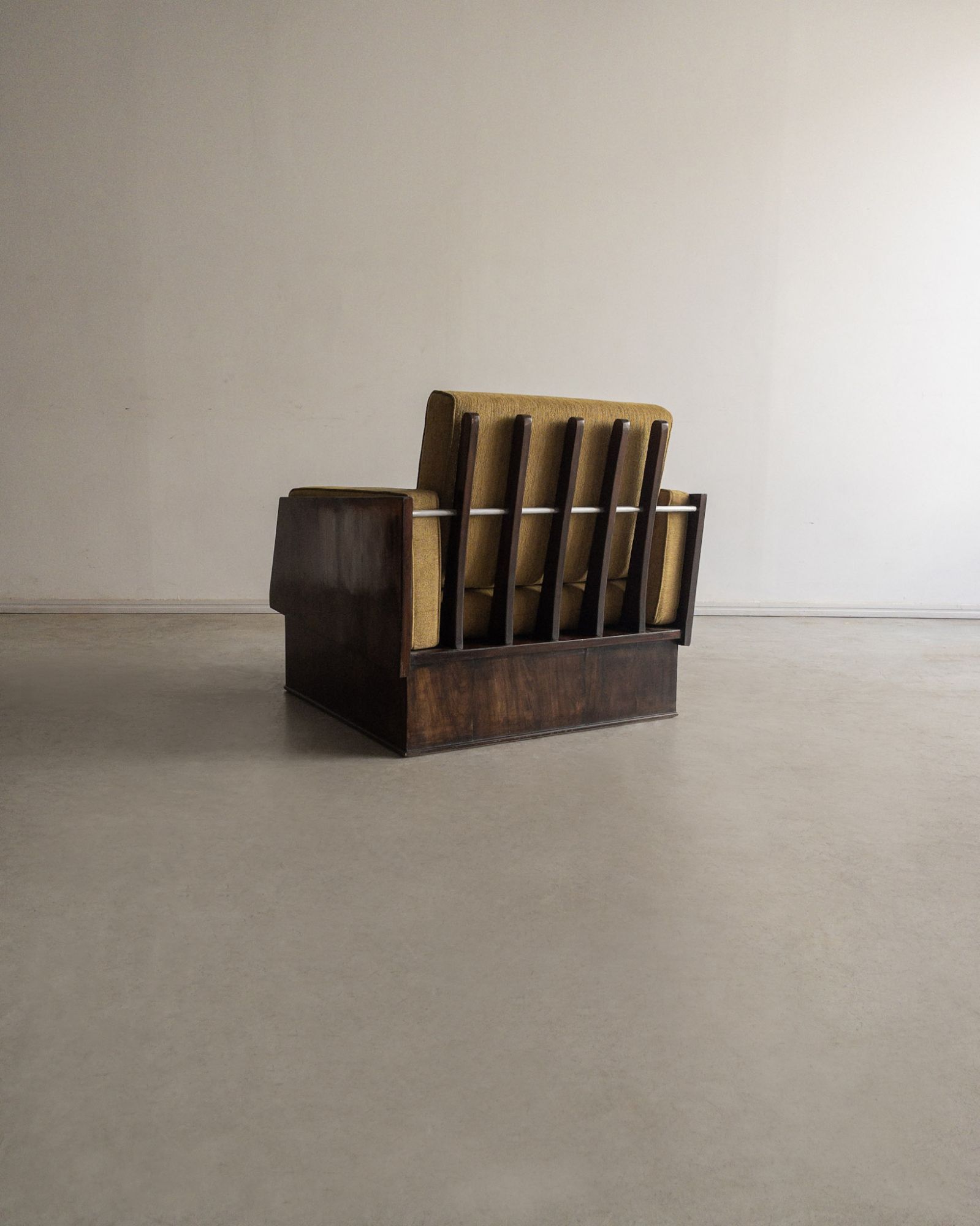 Técnica: Estrutura folheada em jacarandá, assento e encosto em tecido