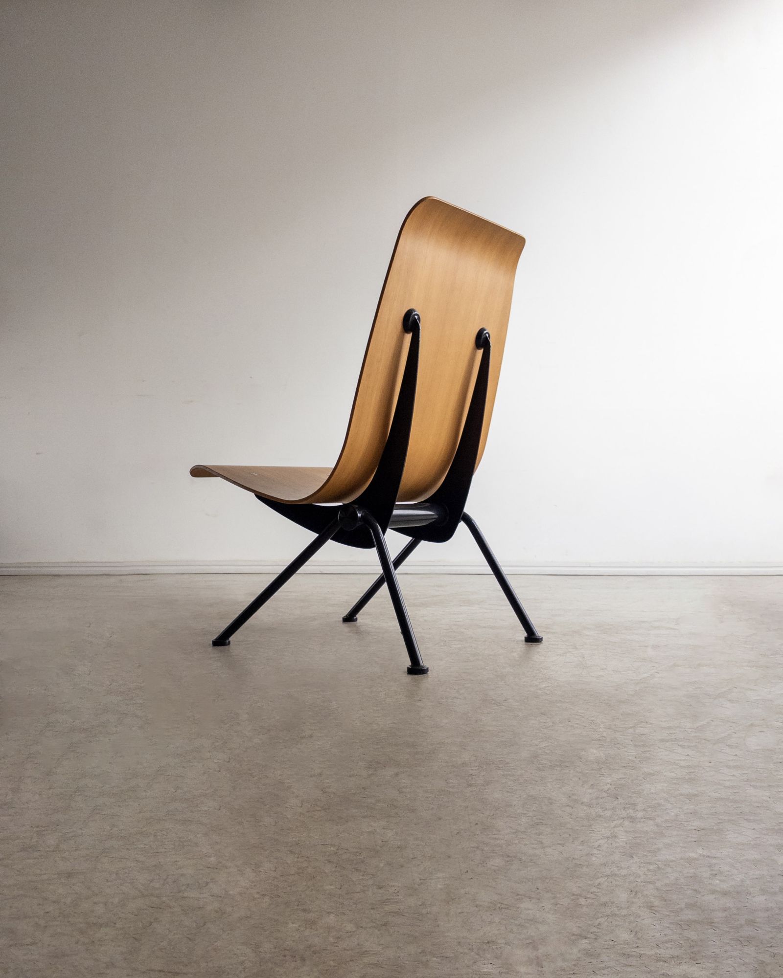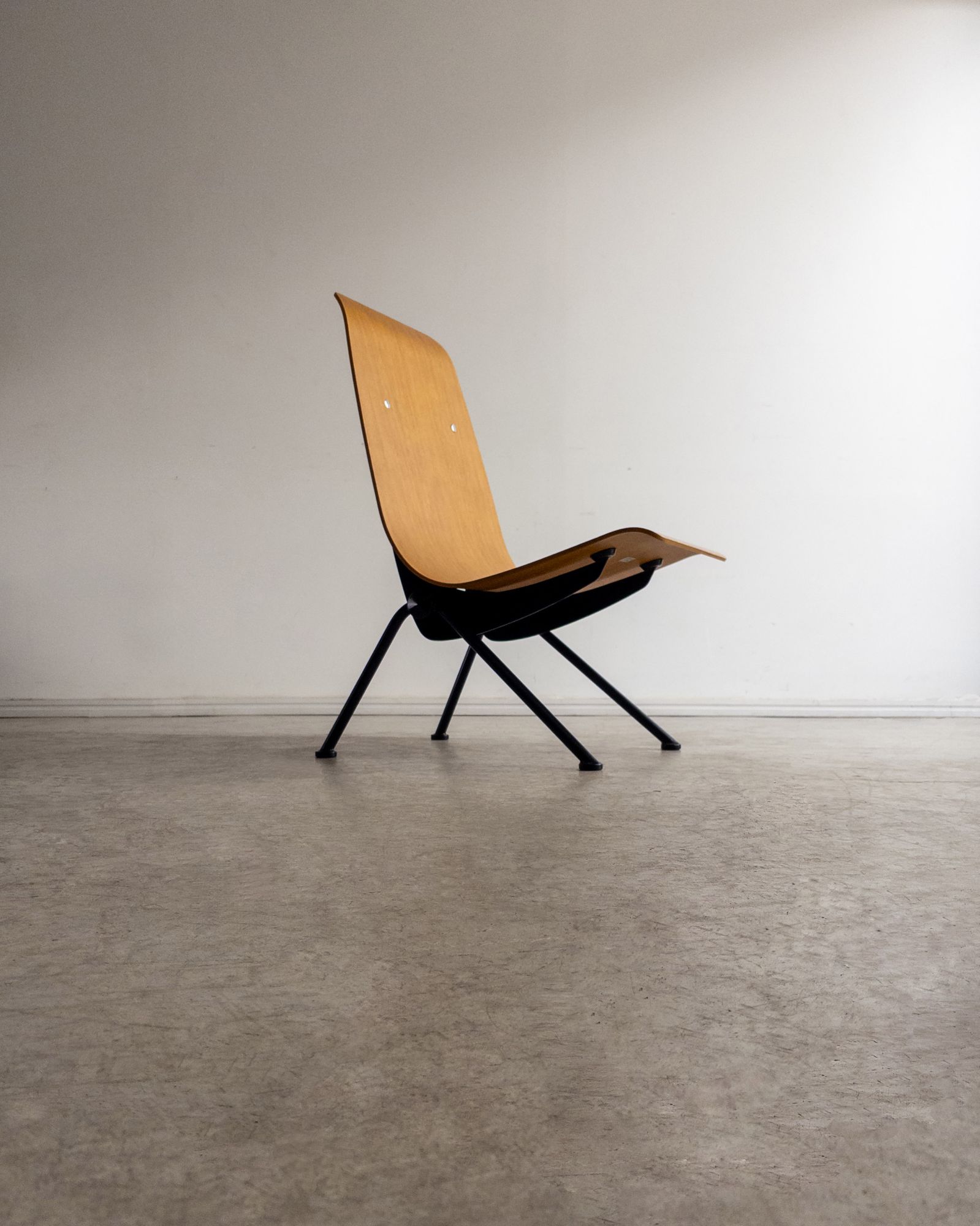 Prouvé, com formação ligada à metalurgia, tratava o mobiliário como uma extensão da engenharia. Seu trabalho se distancia da ideia de forma decorativa e se aproxima de soluções industriais, onde cada elemento responde a uma função precisa. A Antony surge nesse contexto, explorando a relação entre chapa metálica e madeira moldada com grande economia de meios.