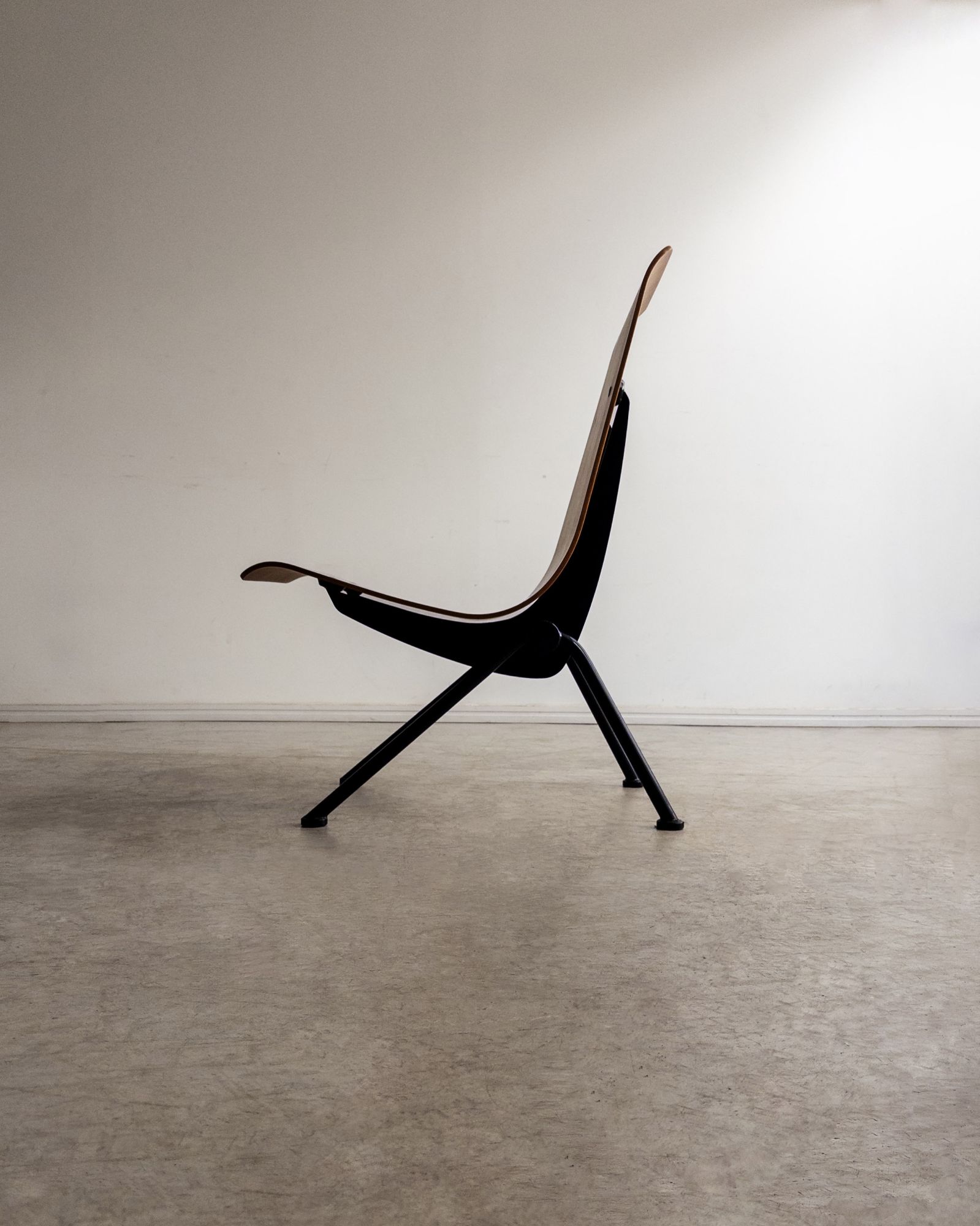 A poltrona Antony, desenhada por Jean Prouvé em 1955, é um exemplo claro de sua abordagem estrutural aplicada ao mobiliário. Nesta edição produzida pela Vitra em 2002, o desenho original se mantém fiel, preservando a lógica construtiva que define a peça.