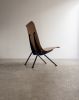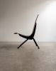 O desenho se organiza em tensão e equilíbrio. A concha parece suspensa sobre a estrutura, enquanto os apoios metálicos resolvem o esforço de forma direta e legível. É uma peça em que a construção não se esconde, e justamente por isso define sua presença.