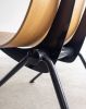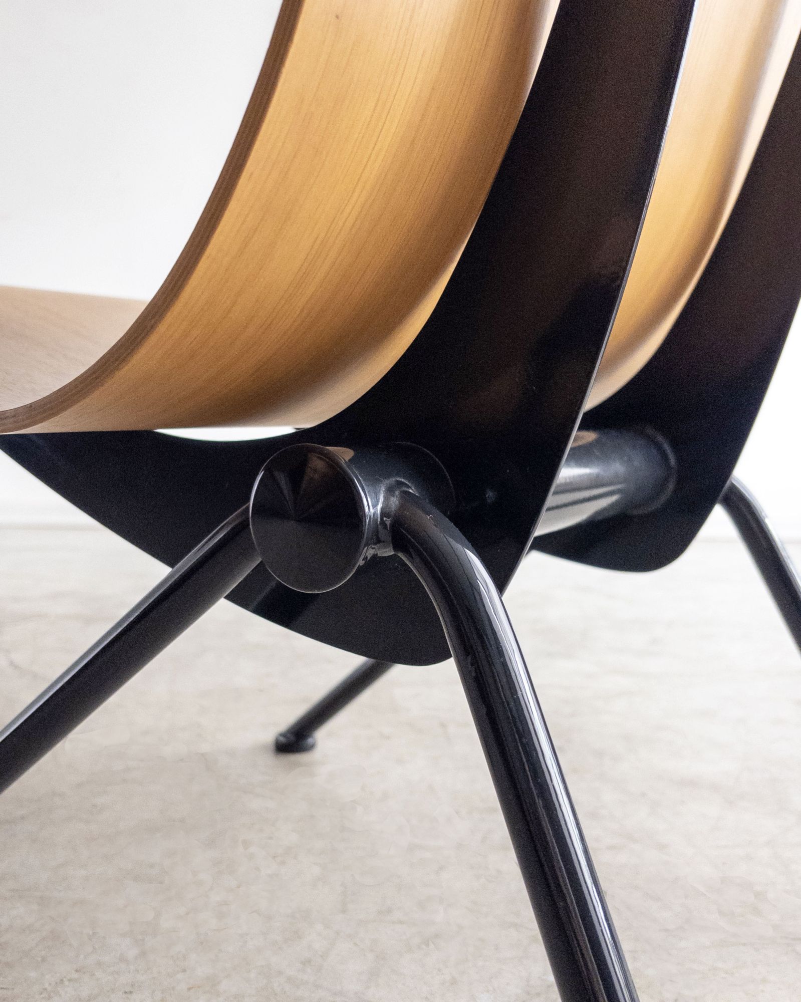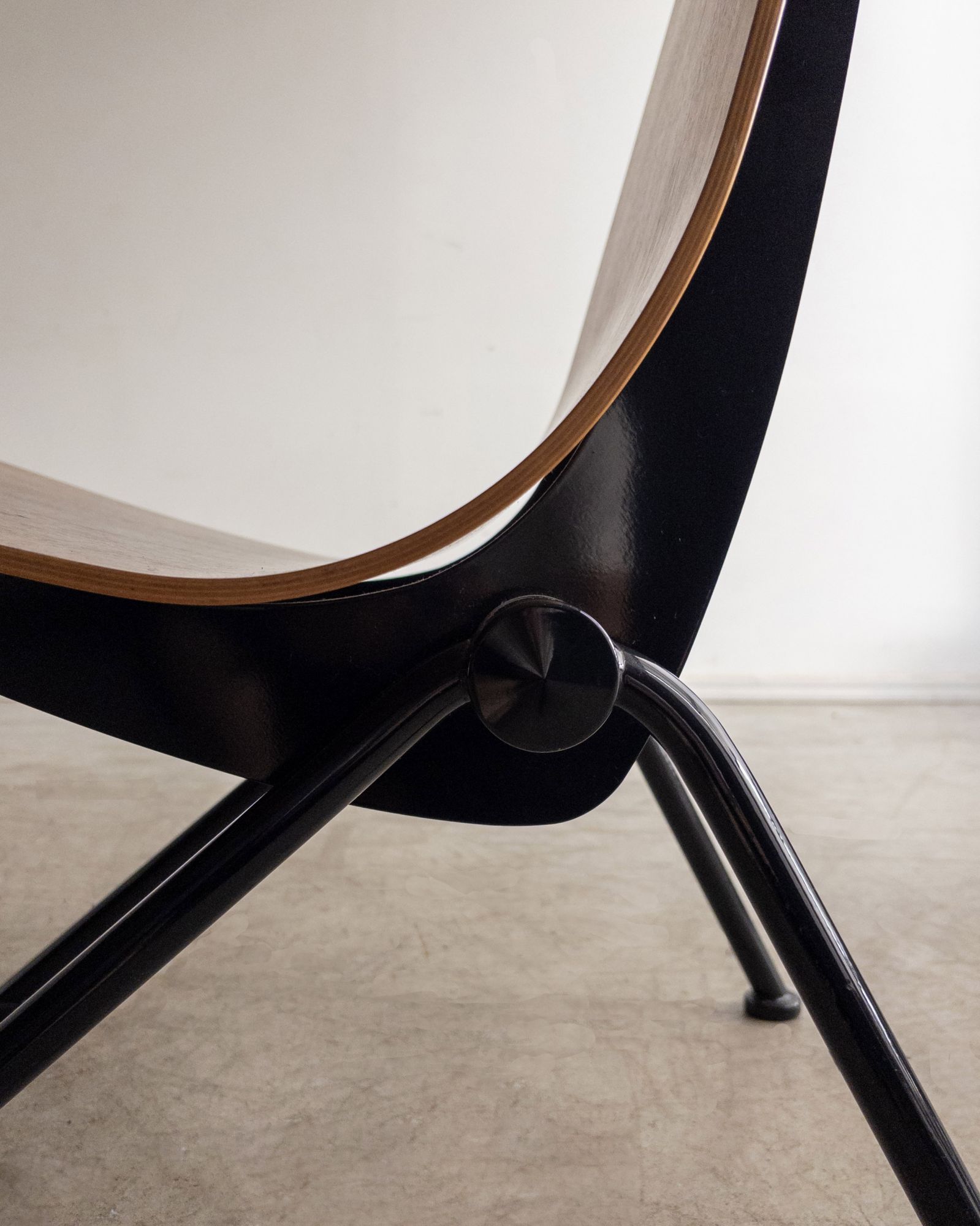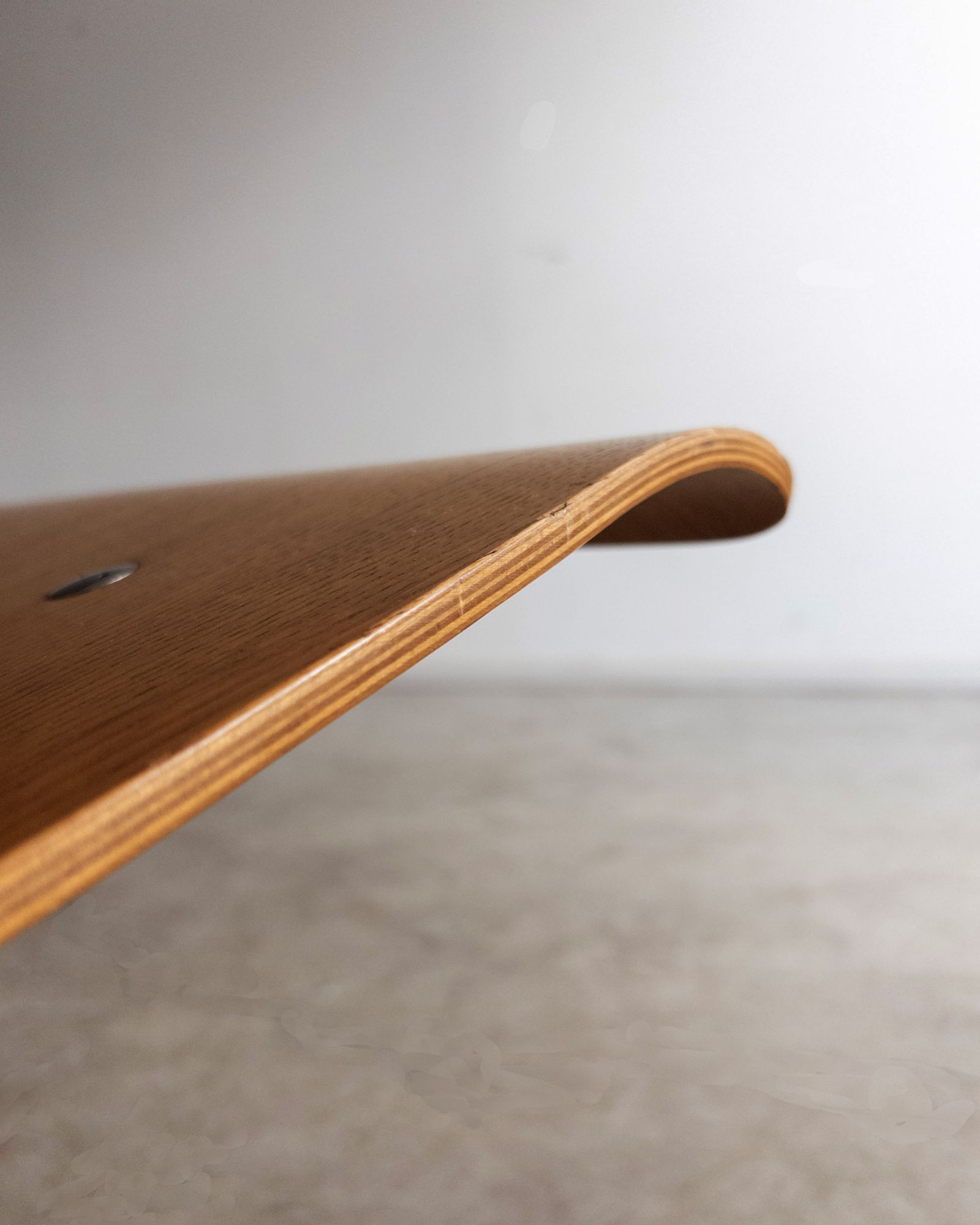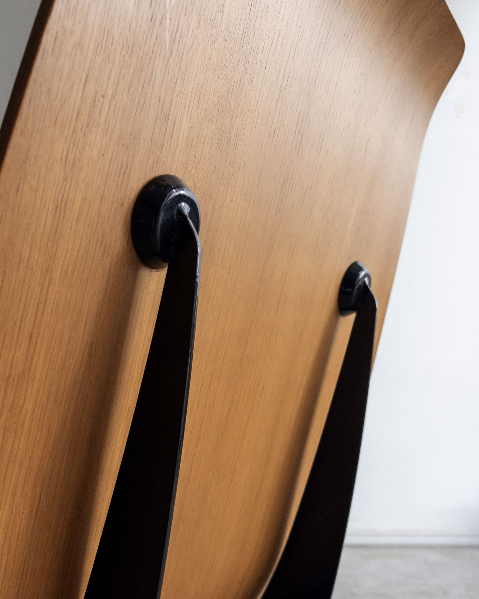 A estrutura combina aço tubular e chapa dobrada, formando uma base leve e estável. Sobre ela, o assento e o encosto em compensado de faia termoformado criam uma única superfície contínua, levemente flexível. O apoio é feito por duas lâminas metálicas verticais, que conectam a concha de madeira à base com fixações aparentes.