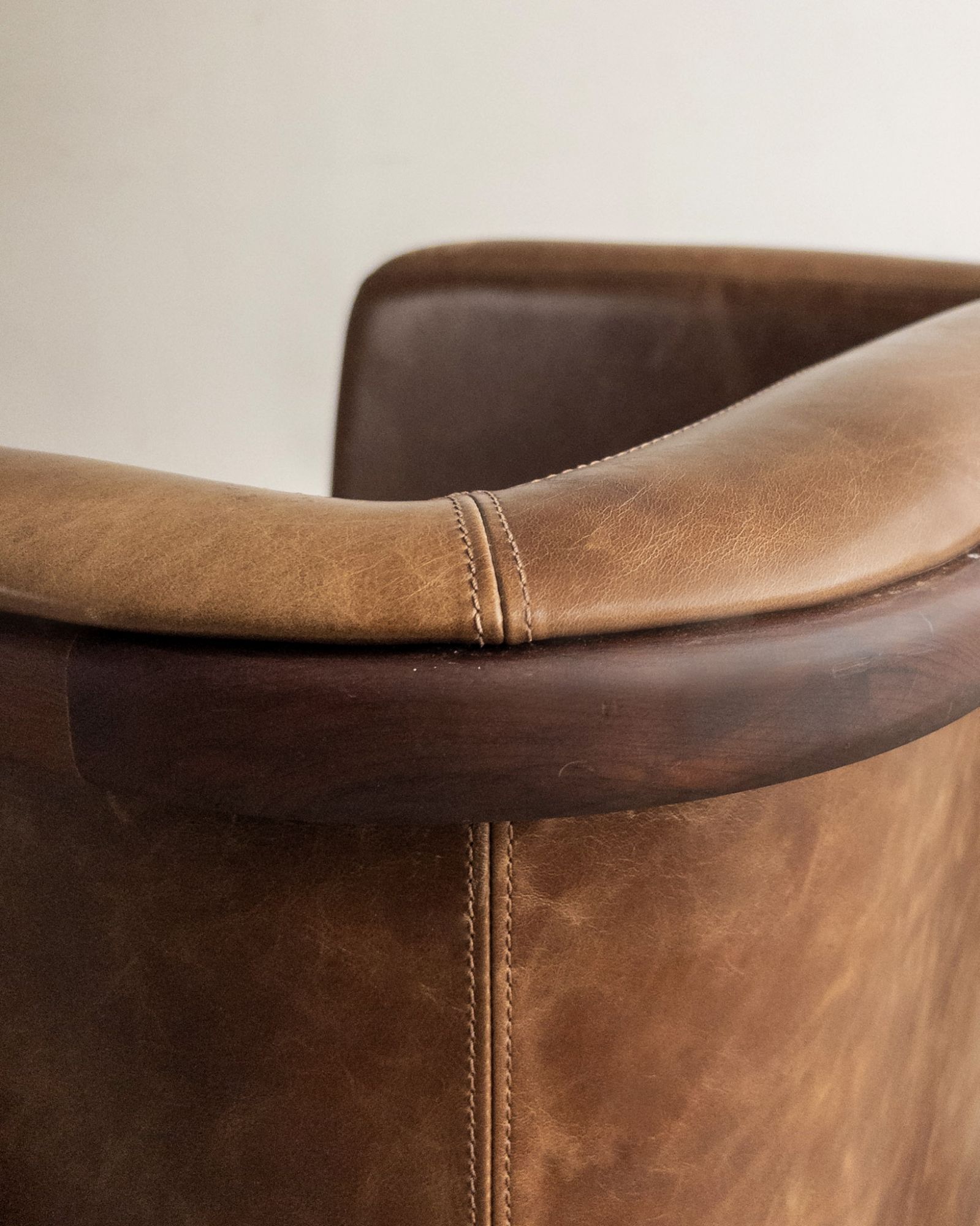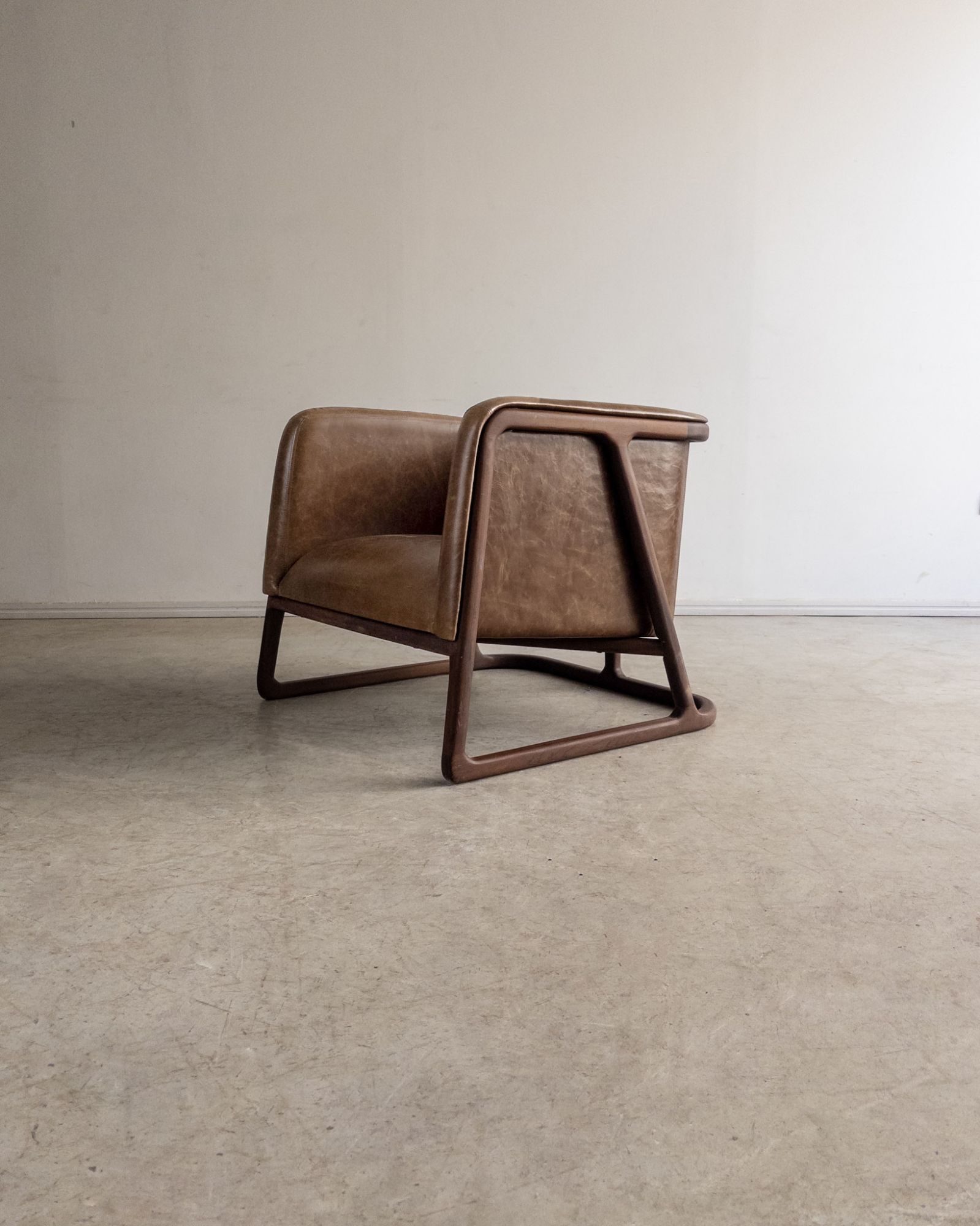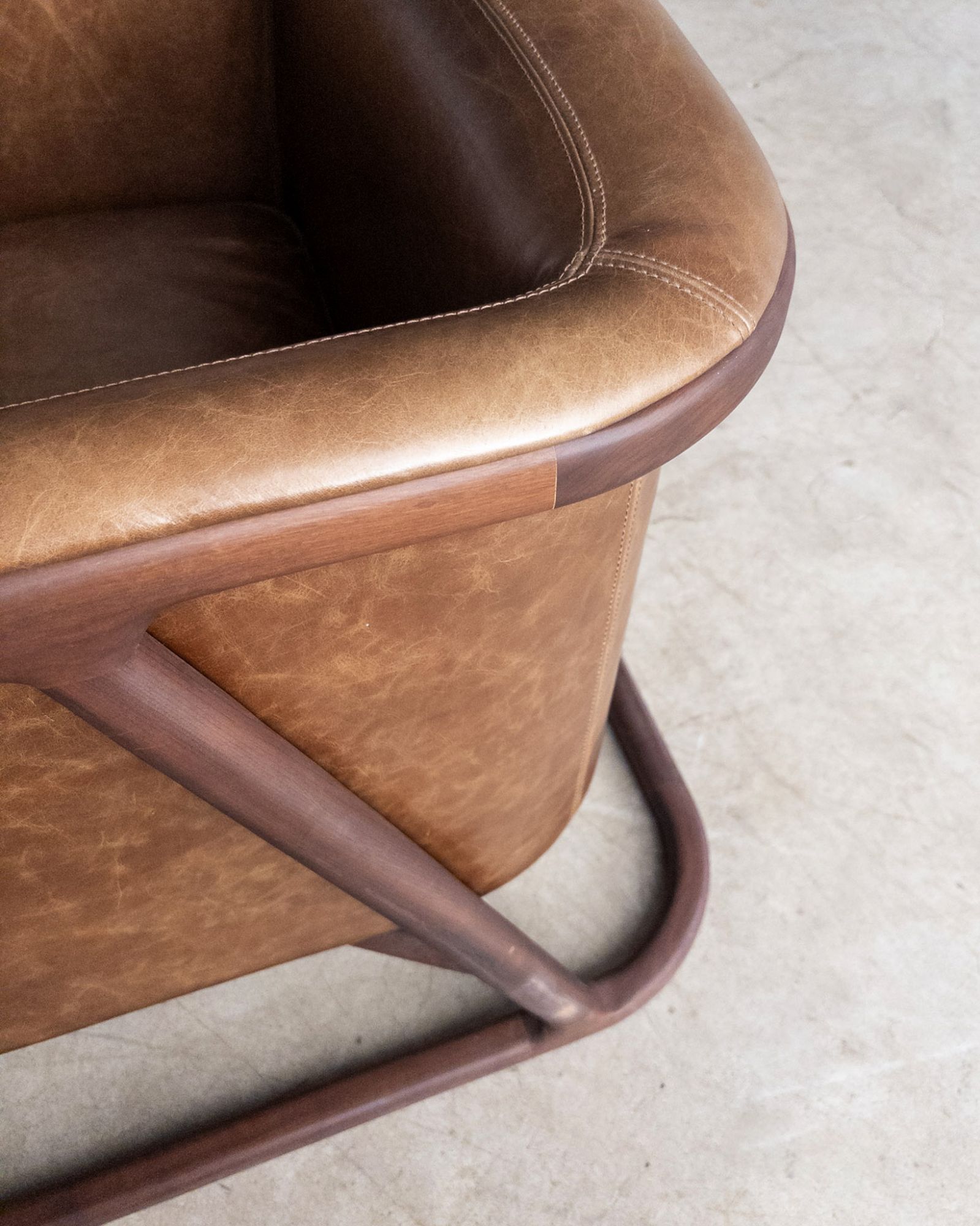Super confortável, com estrutura em madeira maciça torneada e assento revestido em couro natural, a Poltrona Carybé, de Ronald Sasson, equilibra técnica refinada e delicadeza estética.