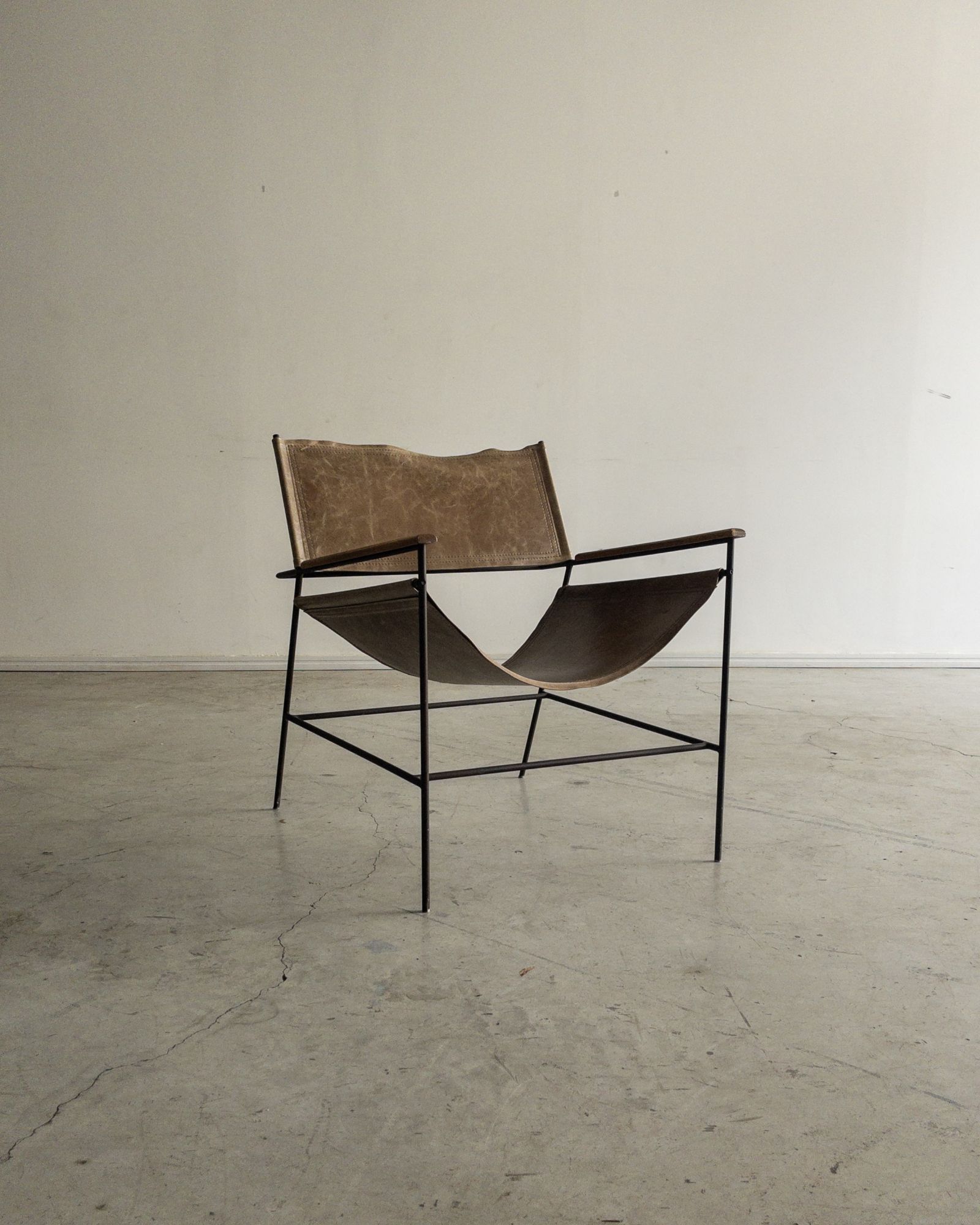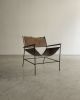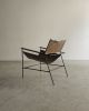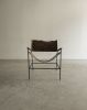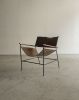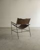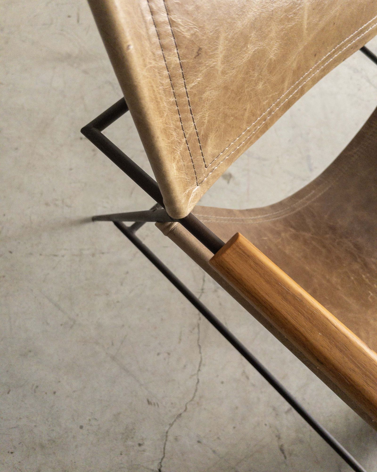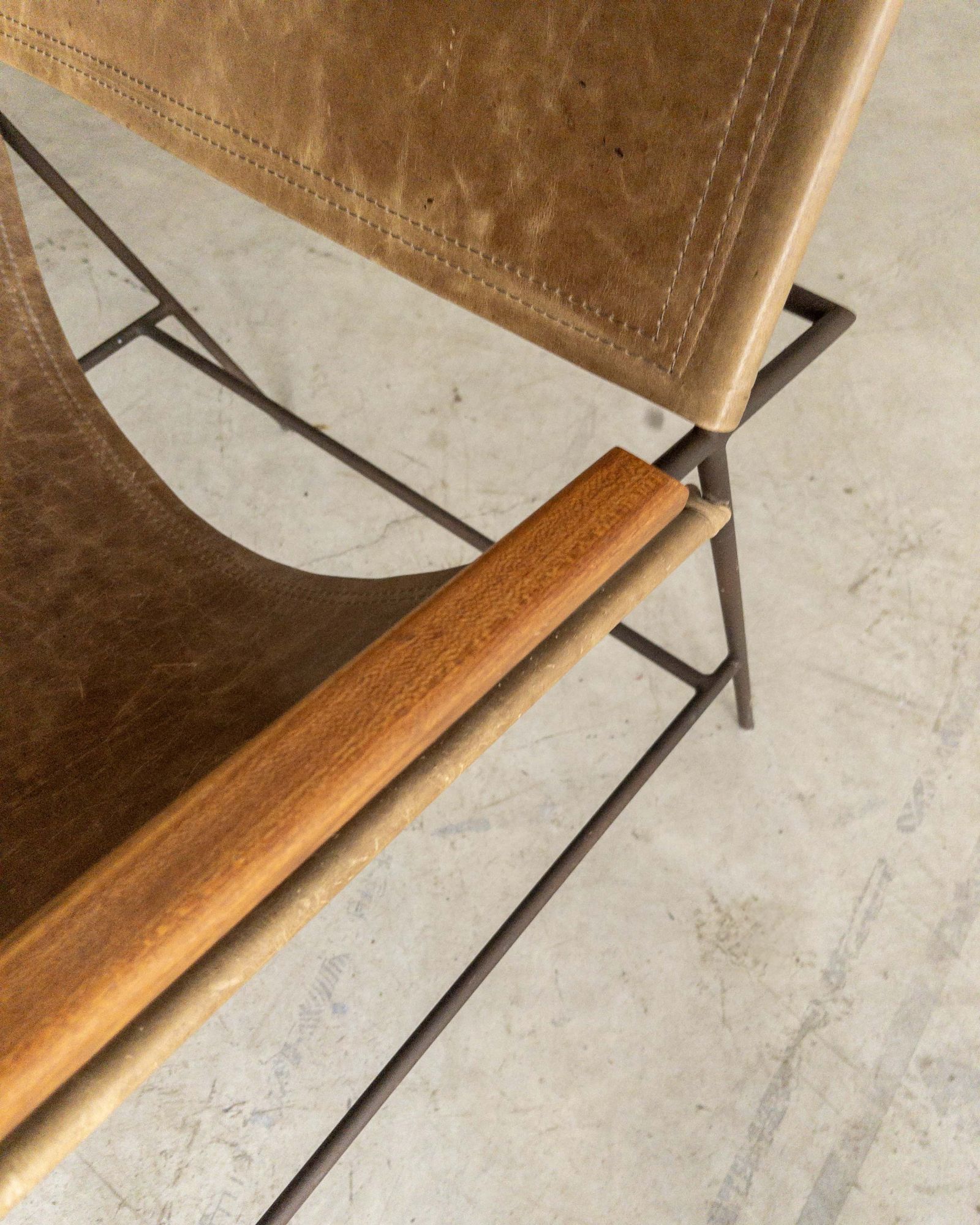 Estrutura em ferro com assento e encosto em couro soleta. As curvas suaves do couro tensionado dialogam com a estrutura metálica leve. Uma peça de presença marcante, matéria e proporções bem resolvidas.