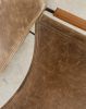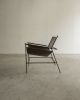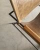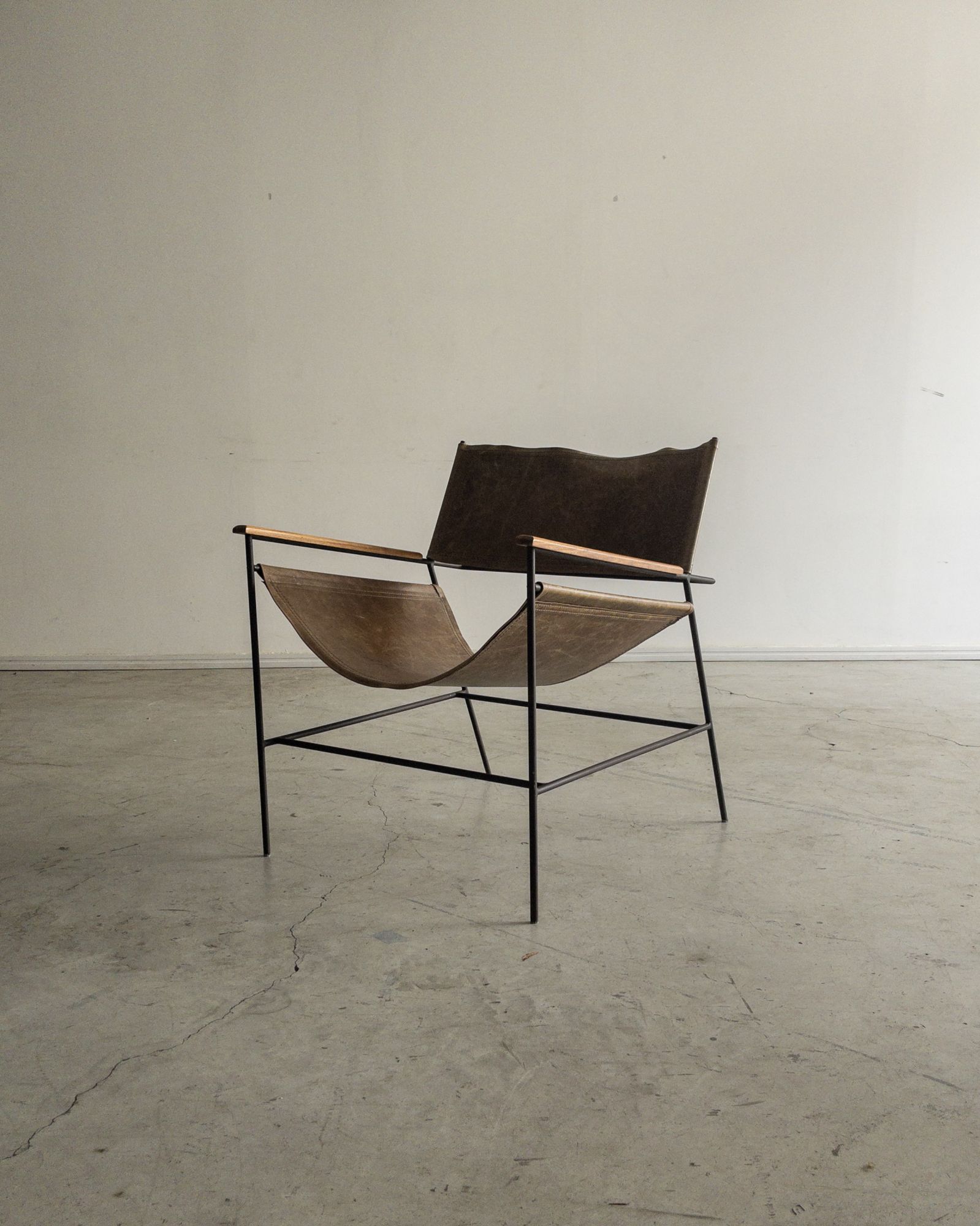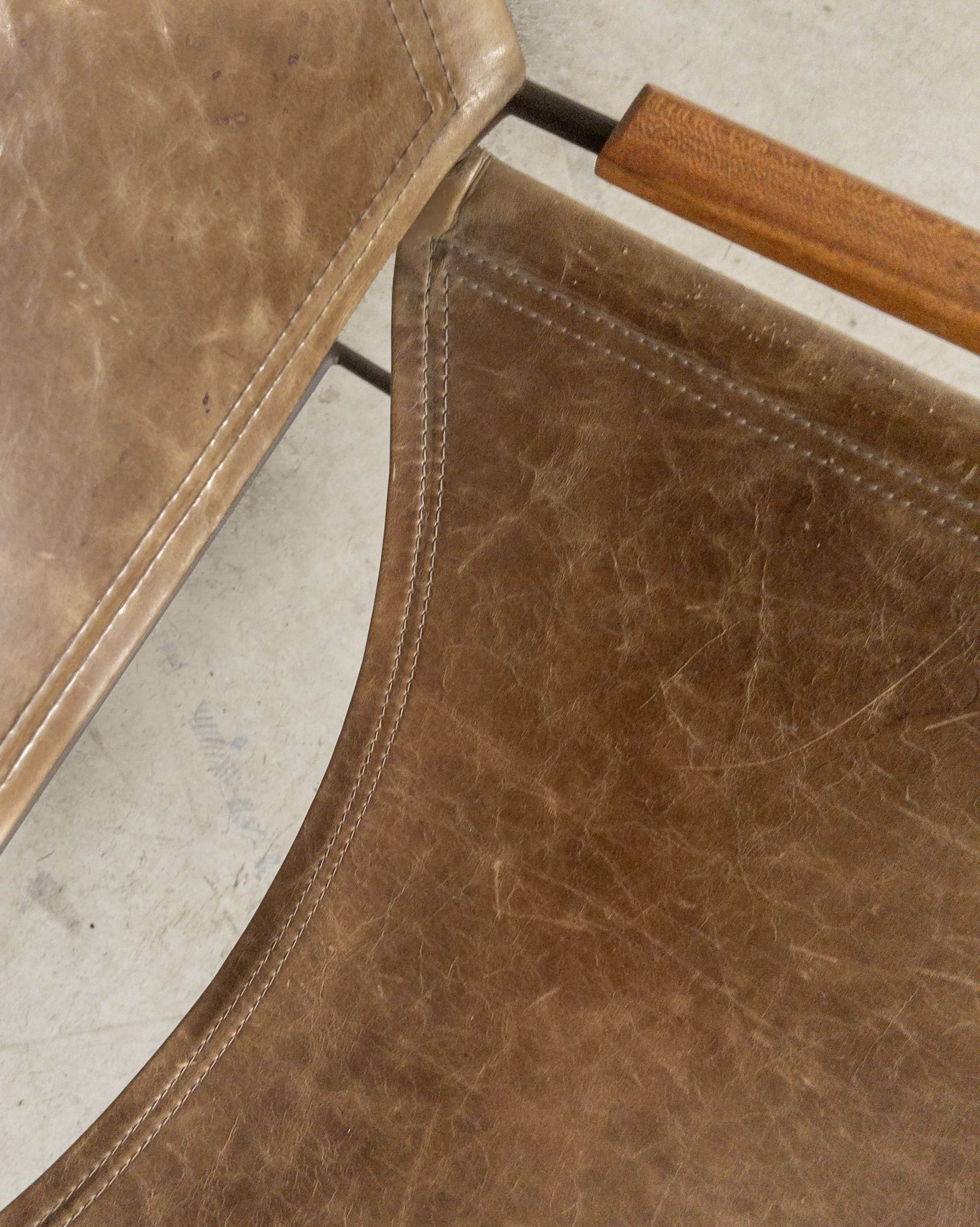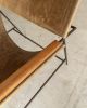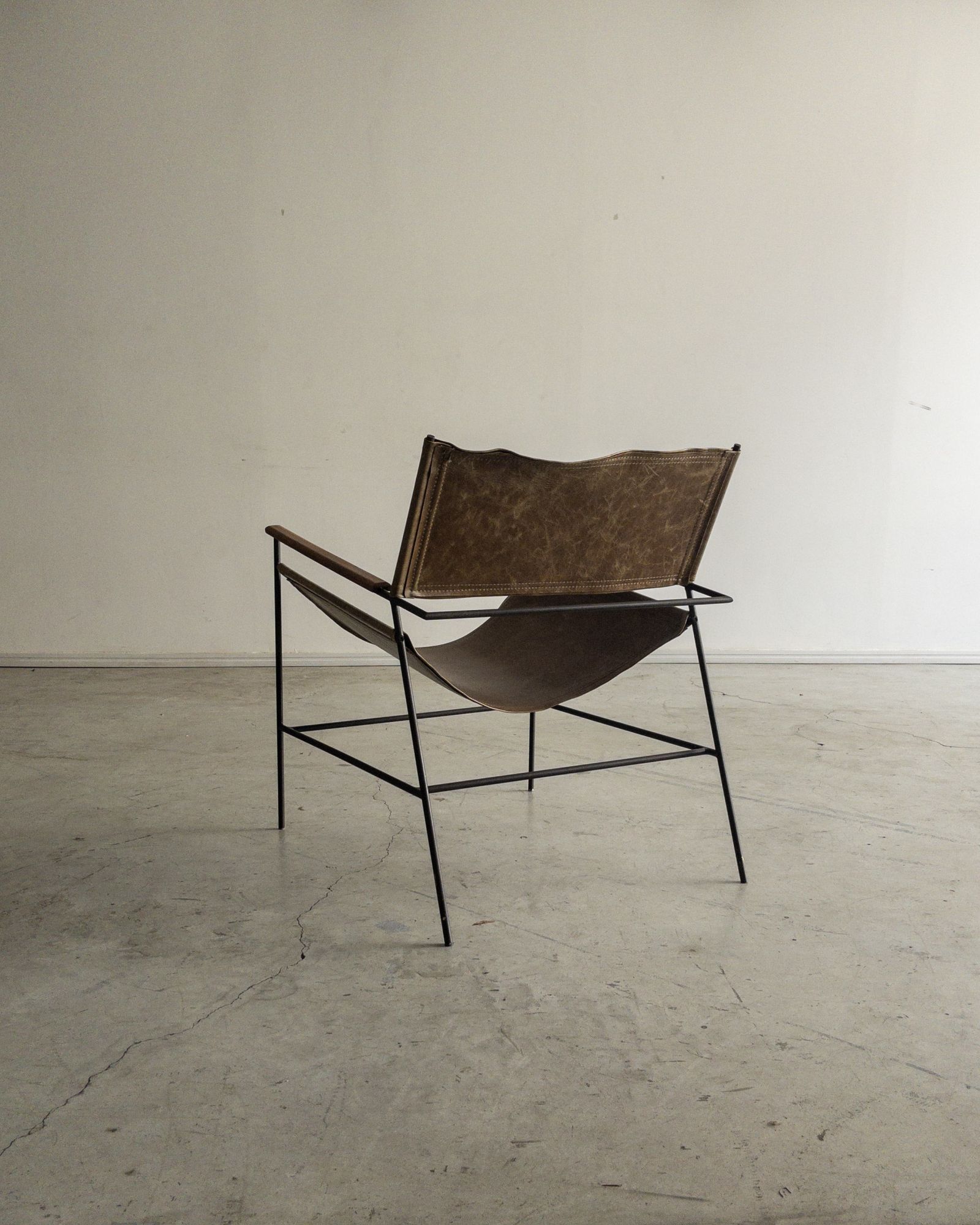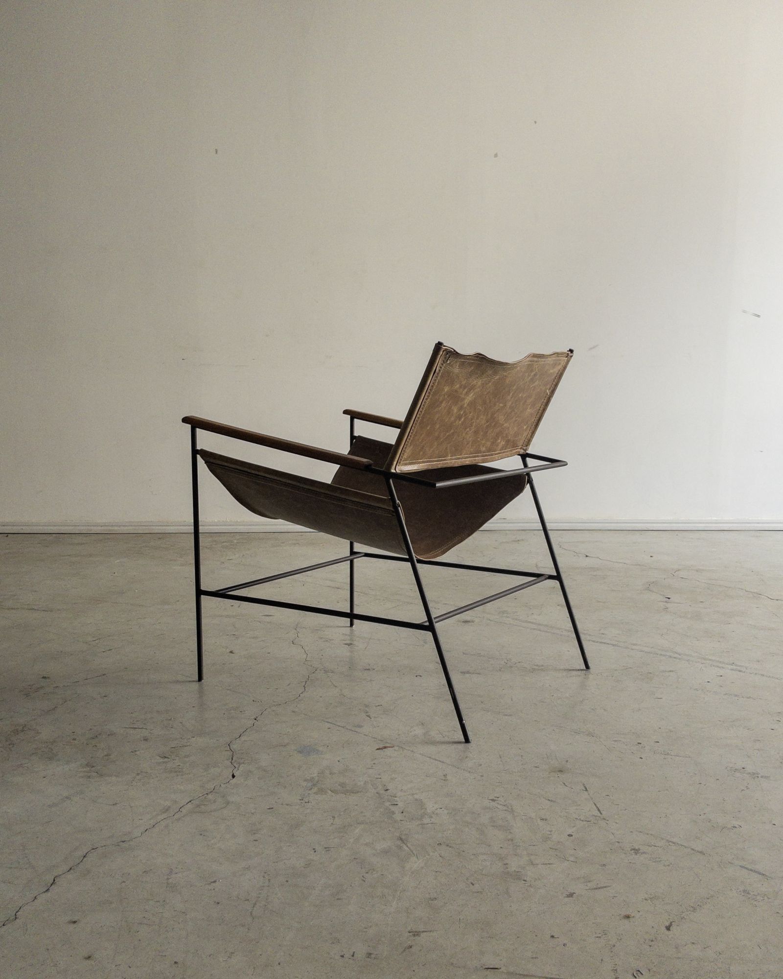 Estrutura em ferro com assento e encosto em couro soleta. As curvas suaves do couro tensionado dialogam com a estrutura metálica leve. Uma peça de presença marcante, matéria e proporções bem resolvidas.